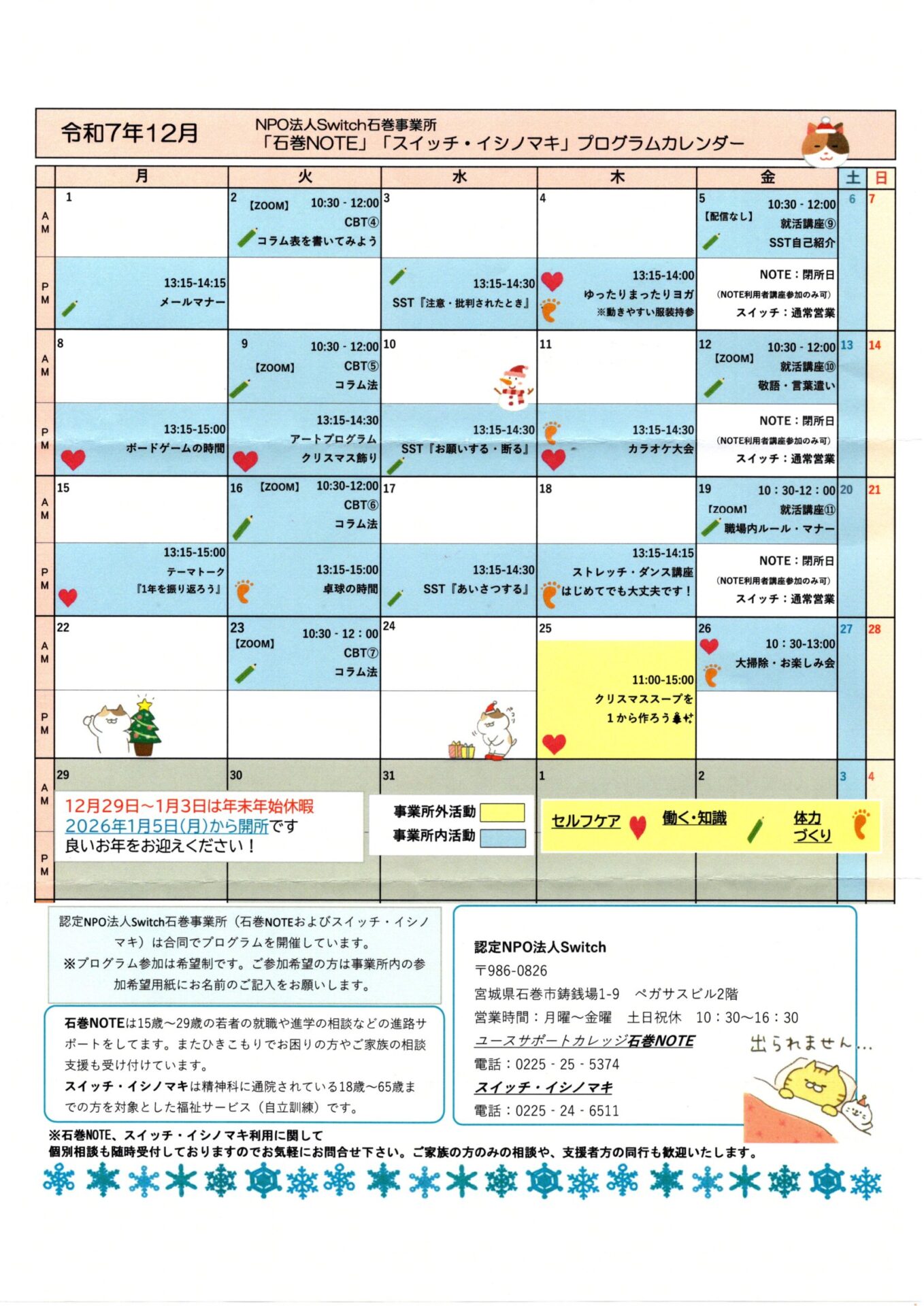 子育て相談窓口☆issyoへびた情報提供☆「石巻NOTE」「スイッチ・イシノマキ」からのおしらせ認定NPO法人Switch石巻事業所さんより、『12月の「石巻NOTE」「スイッチ・イシノマキ」プログラムカレンダー』が届きました♪ Switch石巻さんの紹介チラシも掲載しています! 石巻NOTE(若者の就職や進学サポート・ひきこもりの相談支援)、スイッチ・イシノマキ(精神科に通院されている方を対象にした福祉サービス)の合同でプログラムを開催しています。 ご家族の方の相談も随時受付中ですので、下記チラシをご覧になりお気軽にご参加・お問い合わせください(^^)