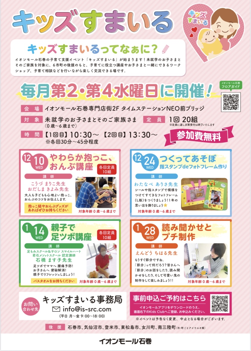 ✨✨✨✨✨✨✨✨✨✨✨ イオンモール石巻の子育て支援イベント 「キッズすまいる」 *未就学のお子さまとそのご家族を対象に、6市町の後援のもと、子育てに役立つ講座やお子さまと一緒にできるワークショップ、子育て相談などを行いながら楽しく交流できる場です。 第1部10:30〜 第2部13:30〜で毎月第2、第4水曜日にイオン2階イオンモール石巻専門店街2F タイムステーションNEO前ブリッジで開催しています🥰