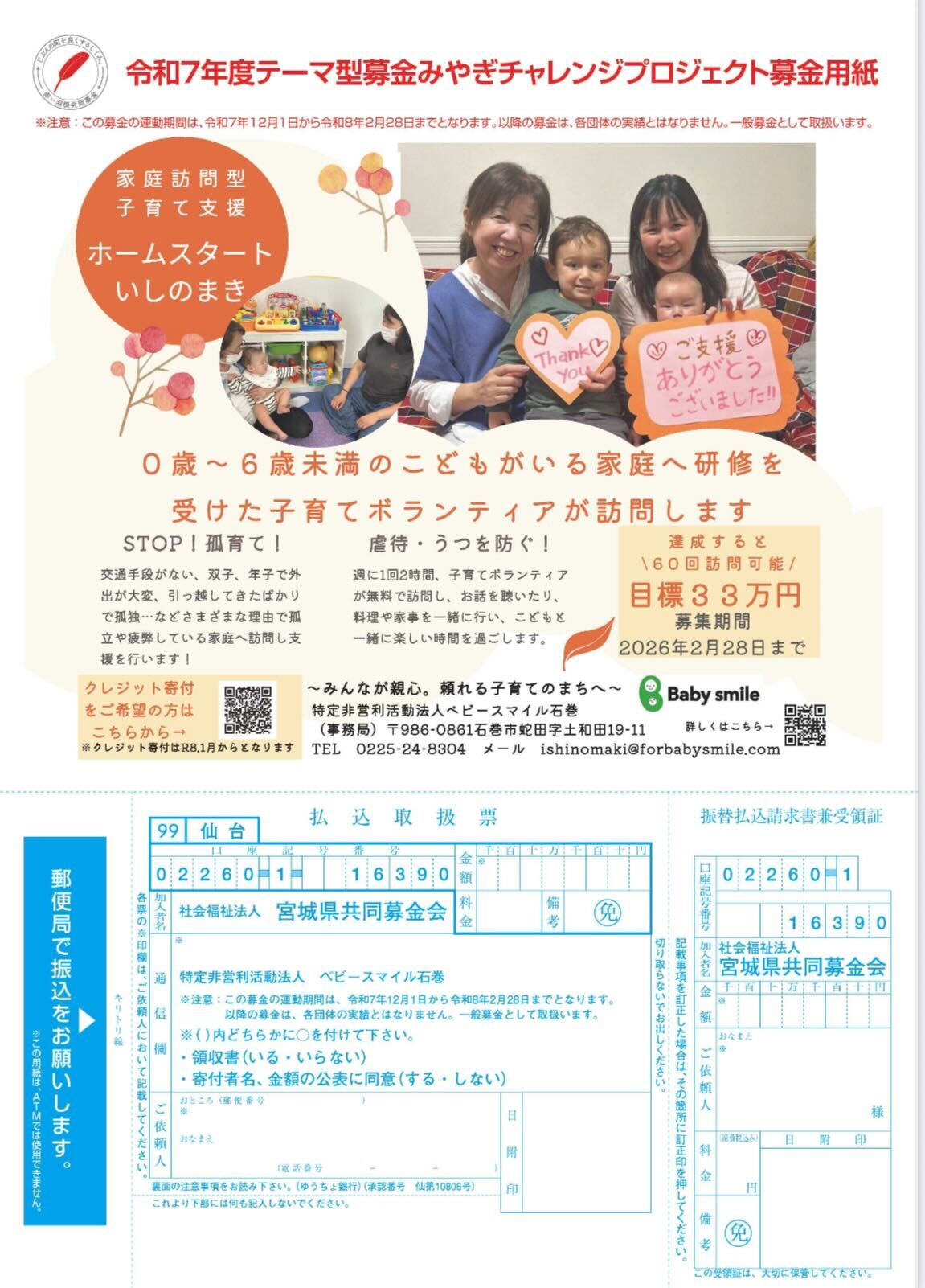 2025みやぎチャレンジプロジェクト始動!!今年もこの季節がやってきました! ベビースマイル石巻では、家庭訪問型子育て支援🏠ホームスタートいしのまき🏠の活動資金をこのチャレンジプロジェクトにてご寄付をいただき活動しております✨ 子育てに奮闘している家庭へ週に1回2時間、地域のボランティアが訪問し、遊び相手や話し相手、外出支援を行います! 今年で5年目となるこの事業は約80家庭、約360回の訪問を行ってきました!ホームスタートのおかげで子育てに自信が持てた!外出できる自身がついた!頑張りすぎなくていいんだ!などさまざまな効果が生まれています💗 大勢の方に利用していただきたいのですが、実は皆様からのご寄付で毎年訪問できる件数が決まります。。。😿 そこでお願いです!!! 1人でも多くのパパママ、そして子どもたちに支援が行き届くよう、皆さまからのご支援をよろしくお願いいたします🙇🙇🙇