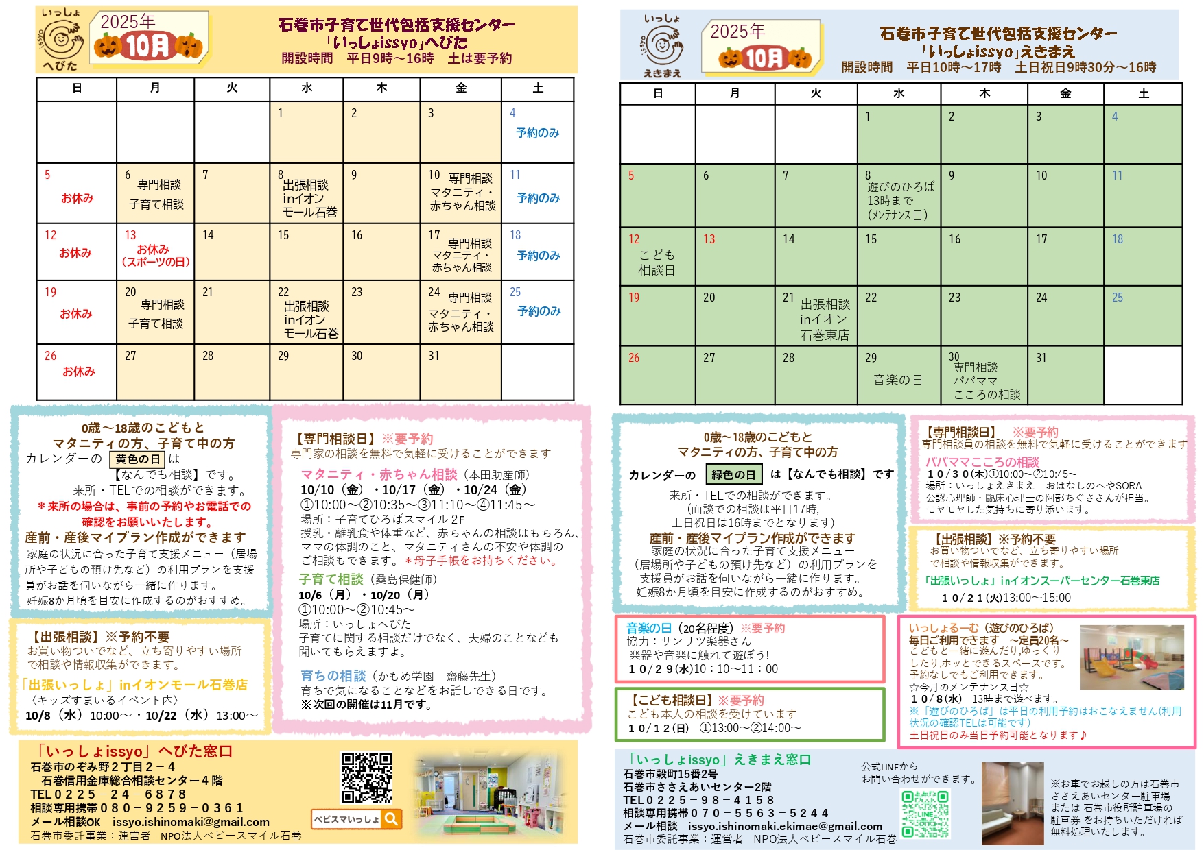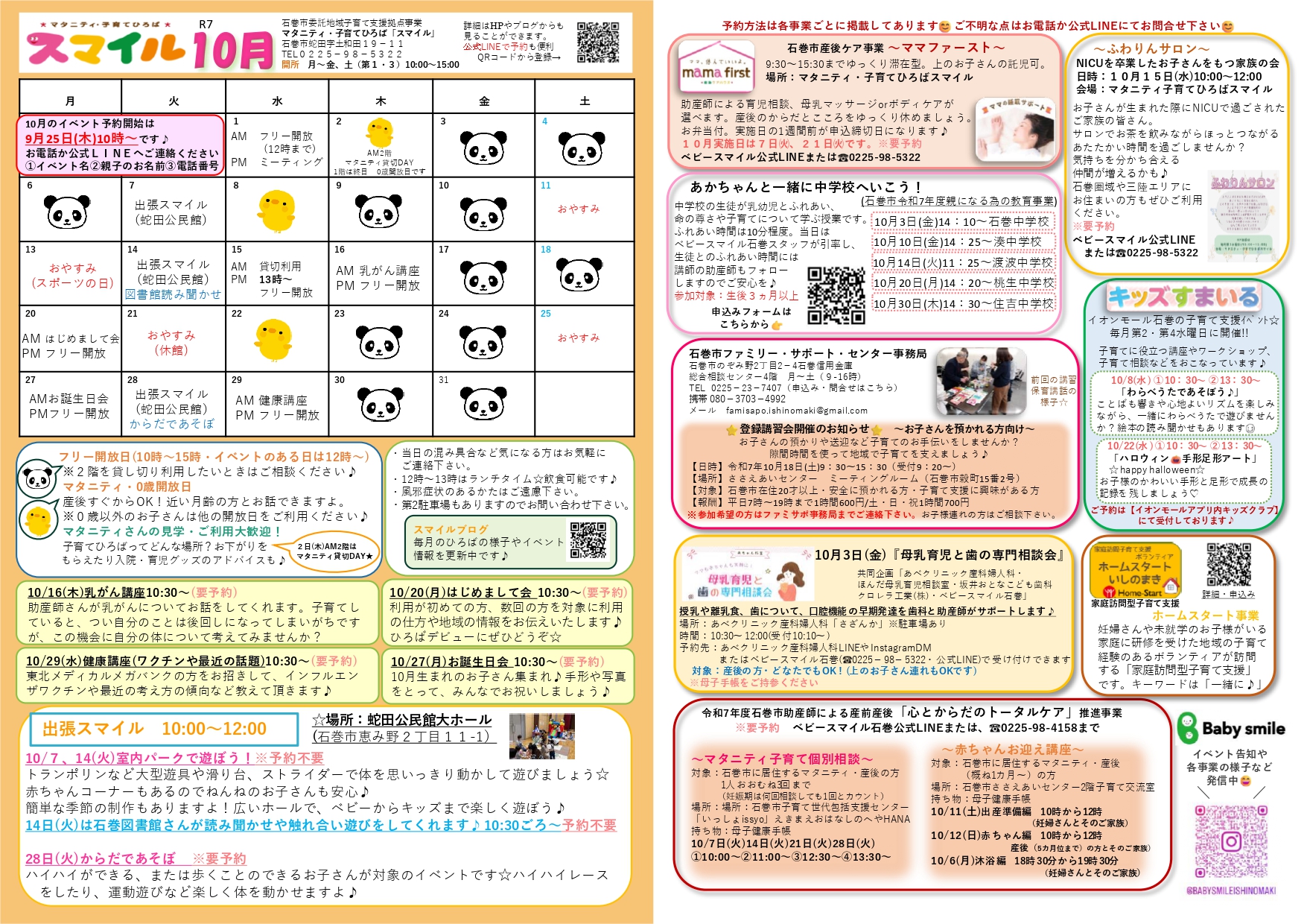 10月予定「スマイル」「いっしょ」「ファミリーサポート」こんにちは🌈ベビースマイル石巻です😊 ほっとできる居場所、情報・相談窓口、困ったときの預かりあい、親子のふれあいや育ちを応援するイベント、産後のママのケアなどなど🍀 子育てが孤立しない、あたたかい居場所づくり、つながりを保っていきたいと思っています😊 どんな活動をしているのか通信をご覧になってみてくださいね🐣