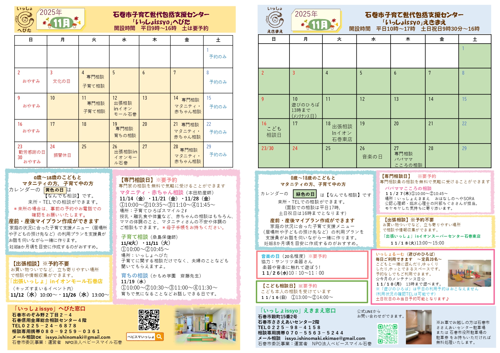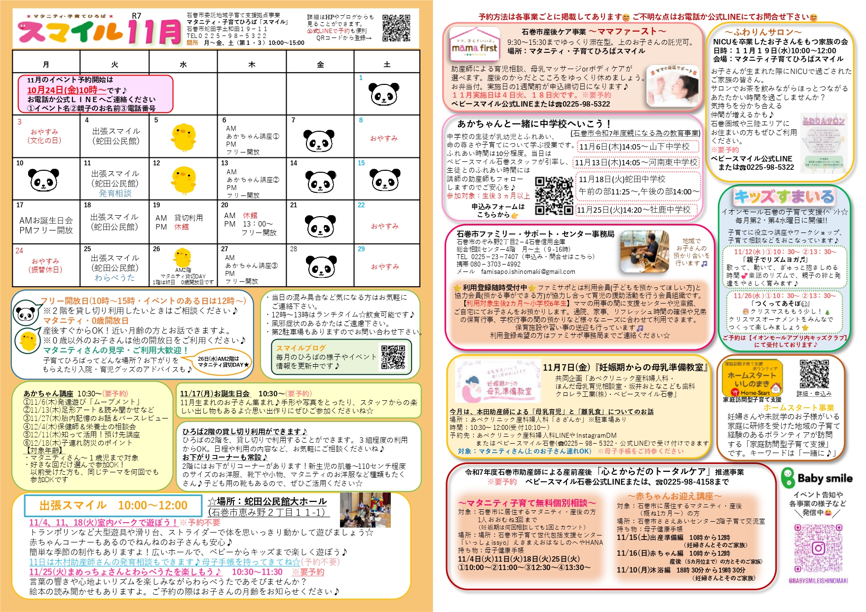 11月予定「スマイル」「いっしょ」「ファミリーサポート」こんにちは🌈ベビースマイル石巻です😊 ほっとできる居場所、情報・相談窓口、困ったときの預かりあい、親子のふれあいや育ちを応援するイベント、産後のママのケアなどなど🍀 子育てが孤立しない、あたたかい居場所づくり、つながりを保っていきたいと思っています😊 どんな活動をしているのか通信をご覧になってみてくださいね🐣
