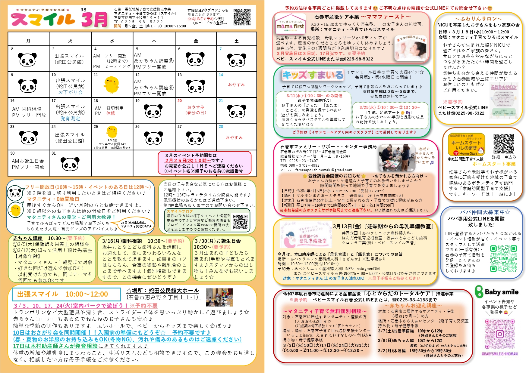 R8.3月予定「スマイル」「いっしょ」「ファミリーサポート」こんにちは🌈ベビースマイル石巻です😊 ほっとできる居場所、情報・相談窓口、困ったときの預かりあい、親子のふれあいや育ちを応援するイベント、産後のママのケアなどなど🍀 子育てが孤立しない、あたたかい居場所づくり、つながりを保っていきたいと思っています😊 どんな活動をしているのか通信をご覧になってみてくださいね🐣