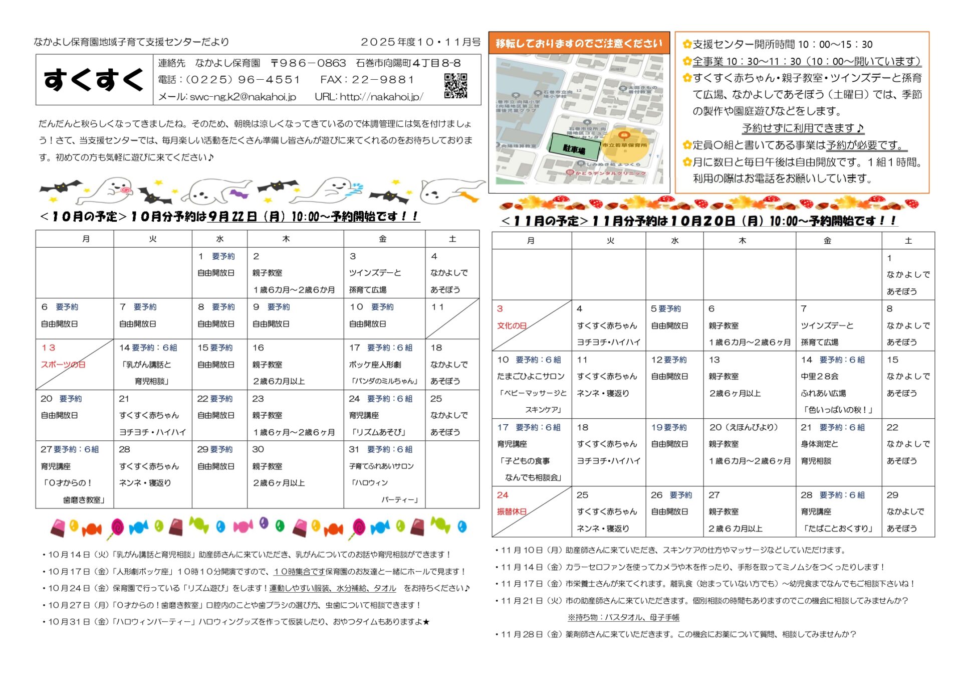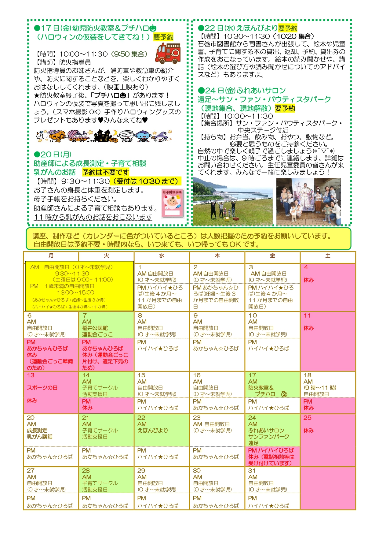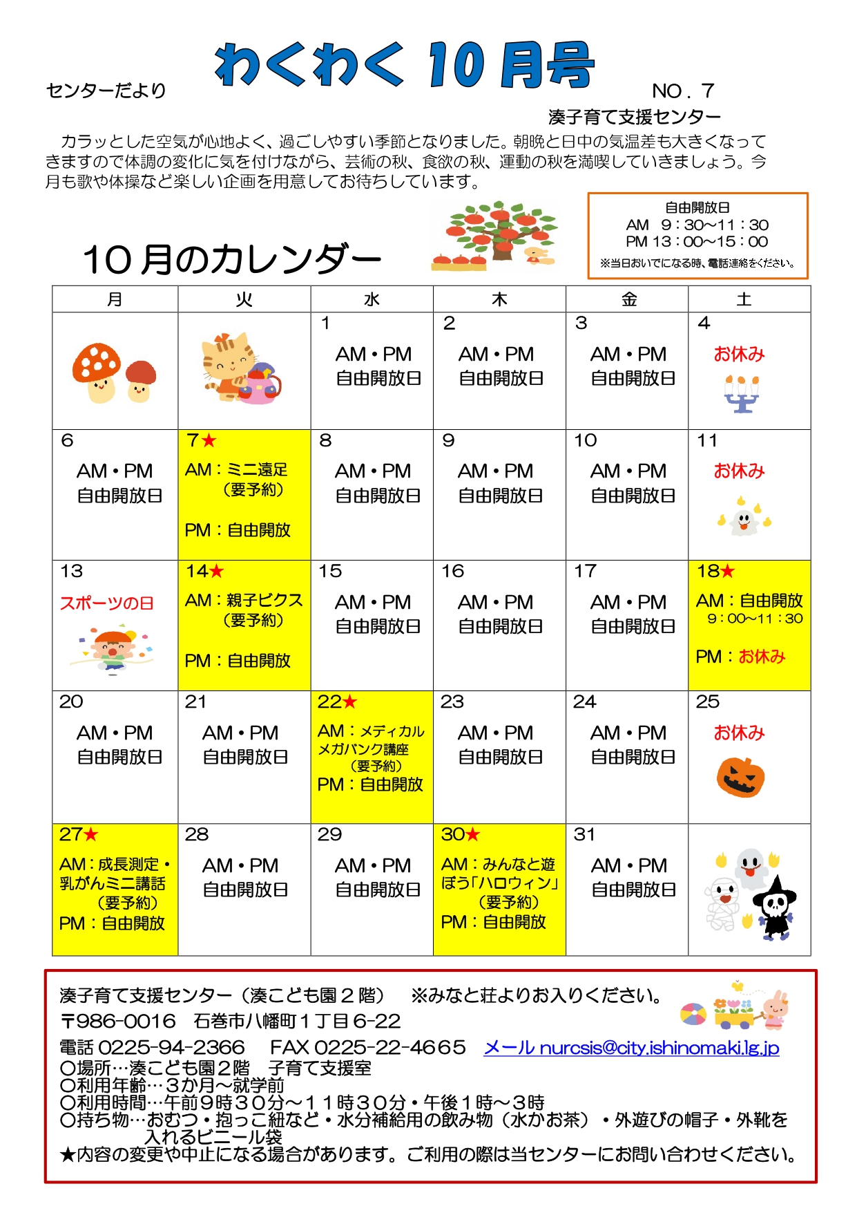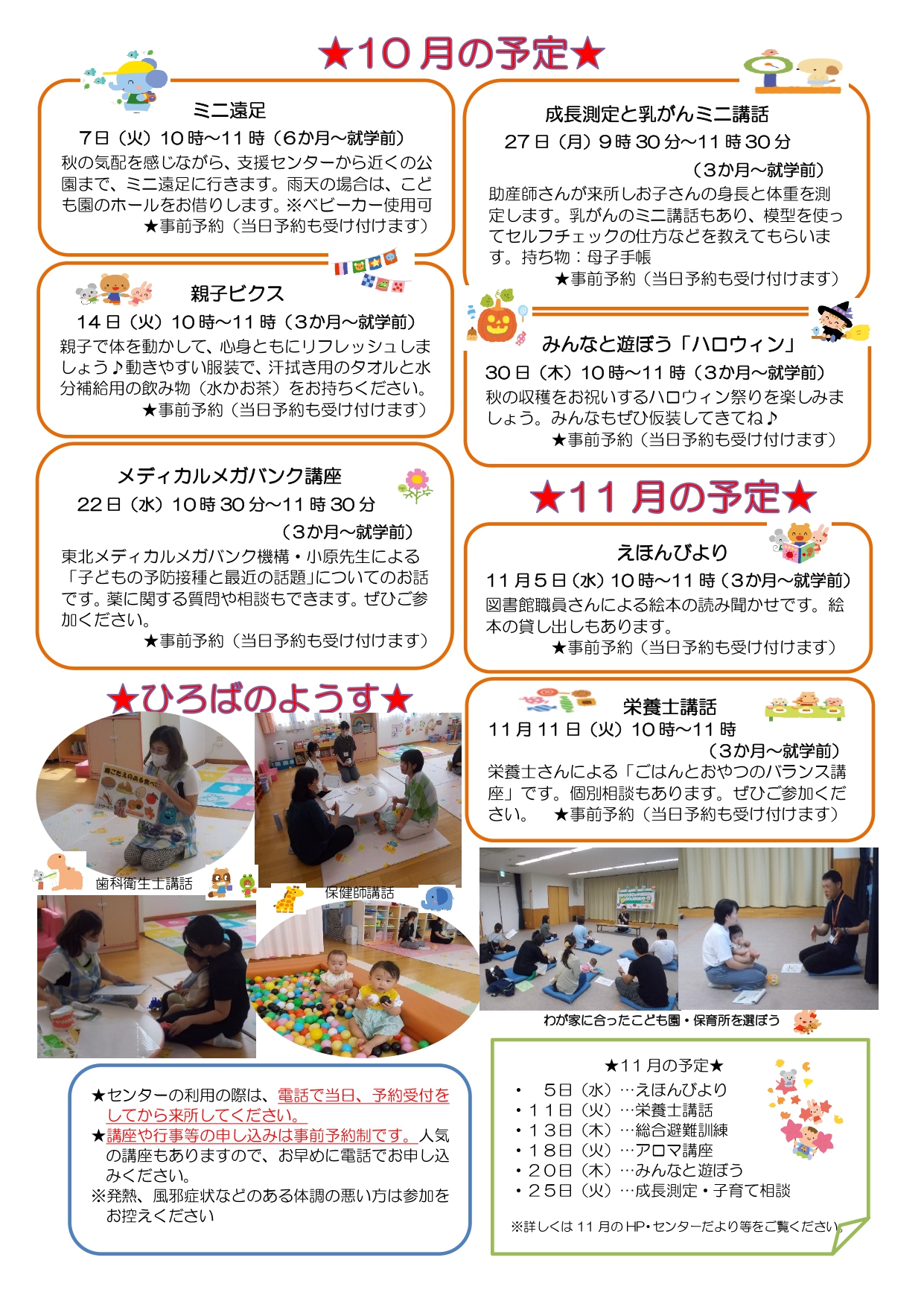 子育て相談窓口☆issyoへびた情報提供☆「子育て支援センター10月カレンダー(にじいろ・なかよし・釜・湊・渡波・牡鹿)」のおしらせ子育て支援センターの10月のカレンダーが届いています♪ たのしいイベントが盛りだくさんです!ぜひご参加下さいね。 ★地域子育て支援拠点「にじいろひろば」★ ★なかよし保育園地域子育て支援センター★ ★釜子育て支援センター「あおぞら」★