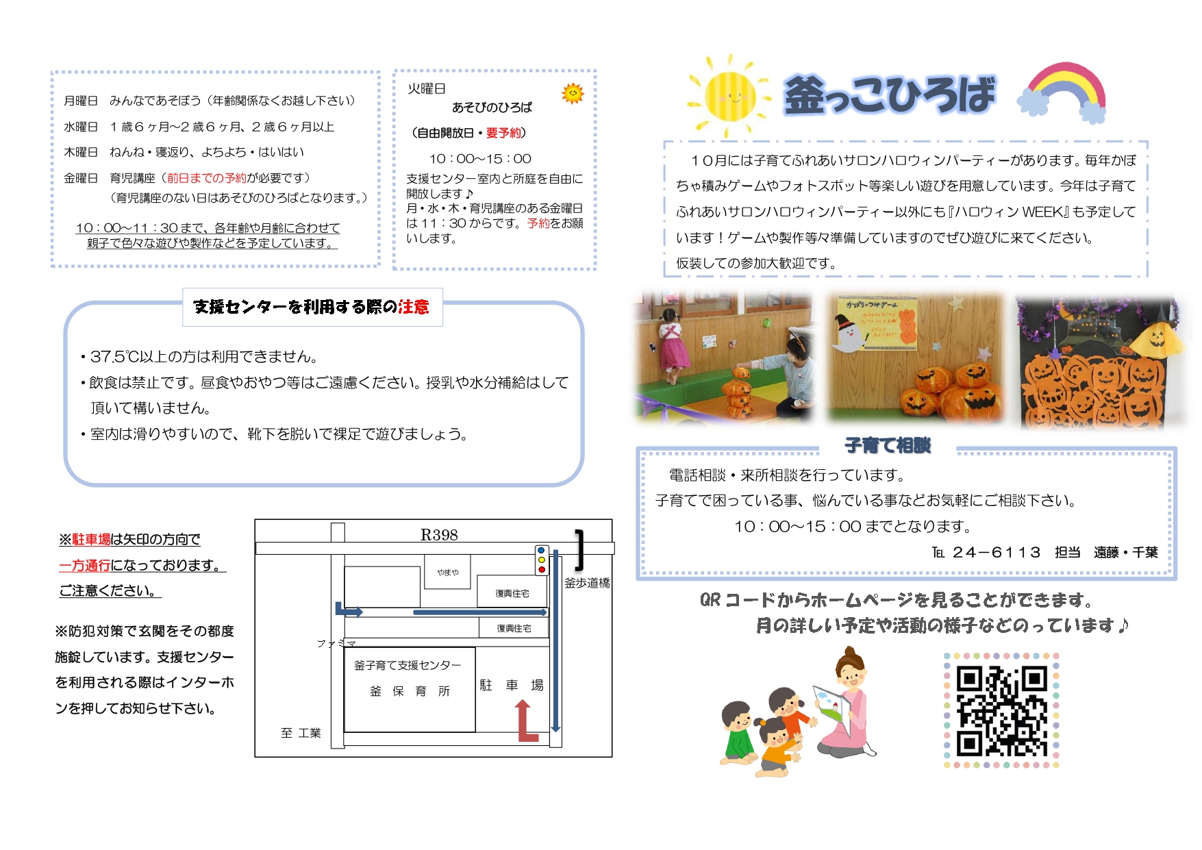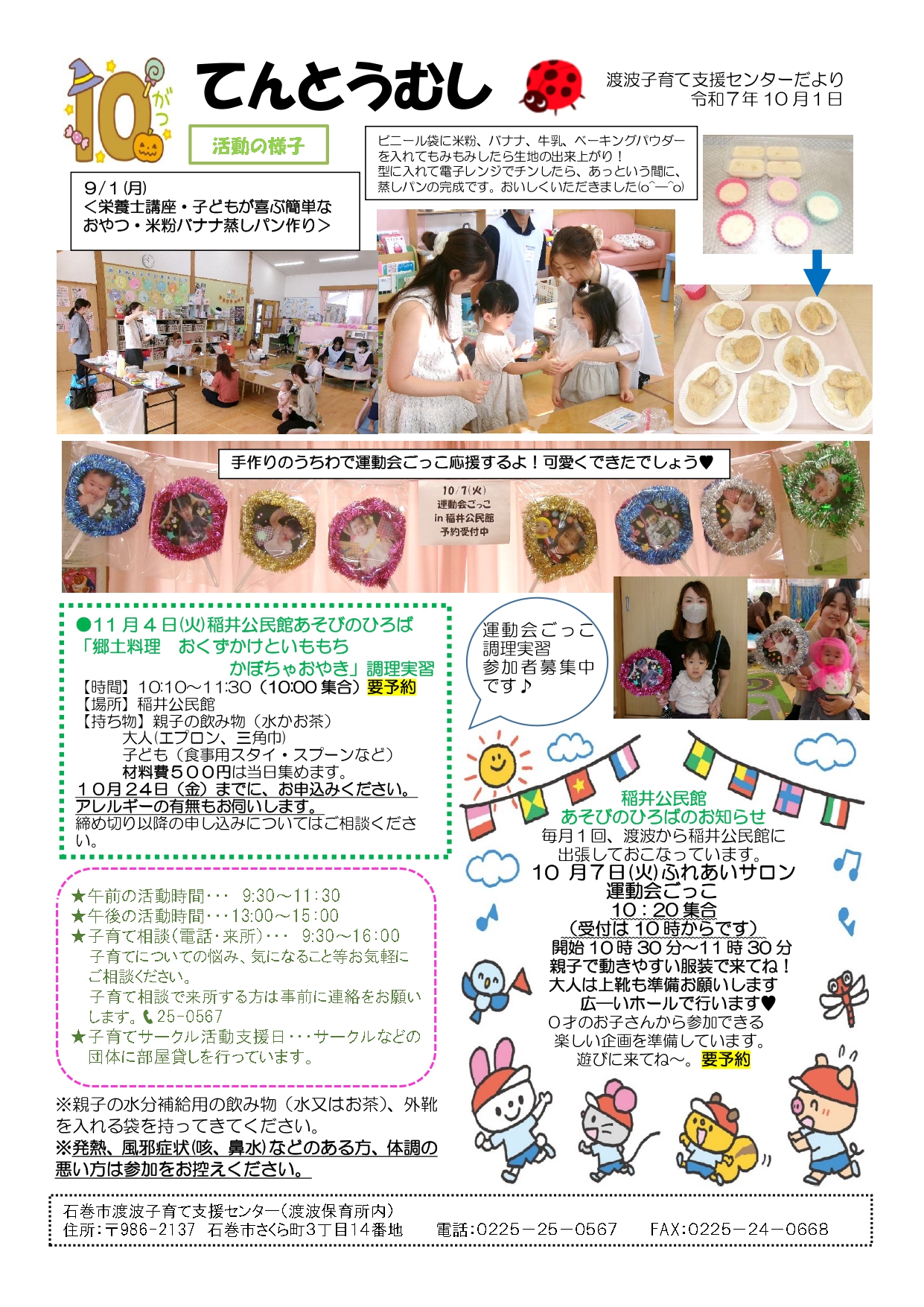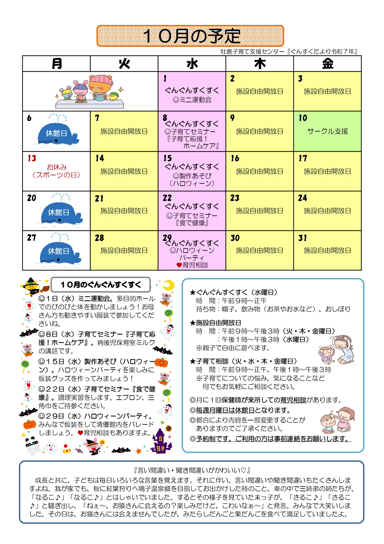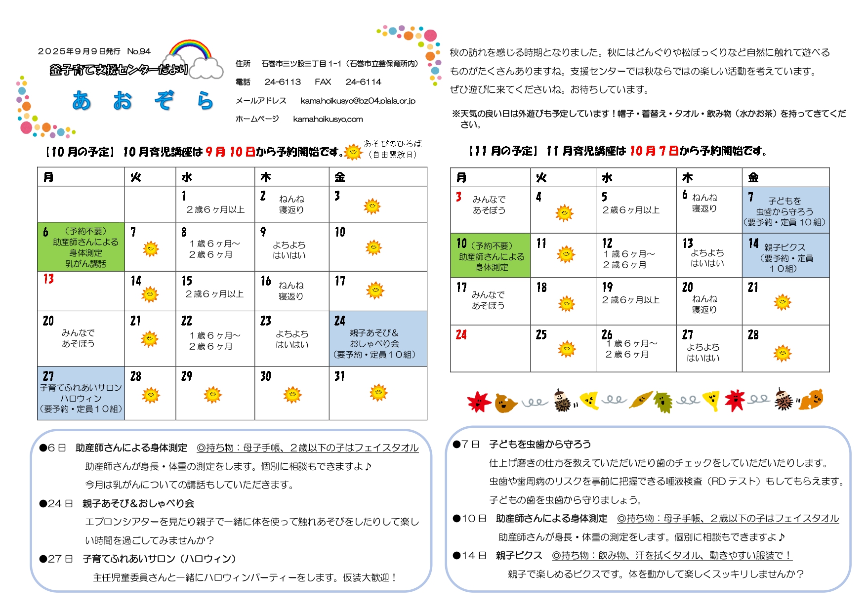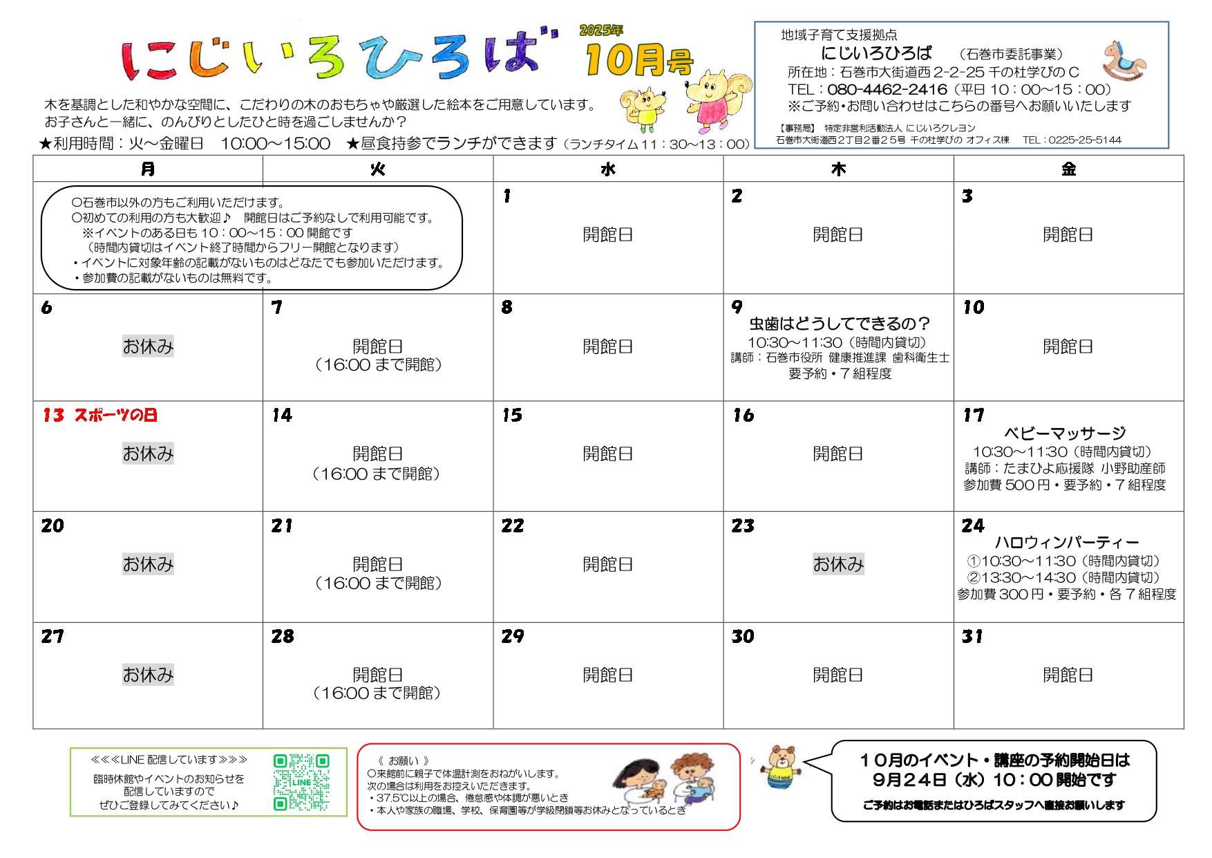 子育て相談窓口☆issyoへびた情報提供☆「子育て支援センター10月カレンダー(にじいろ・なかよし・釜・湊・渡波・牡鹿)」のおしらせ子育て支援センターの10月のカレンダーが届いています♪ たのしいイベントが盛りだくさんです!ぜひご参加下さいね。 ★地域子育て支援拠点「にじいろひろば」★ ★なかよし保育園地域子育て支援センター★ ★釜子育て支援センター「あおぞら」★