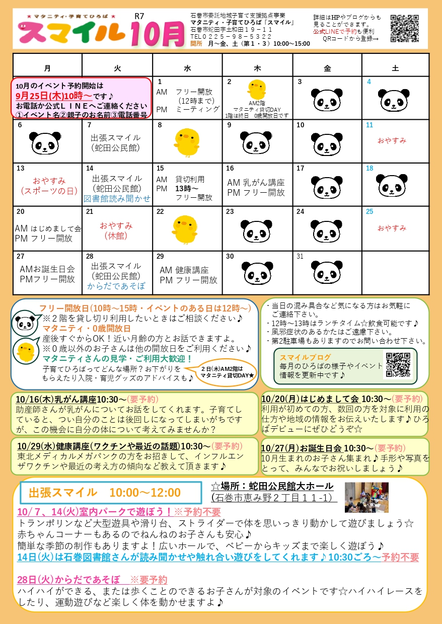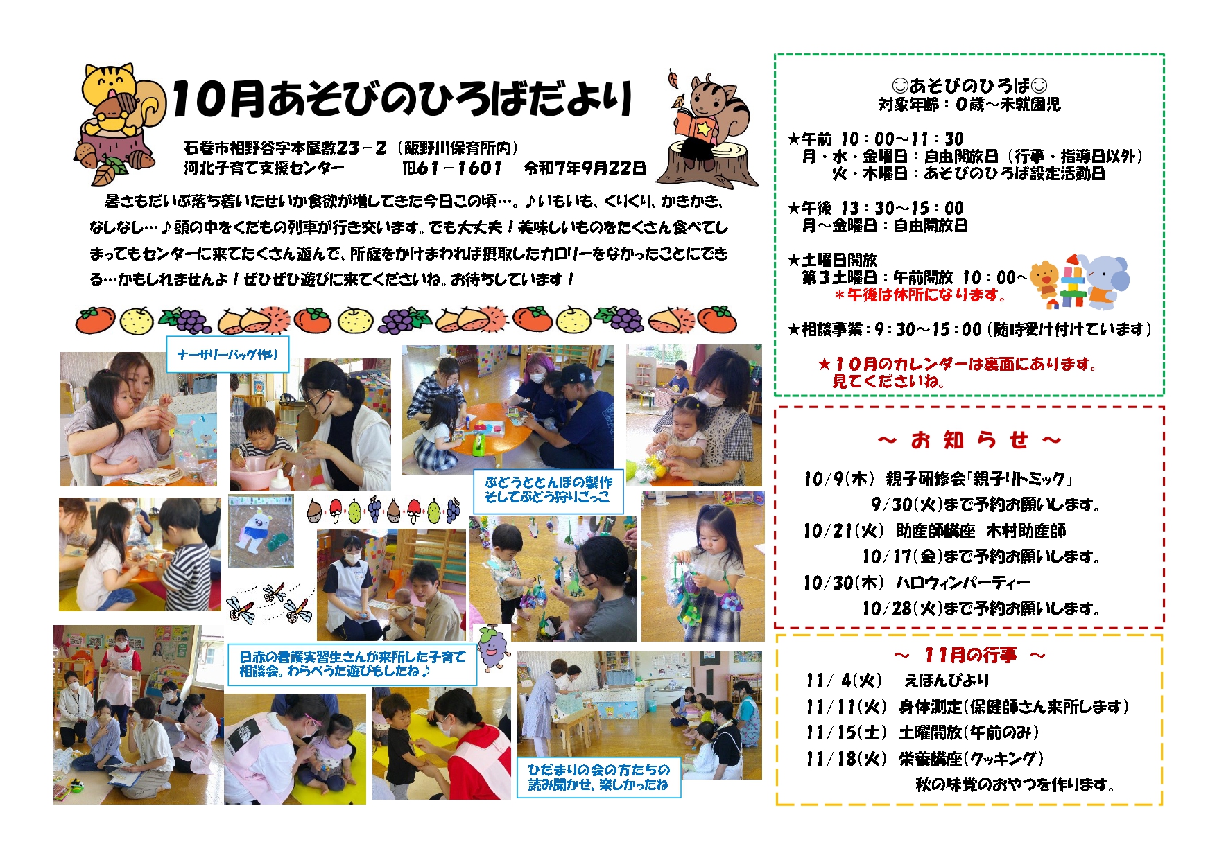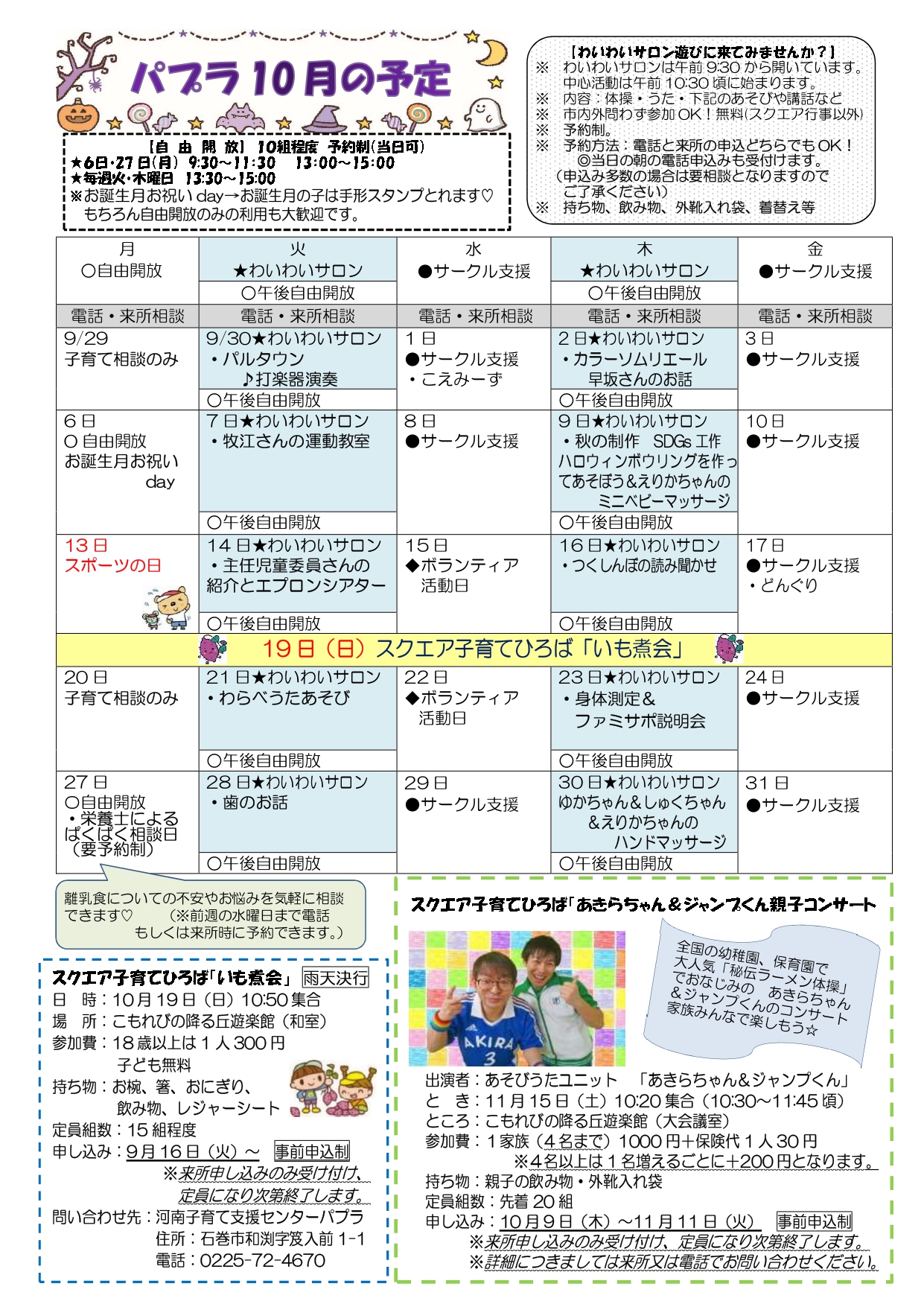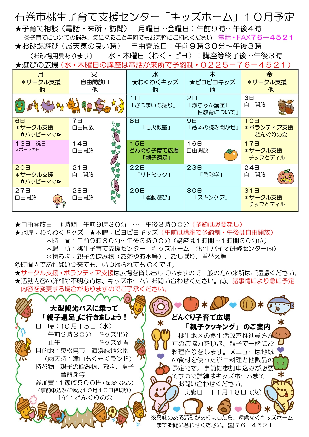 子育て相談窓口☆issyoへびた情報提供☆「子育て支援センター10月カレンダー(スマイル・河南・桃生・河北・北上・雄勝)」のおしらせ子育てひろば・子育て支援センターの10月のカレンダーが届きました♪ たのしいイベントも盛りだくさんです!ぜひご参加くださいね。 ★子育てひろばスマイル★ ★河南子育て支援センター「パプラ」★ ★桃生子育て支援センター「キッズホーム」★