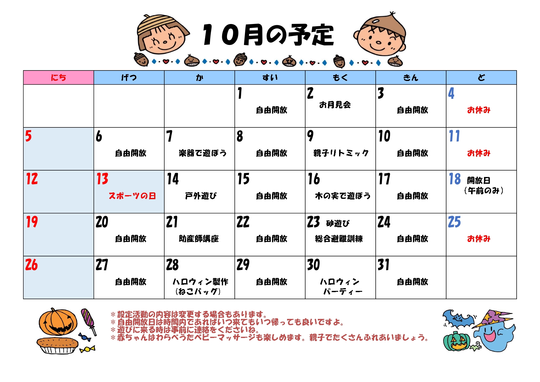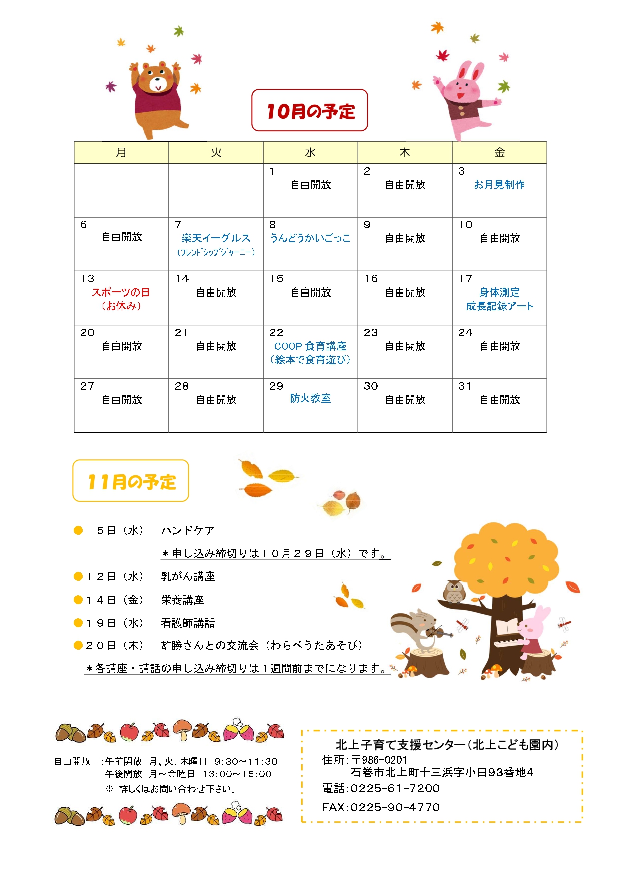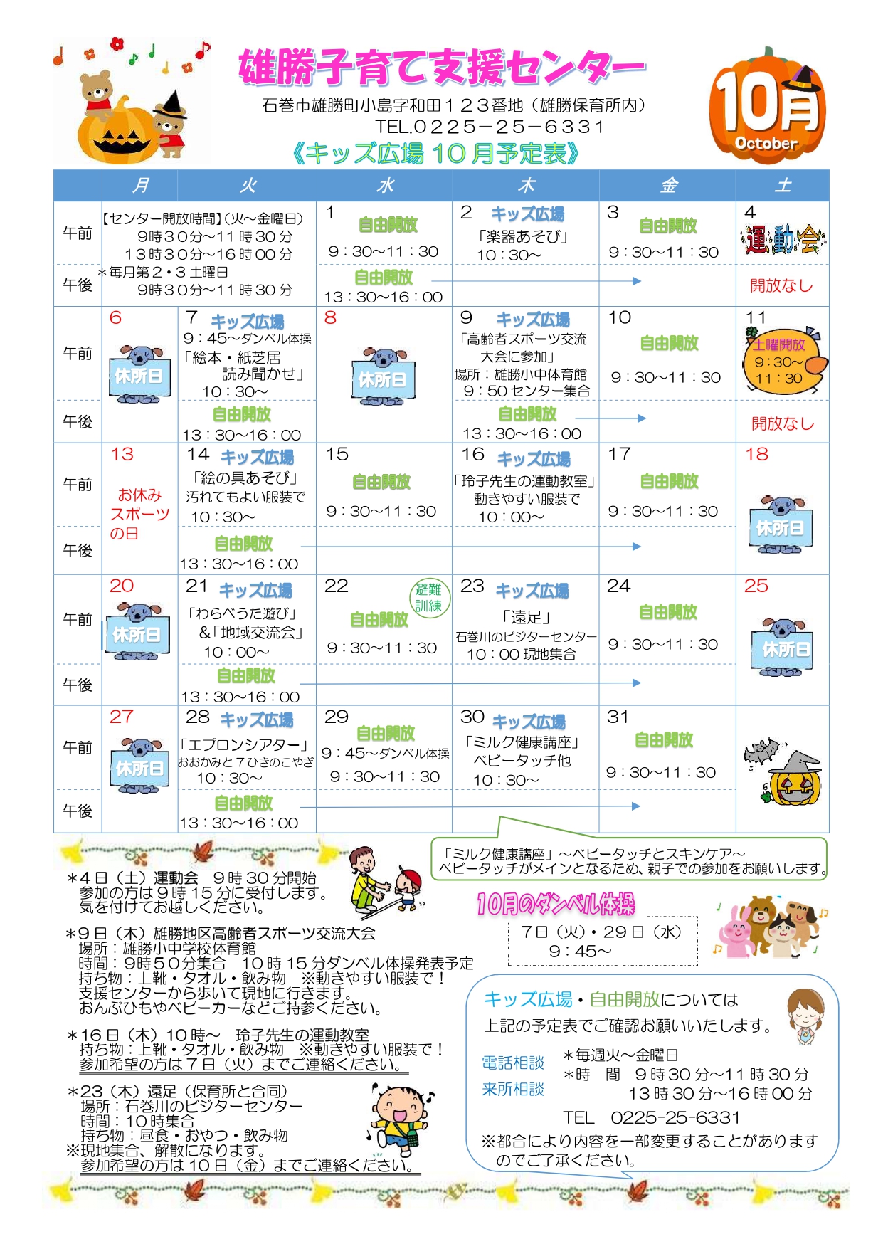 子育て相談窓口☆issyoへびた情報提供☆「子育て支援センター10月カレンダー(スマイル・河南・桃生・河北・北上・雄勝)」のおしらせ子育てひろば・子育て支援センターの10月のカレンダーが届きました♪ たのしいイベントも盛りだくさんです!ぜひご参加くださいね。 ★子育てひろばスマイル★ ★河南子育て支援センター「パプラ」★ ★桃生子育て支援センター「キッズホーム」★