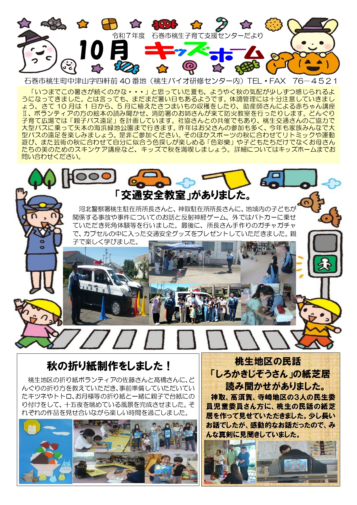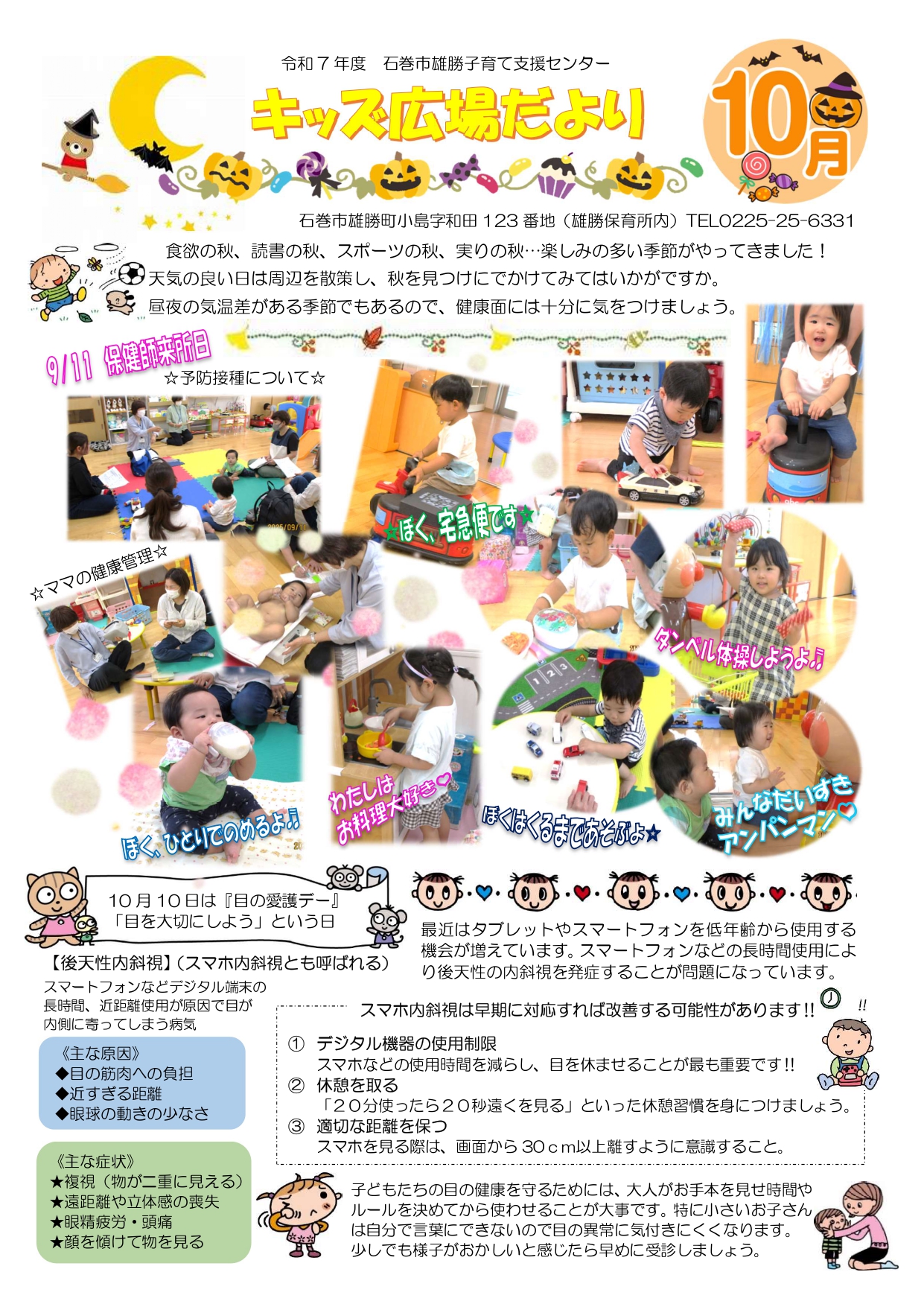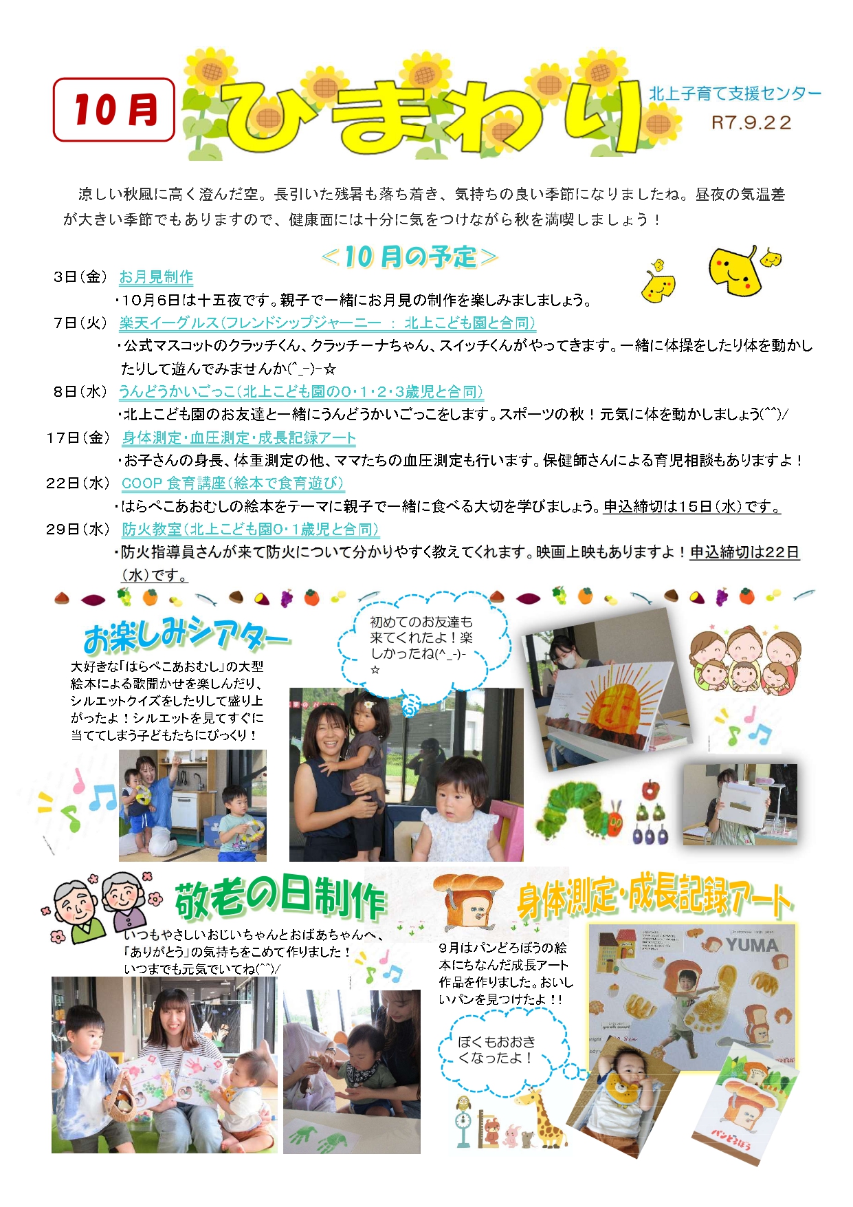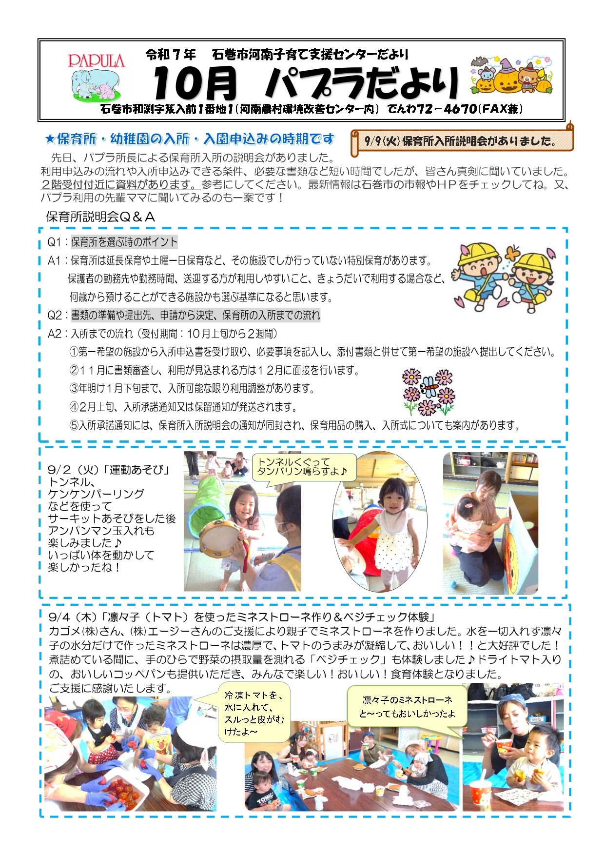 子育て相談窓口☆issyoへびた情報提供☆「子育て支援センター10月カレンダー(スマイル・河南・桃生・河北・北上・雄勝)」のおしらせ子育てひろば・子育て支援センターの10月のカレンダーが届きました♪ たのしいイベントも盛りだくさんです!ぜひご参加くださいね。 ★子育てひろばスマイル★ ★河南子育て支援センター「パプラ」★ ★桃生子育て支援センター「キッズホーム」★
