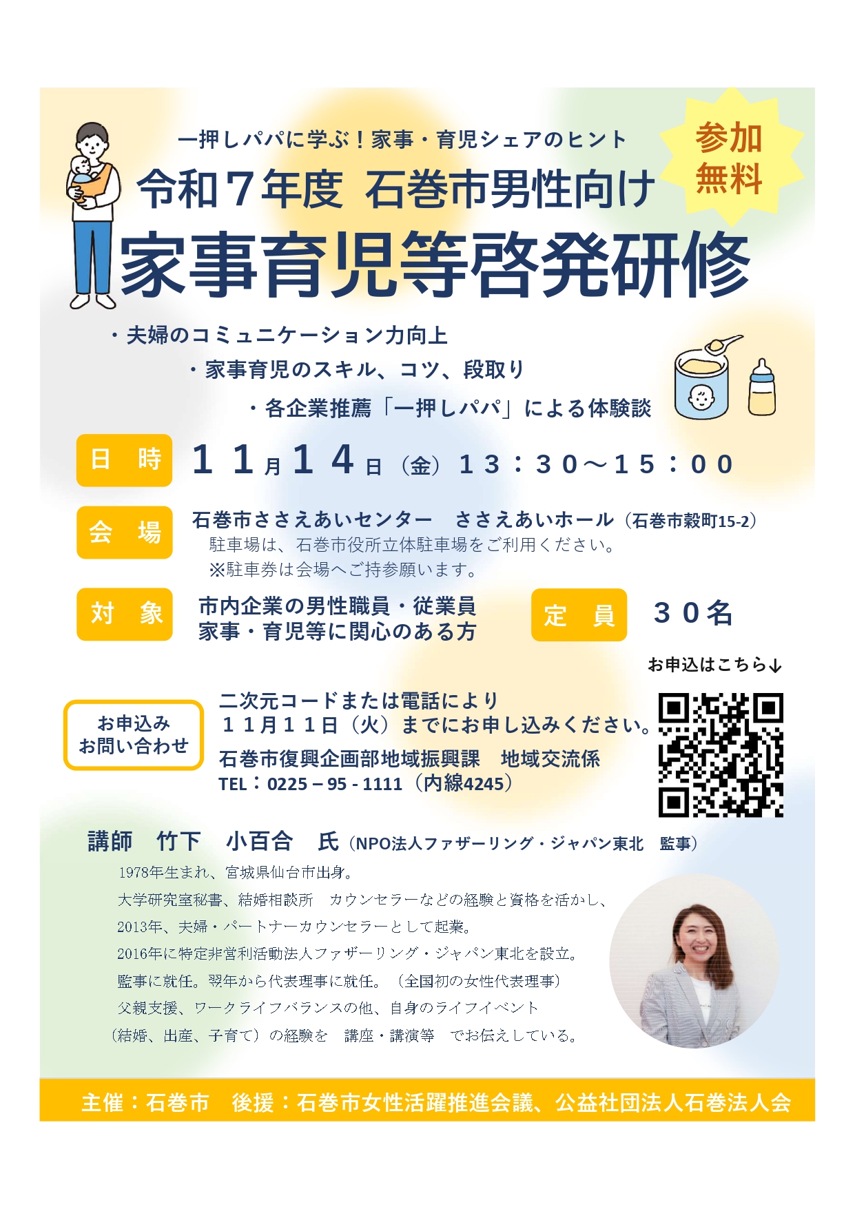 子育て相談窓口☆issyoへびた情報提供☆「令和7年度 石巻市男性向け 家事育児等啓発研修」のおしらせ石巻市地域振興課より、『一押しパパに学ぶ!家事・育児シェアのヒント 令和7年度 石巻市男性向け 家事育児等啓発研修』のお知らせが届きました! 家事・育児のスキルアップ・夫婦のコミュニケーション力向上のヒントが学べるチャンス☆「一押しパパ」の体験談も、子育てや家庭円満のヒントが聞けそうですね♪家事・育児に興味のある方、ぜひこの機会にご参加下さい!!