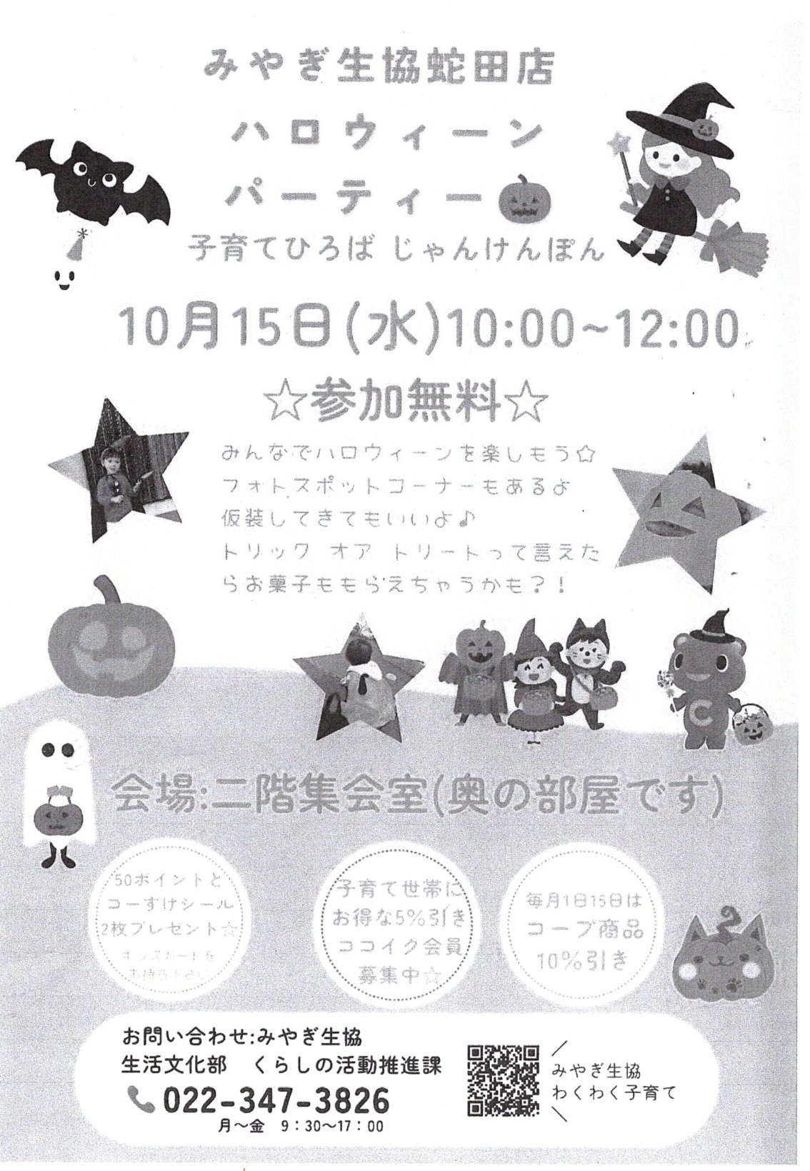 子育て相談窓口☆issyoへびた情報提供☆「みやぎ生協蛇田店 ハロウィーンパーティー」のおしらせみやぎ生協蛇田店より、『ハロウィーンパーティー 子育てひろばじゃんけんぽん』のお知らせがとできました★ 日時:10月15日(水)10:00~12:00 場所:みやぎ生協蛇田店 二階集会室(奥の部屋) 子ども達が大好きなハロウィーンイベント(*^_^*)フォトスポットコーナーもあるので、仮装をしてくるとより楽しめそうですね! 詳細は、下記チラシをご覧下さい♪ |
