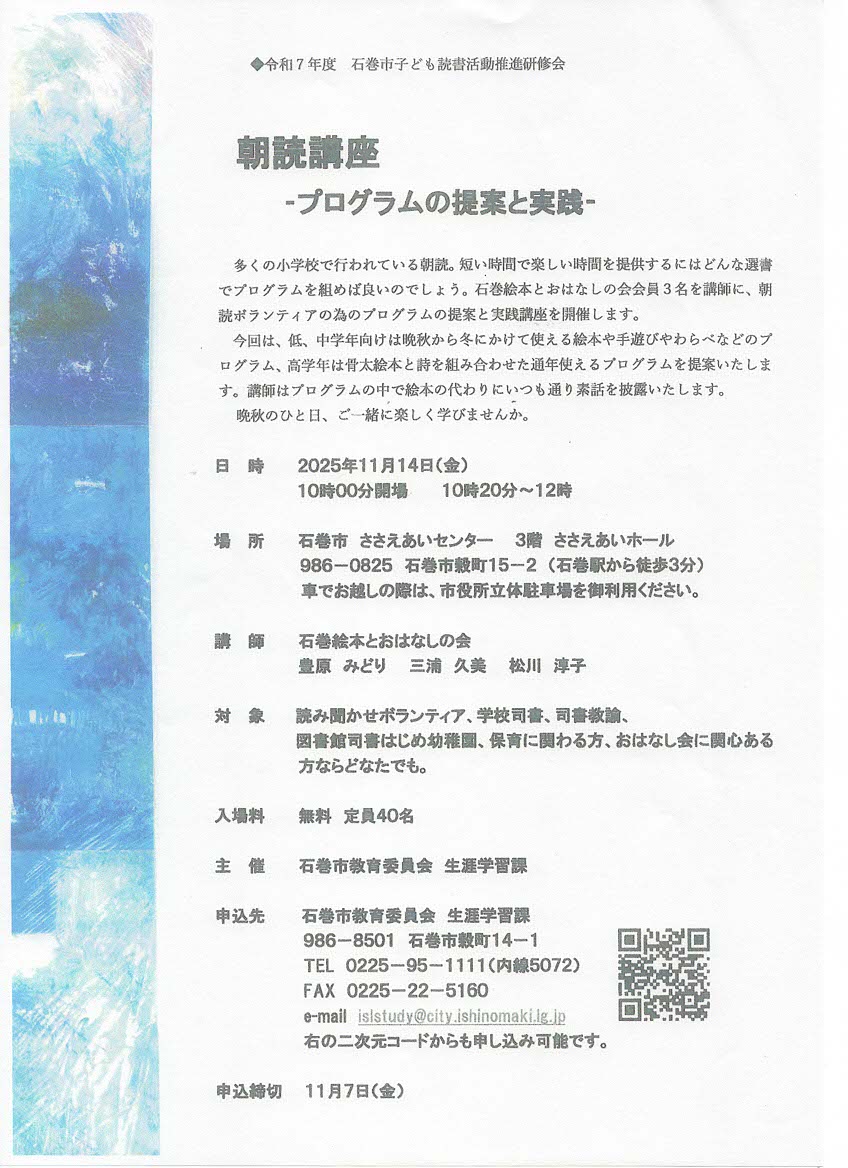 子育て相談窓口☆issyoへびた情報提供☆「朝読講座ープログラムの提案と実践ー」のおしらせ石巻市教育委員会 生涯学習課 より「朝読講座」のお知らせです。 石巻絵本とおはなしの会会員を講師に、朝読ボランティアの為の提案と実践講座を開催します。 低、中学年向けと、高学年向けに分け、プログラムを提案いたします。 いっしょに楽しく学びませんか♪ 詳細は下記チラシをご覧ください。