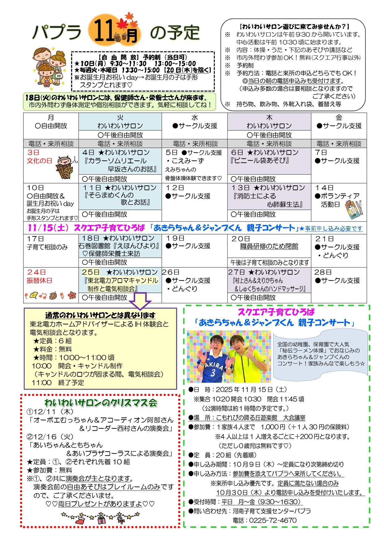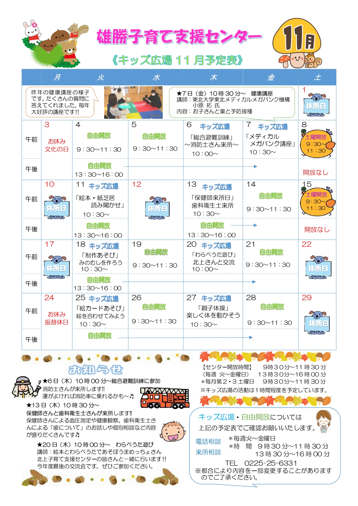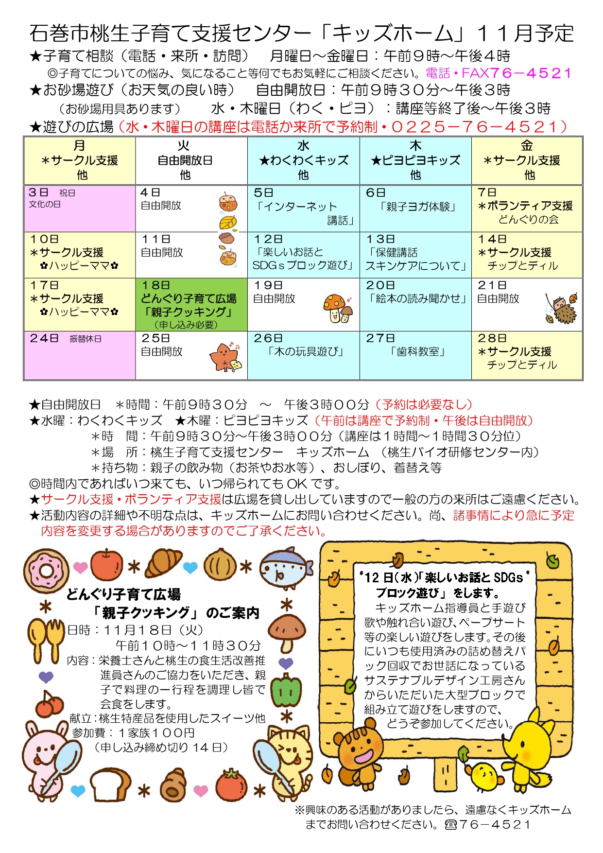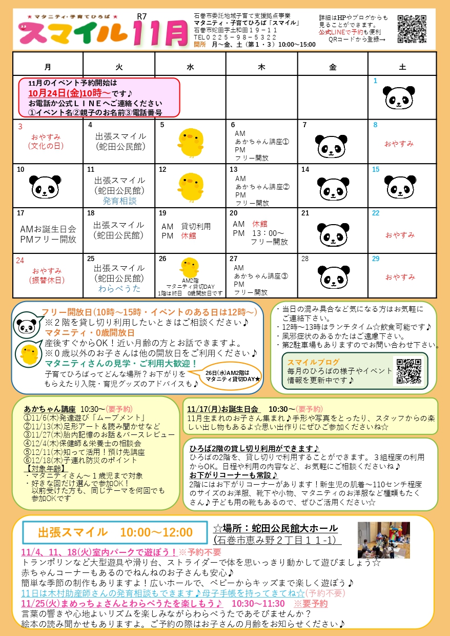 子育て相談窓口☆issyoへびた情報提供☆「子育て支援センター11月カレンダー(スマイル・河南・桃生・河北・北上・雄勝)」のおしらせ子育てひろば・子育て支援センターの11月のカレンダーが届きました♪ たのしいイベントも盛りだくさんです!ぜひご参加くださいね。 ★子育てひろばスマイル★