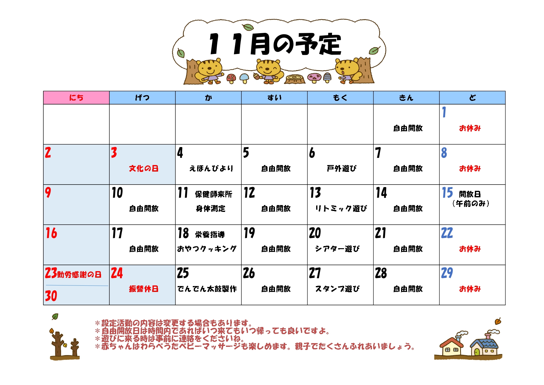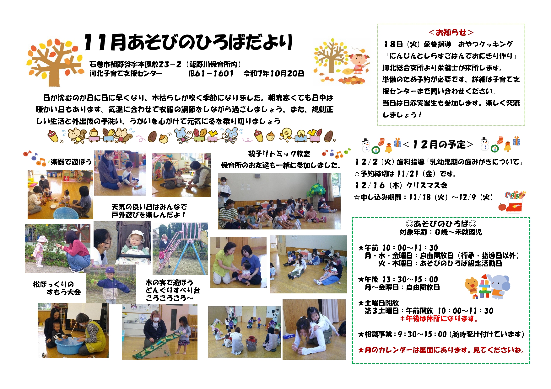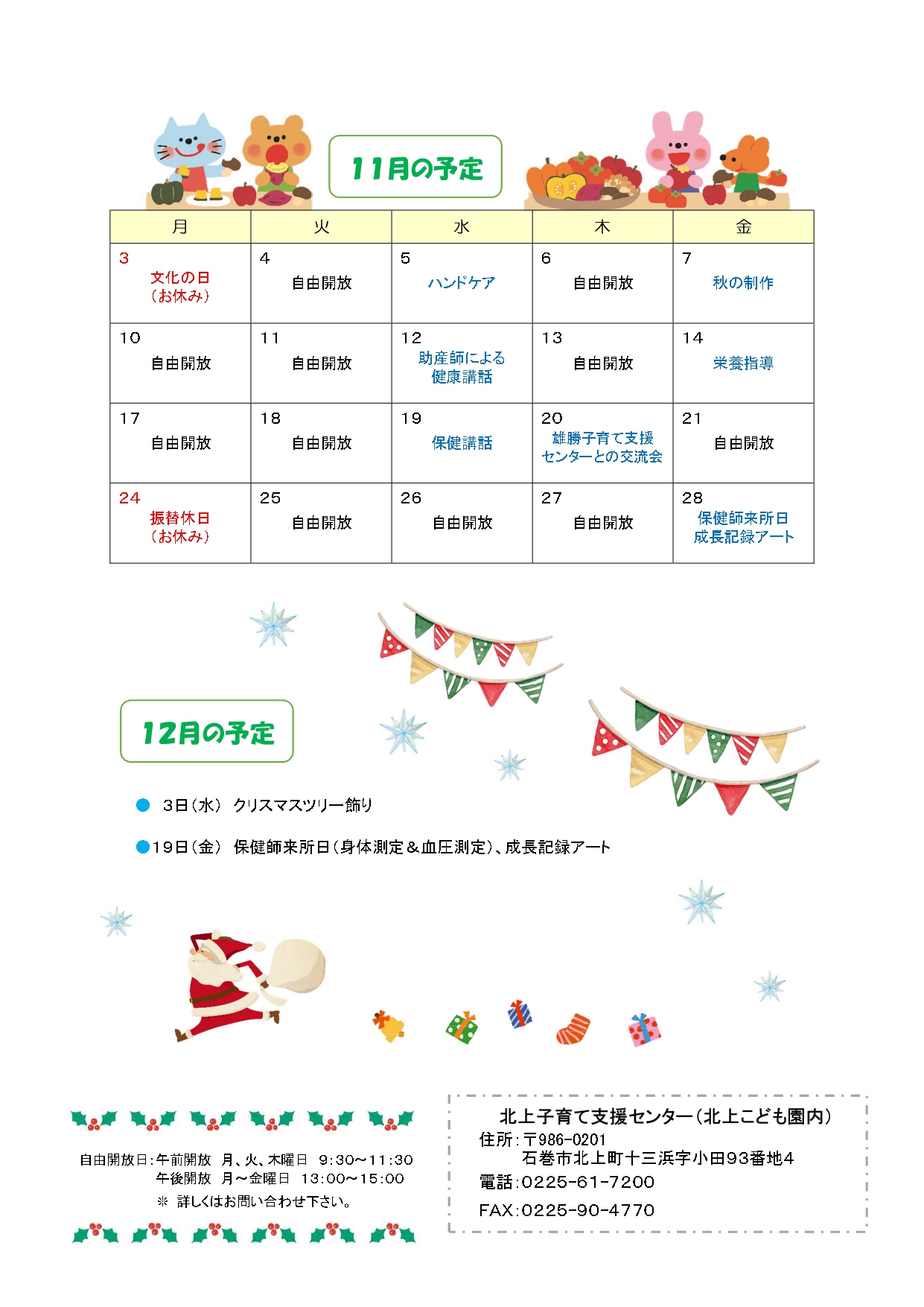 子育て相談窓口☆issyoへびた情報提供☆「子育て支援センター11月カレンダー(スマイル・河南・桃生・河北・北上・雄勝)」のおしらせ子育てひろば・子育て支援センターの11月のカレンダーが届きました♪ たのしいイベントも盛りだくさんです!ぜひご参加くださいね。 ★子育てひろばスマイル★