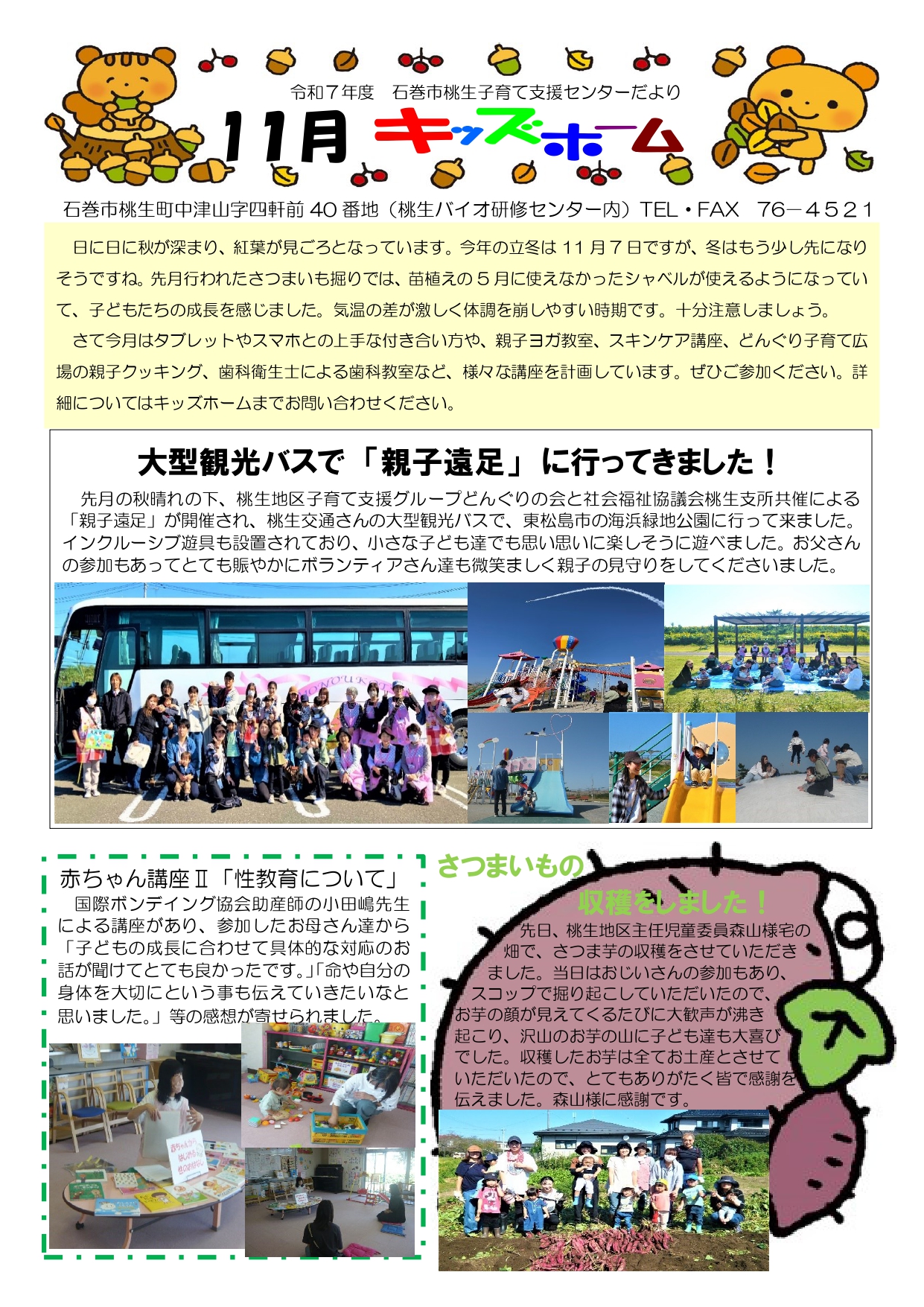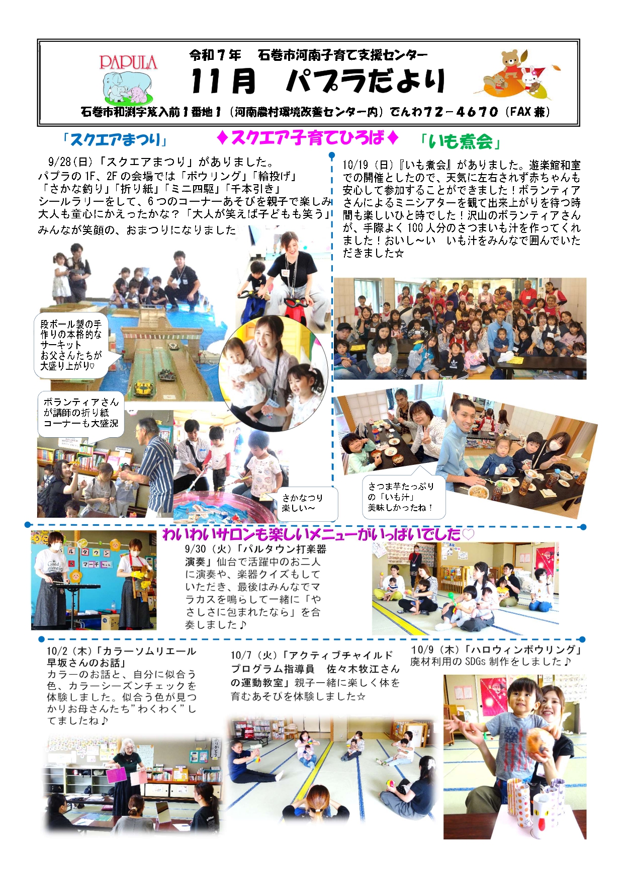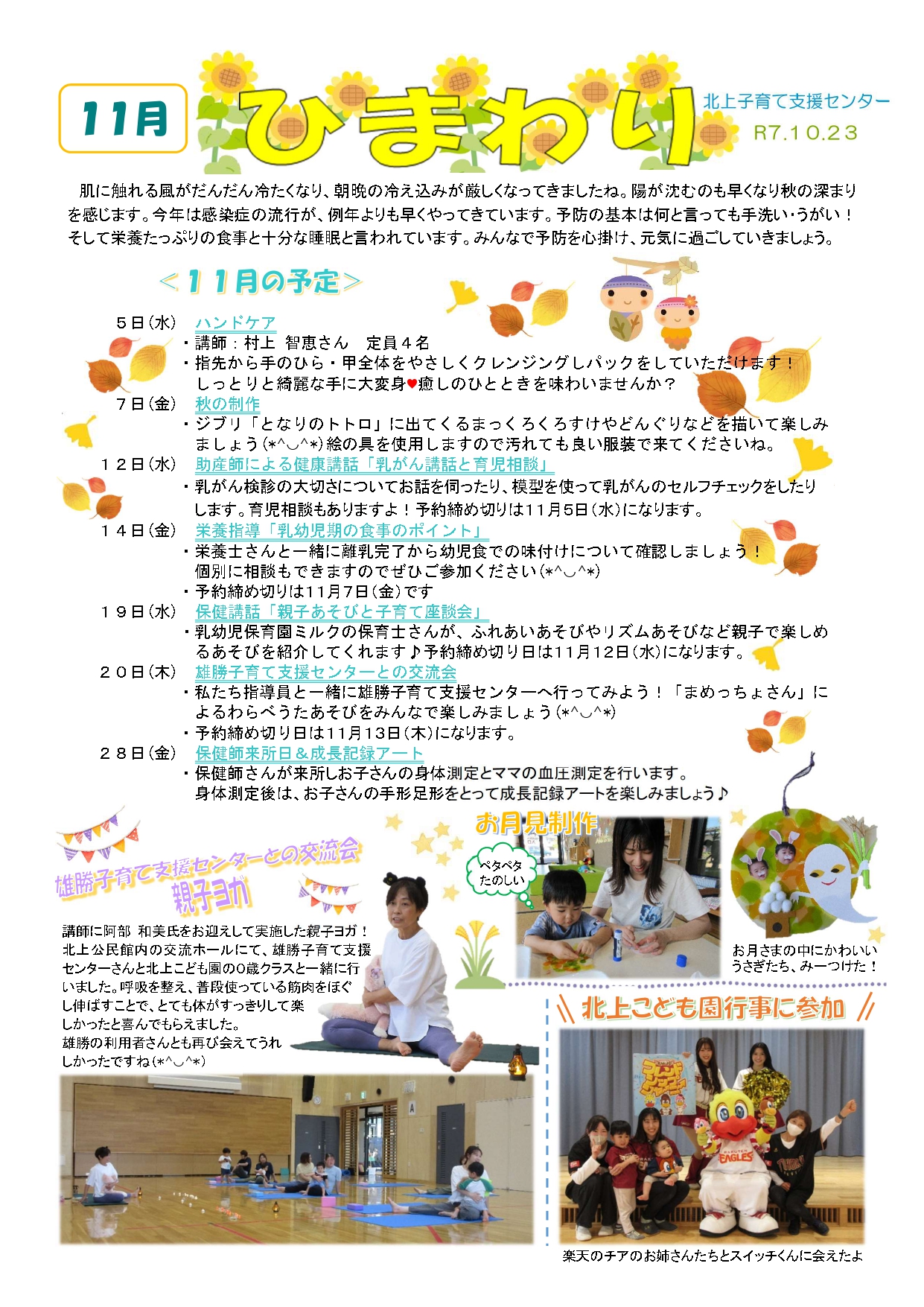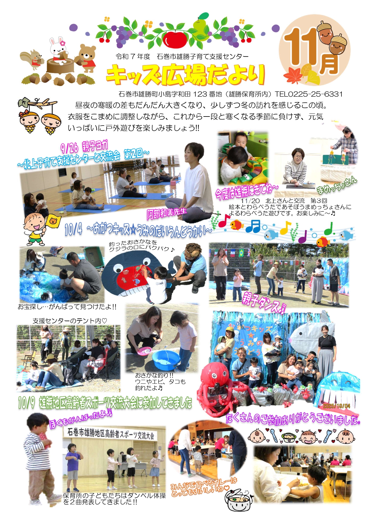 子育て相談窓口☆issyoへびた情報提供☆「子育て支援センター11月カレンダー(スマイル・河南・桃生・河北・北上・雄勝)」のおしらせ子育てひろば・子育て支援センターの11月のカレンダーが届きました♪ たのしいイベントも盛りだくさんです!ぜひご参加くださいね。 ★子育てひろばスマイル★