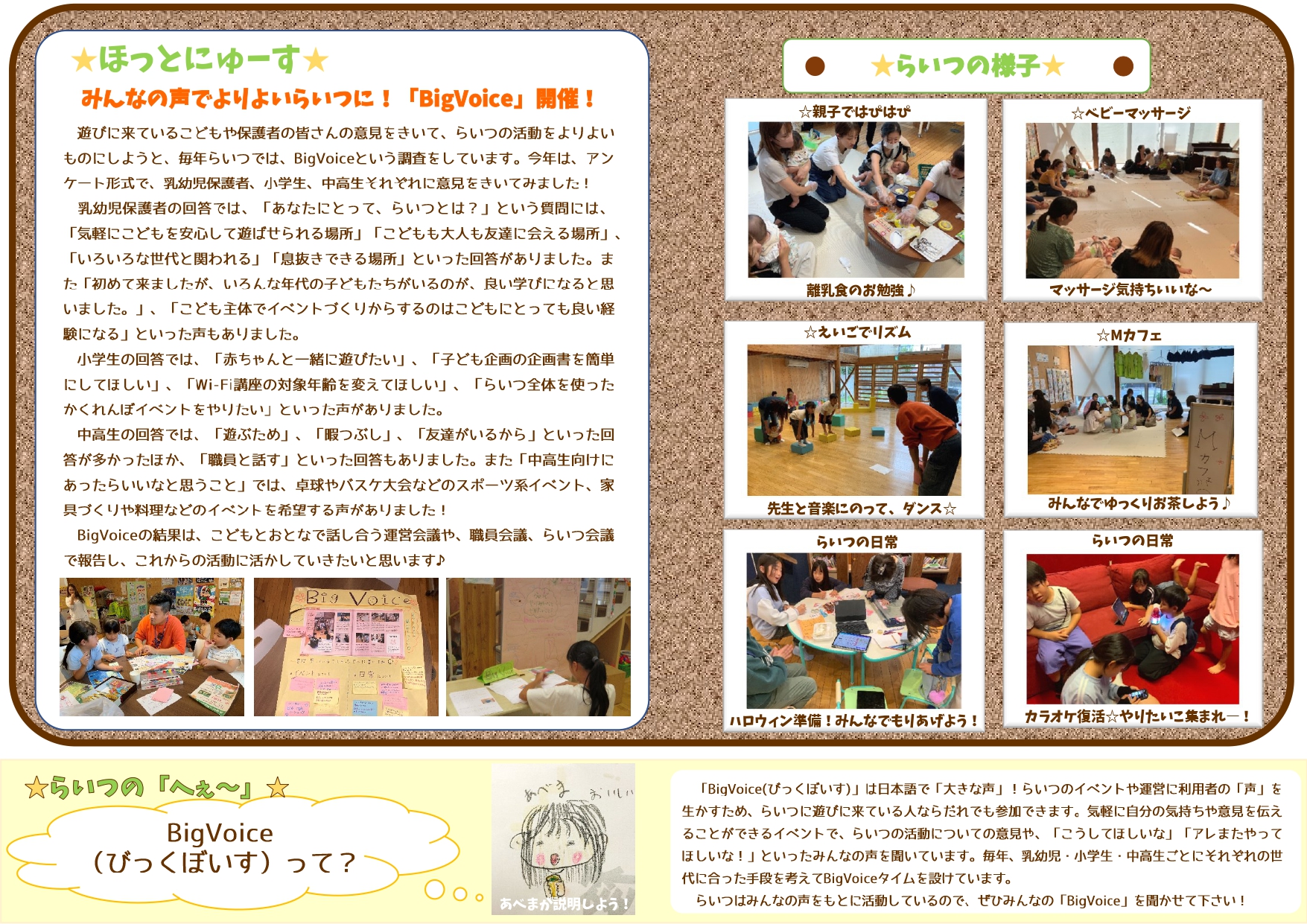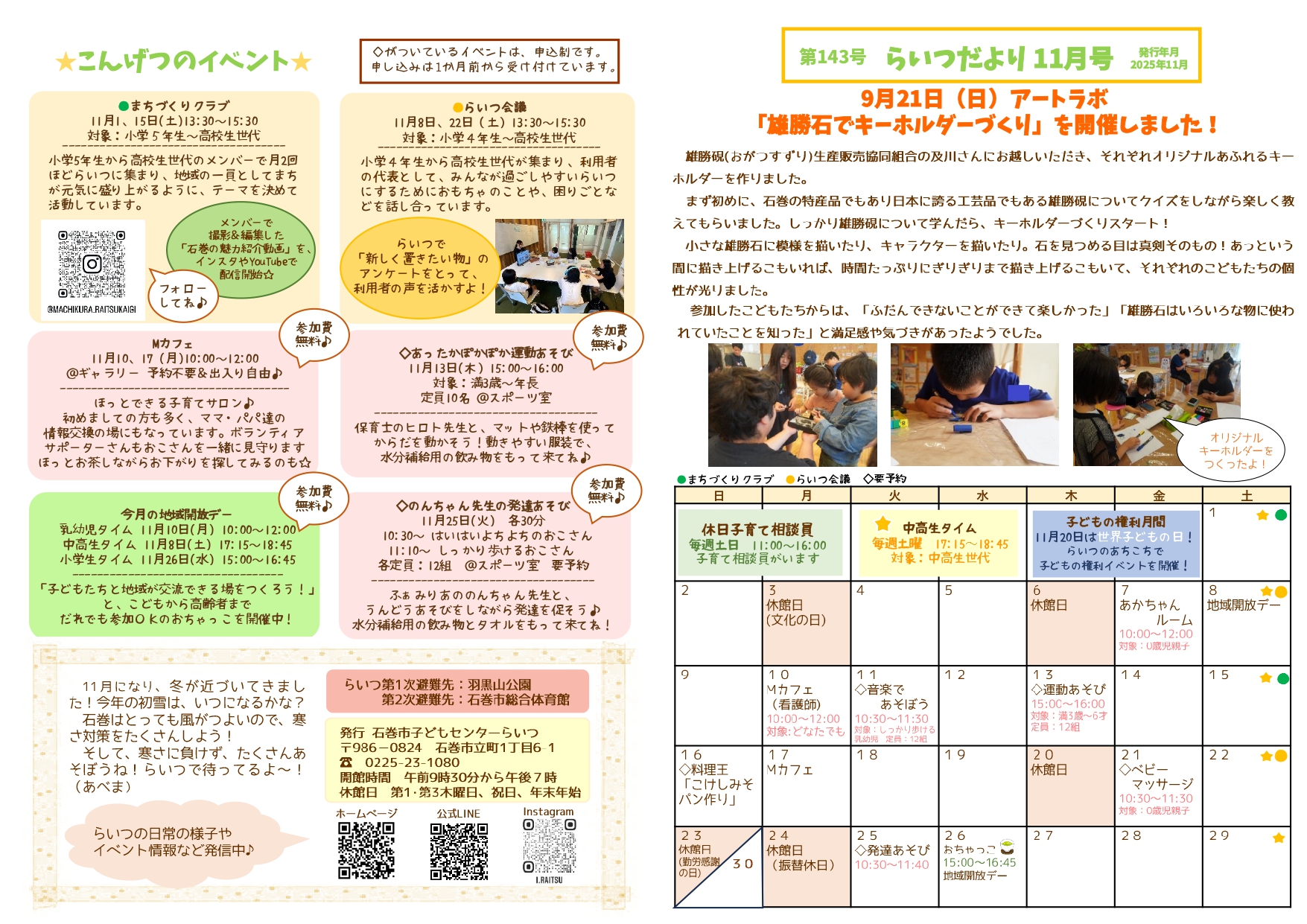 子育て相談窓口☆issyoへびた情報提供☆「らいつだより11月号」のおしらせ石巻市子どもセンターらいつより、『らいつだより11月号』のお知らせが届きました! 乳幼児向けのイベントも盛りだくさん♪小中高生もいつでも遊びにきてね★ イベント情報が気になる方はチラシをご覧になり、お気軽にご参加下さい(*^^*)