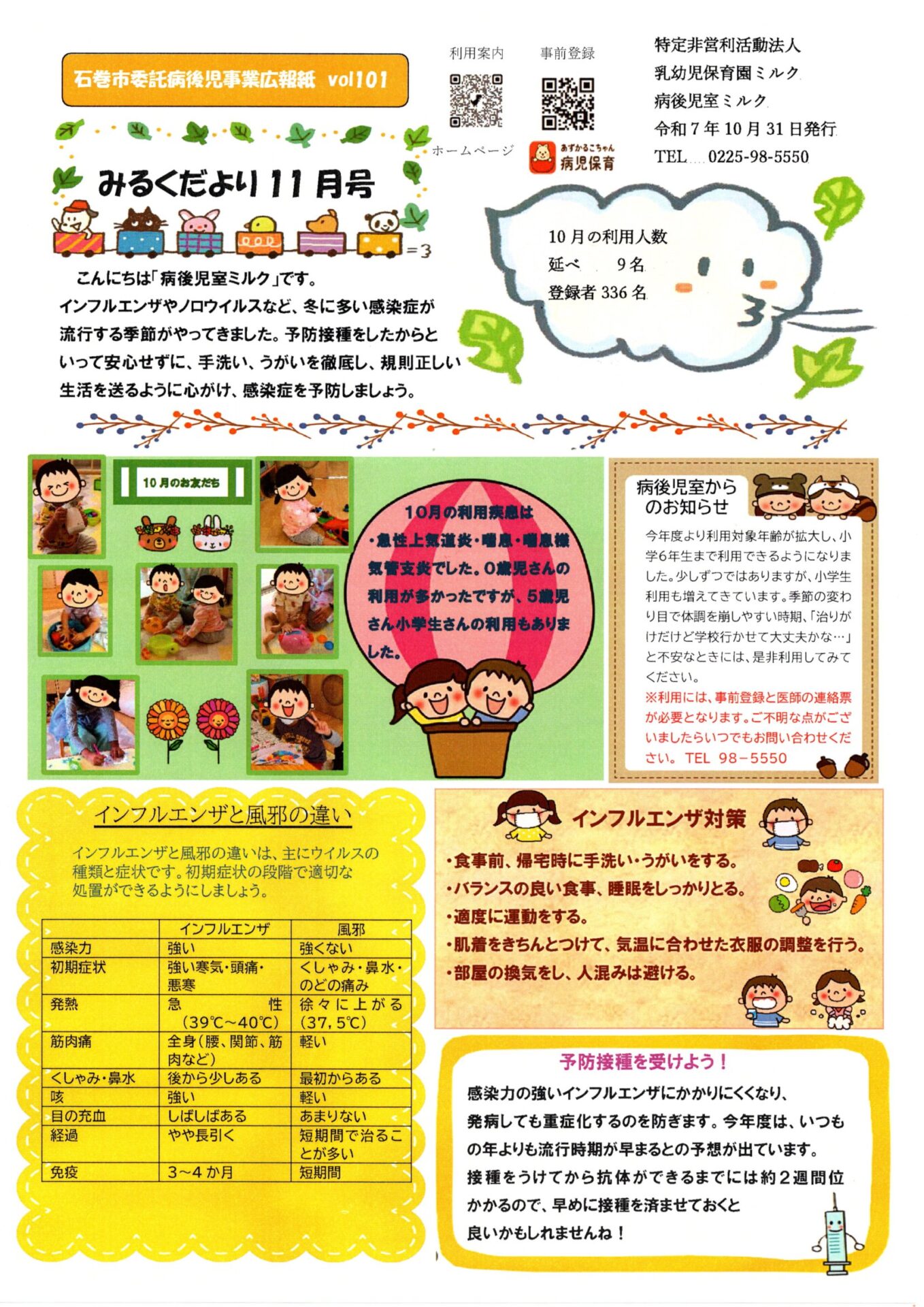 子育て相談窓口☆issyoへびた情報提供☆「みるくだより 11月号」のおしらせ乳幼児保育園ミルク・病後児室ミルクさんより、『みるくだより11月号』が届きました! インフルエンザ対策が載っています。参考にしてみてくださいね! ★『病後児室ミルク』は、熱が下がったばかり、いつもより食欲がない、おなかの調子が悪いなどの病気の回復期(集団の中で過ごすには体力が戻っていない時期)を、お子さんのペースに合わせて過ごせる場所です(^^)今年度より、利用対象年齢が拡大し、小学6年生まで利用できるようになっています! “あずかるこちゃん”に事前登録をしておくと、いざという時のお守りにもなりますね!ぜひ、QRコードからご登録くださいね。