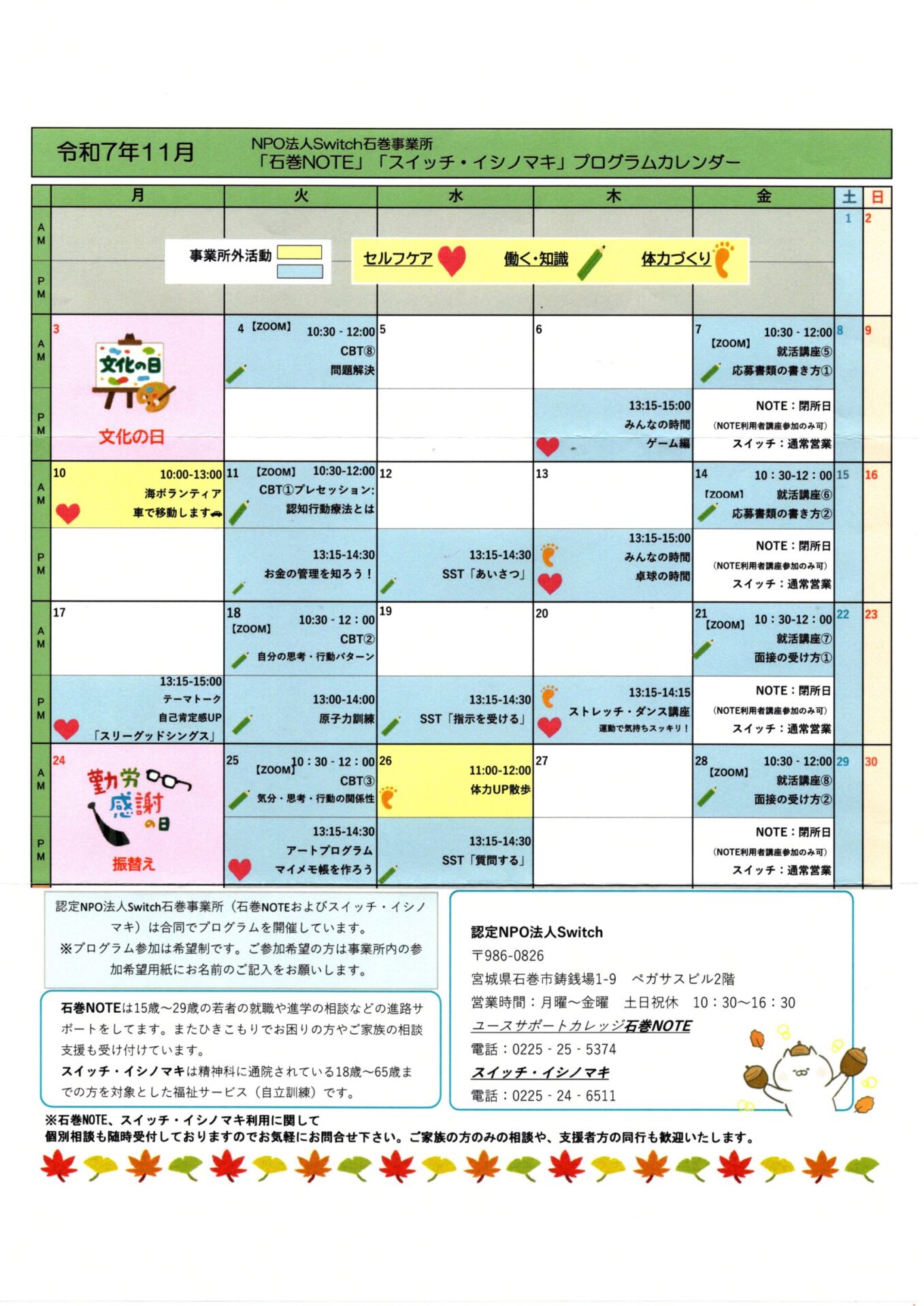 子育て相談窓口☆issyoへびた情報提供☆「石巻NOTE」「スイッチ・イシノマキ」からのおしらせ認定NPO法人Switch石巻事業所さんより、『11月の「石巻NOTE」「スイッチ・イシノマキ」プログラムカレンダー』が届きました♪ 石巻NOTE(若者の就職や進学サポート・ひきこもりの相談支援)、スイッチ・イシノマキ(精神科に通院されている方を対象にした福祉サービス)の合同でプログラムを開催しています。 ご家族の方の相談も随時受付中ですので、下記チラシをご覧になりお気軽にご参加・お問い合わせください(^^)
