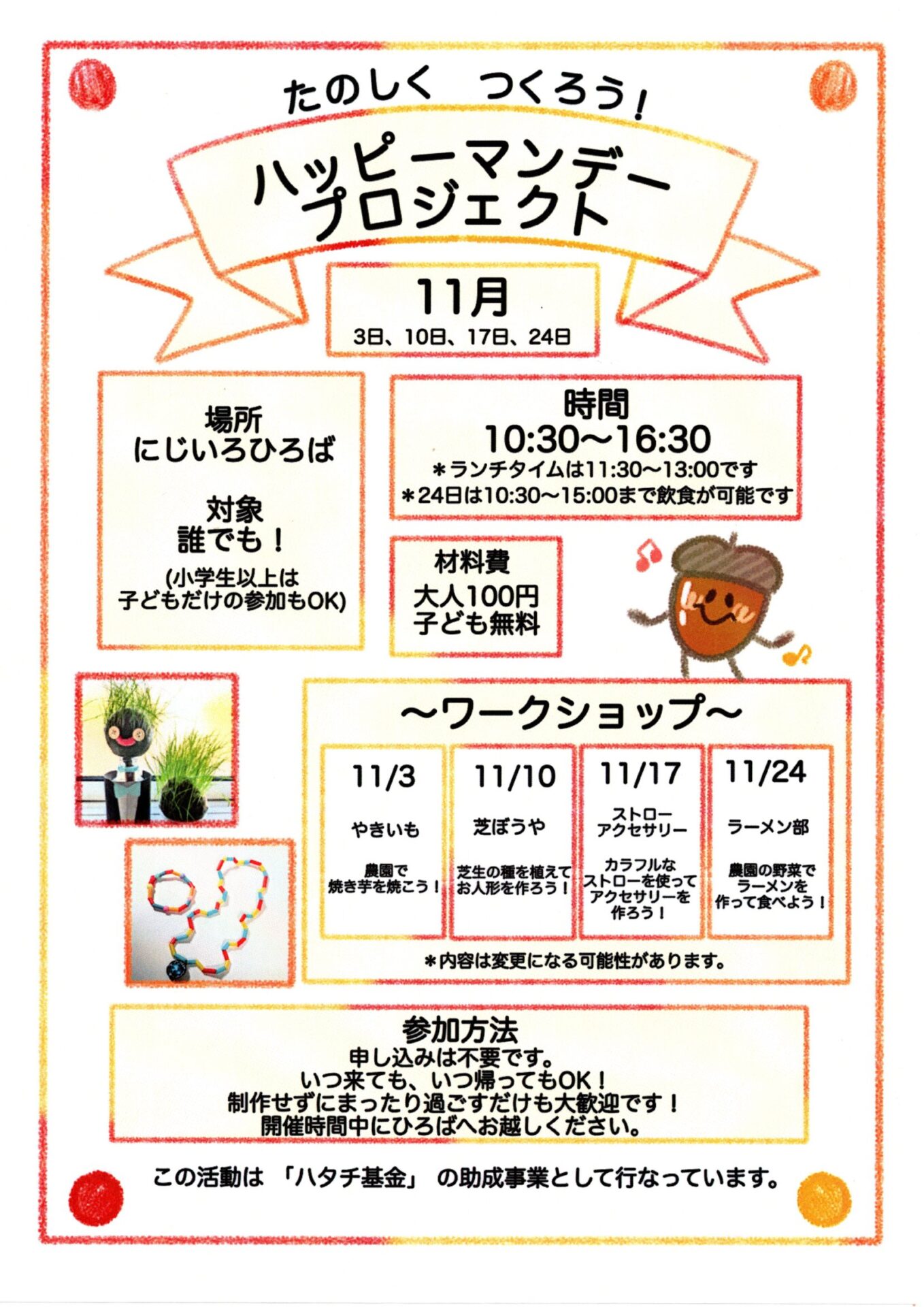 子育て相談窓口☆issyoへびた情報提供☆「ハッピーマンデープロジェクト」のおしらせにじいろひろばさんより、『たのしくつくろう!ハッピーマンデープロジェクト』のお知らせが届きました! 今後の11月開催は、11月10日・17日・24日です★ 申込不要、小学生以上は子どもだけでの参加もOKです(^^) 下記チラシをご覧になり、ぜひご参加下さい♪