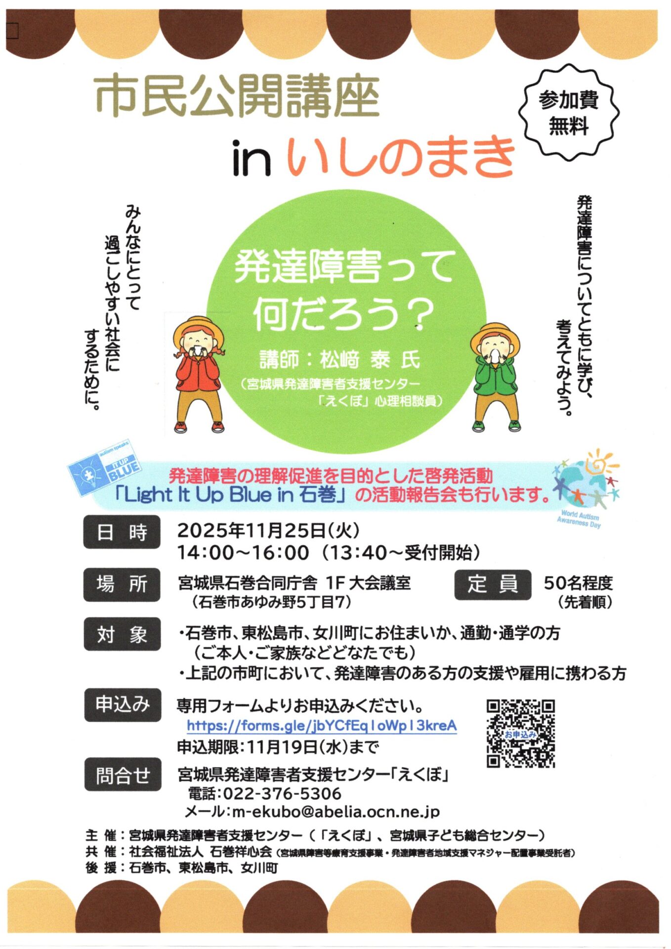 子育て相談窓口☆issyoへびた情報提供☆「市民公開講座inいしのまき 発達障害って何だろう?」のおしらせ宮城県発達障害者支援センターより、『市民公開講座inいしのまき 発達障害って何だろう?』のお知らせが届きました。 日時:2025年11月25日(火) 14:00~16:00 場所:宮城県石巻合同庁舎 1階 大会議室 みんなにとって過ごしやすい社会にするために、いっしょに学び、考えてみませんか?参加は無料です。 興味のある方は下記チラシをご覧になり、専用フォームより申込んで下さい♪