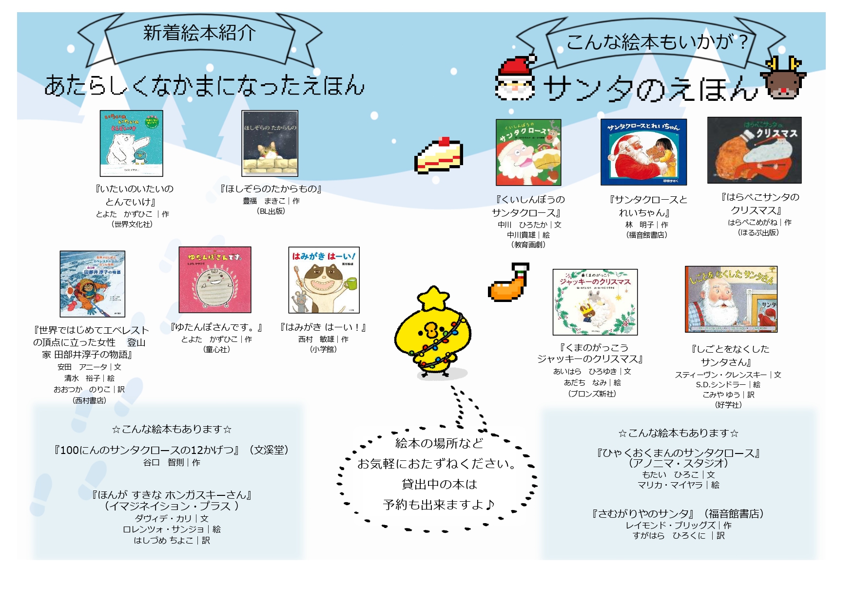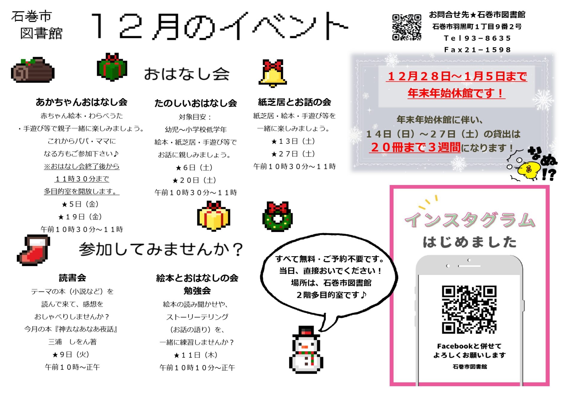 子育て相談窓口☆issyoへびた情報提供☆「図書館だより12月号」のおしらせ石巻市図書館より、12月のお便りが届きました♪ 毎月新しい絵本が仲間入りしています(^^) おはなし会などのイベントもあります★ぜひご参加下さいね!!