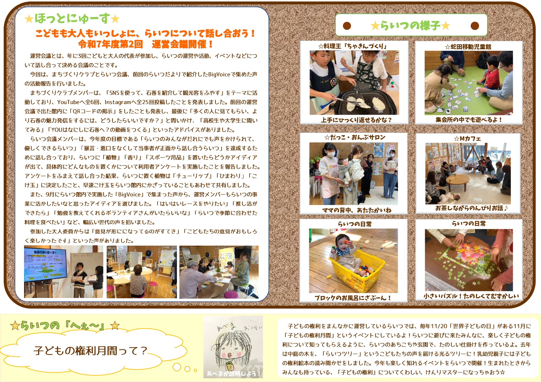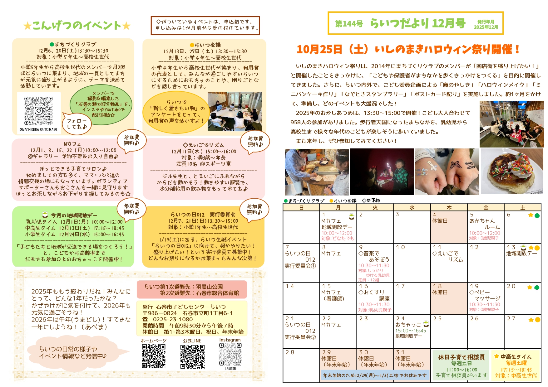 子育て相談窓口☆issyoへびた情報提供☆「らいつだより12月号」のおしらせ石巻市子どもセンターらいつより、『らいつだより12月号』のお知らせが届きました! 乳幼児向けのイベントも盛りだくさん♪小中高生もいつでも遊びにきてね★ らいつの様子も掲載しています! イベント情報が気になる方はチラシをご覧になり、お気軽にご参加下さい(*^^*)