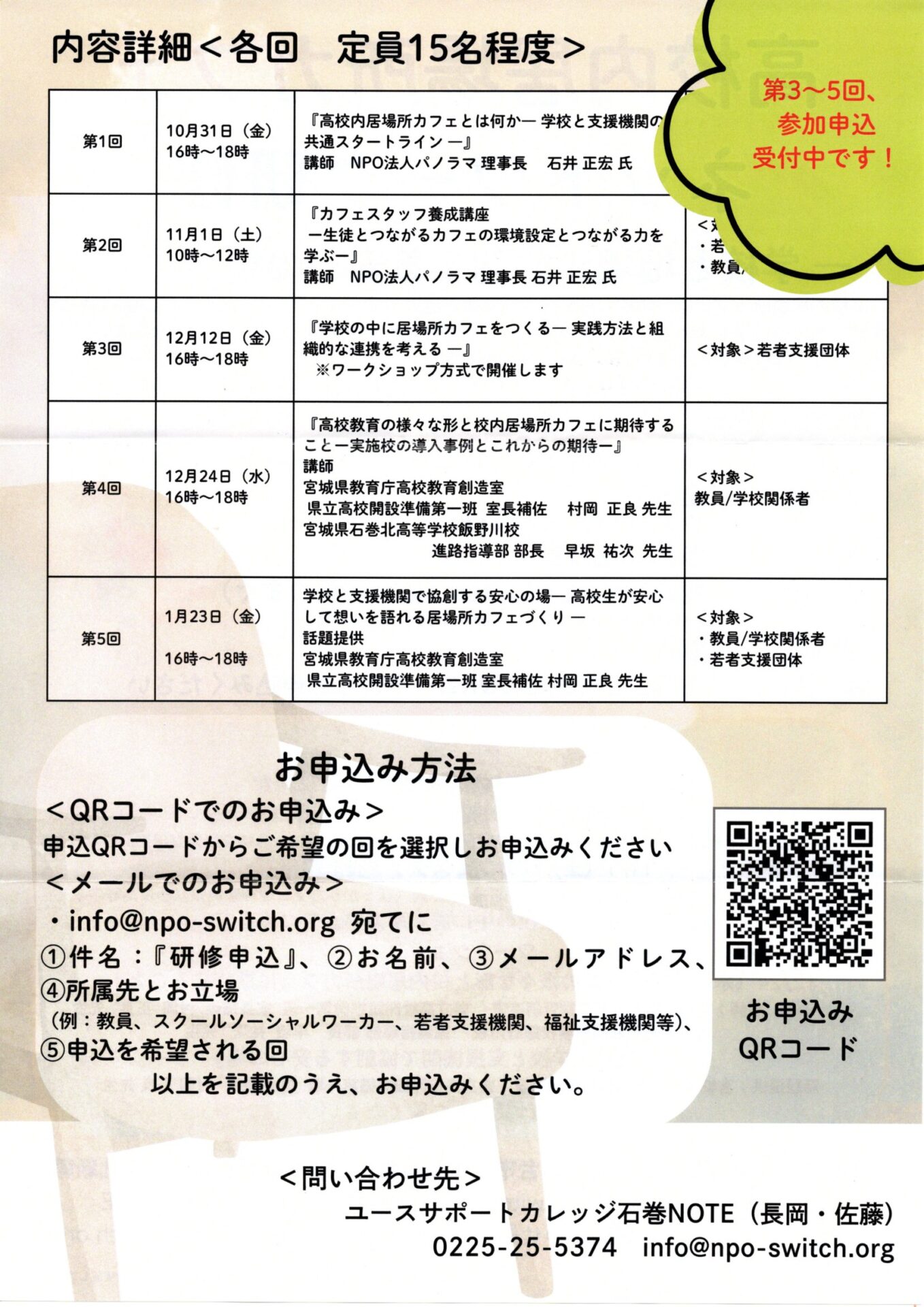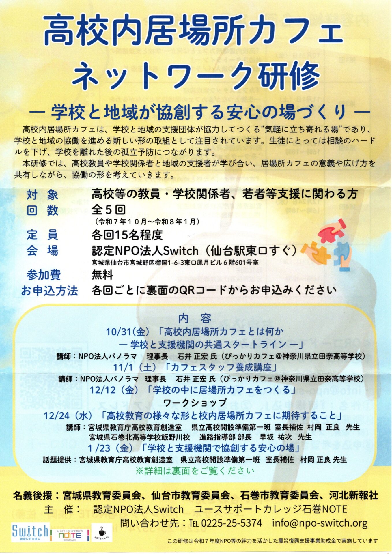 子育て相談窓口☆issyoへびた情報提供☆「高校内居場所カフェネットワーク研修」のおしらせ認定NPO法人Switchユースサポートカレッジ石巻NOTEさんより 「高校内居場所カフェネットワーク研修」~学校と地域が協創する安心の場づくり~のお知らせが届きました! 高校教員や学校関係者と地域の支援者が学ひ合い共有しながら協働の形を考える研修です☆ 各回日程などチラシをご覧ください。