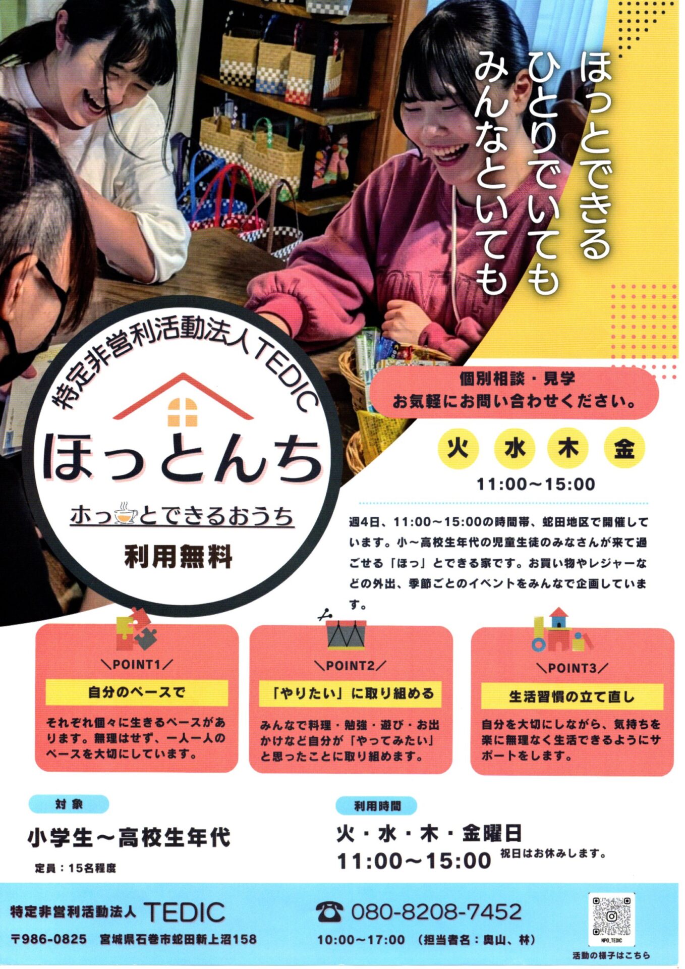 子育て相談窓口☆issyoへびた情報提供☆「ほっとんち」のおしらせ特定非営利活動法人TEDICより「ホッとできるおうち ほっとんち」のおしらせです。 週に4日、11:00~15:00の時間帯、蛇田地区で開催しています。 ひとりでいても、みんなといても、ほっとできる〈ほっとんち〉で過ごしてみませんか?