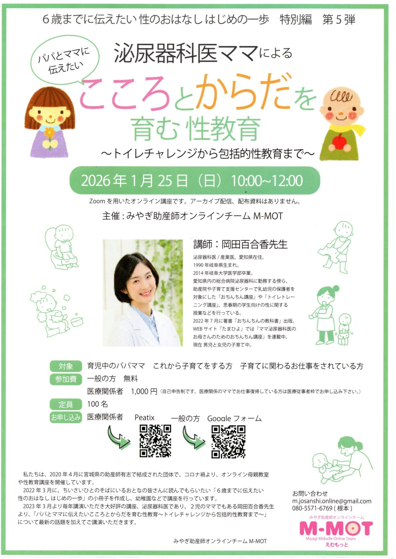 子育て相談窓口☆issyoへびた情報提供☆「こころとからだを育む性教育」のおしらせ主催 みやぎ助産師オンラインチーム M-MOTによる「こころとからだを育む性教育~トイレチャレンジから包括的性教育まで~」のおしらせです。 講師に泌尿器科医として勤務する傍ら、助産院や子育て支援センターで乳幼児の保護者を対象にした講座や、思春期の学生向けの性に関する授業なども行っている〈岡田百合香〉先生に講演いただきます。 ZOOMを用いたオンライン講座となっております。 一般の方は無料で受講いただけます。 詳細は下記チラシをごらんください。