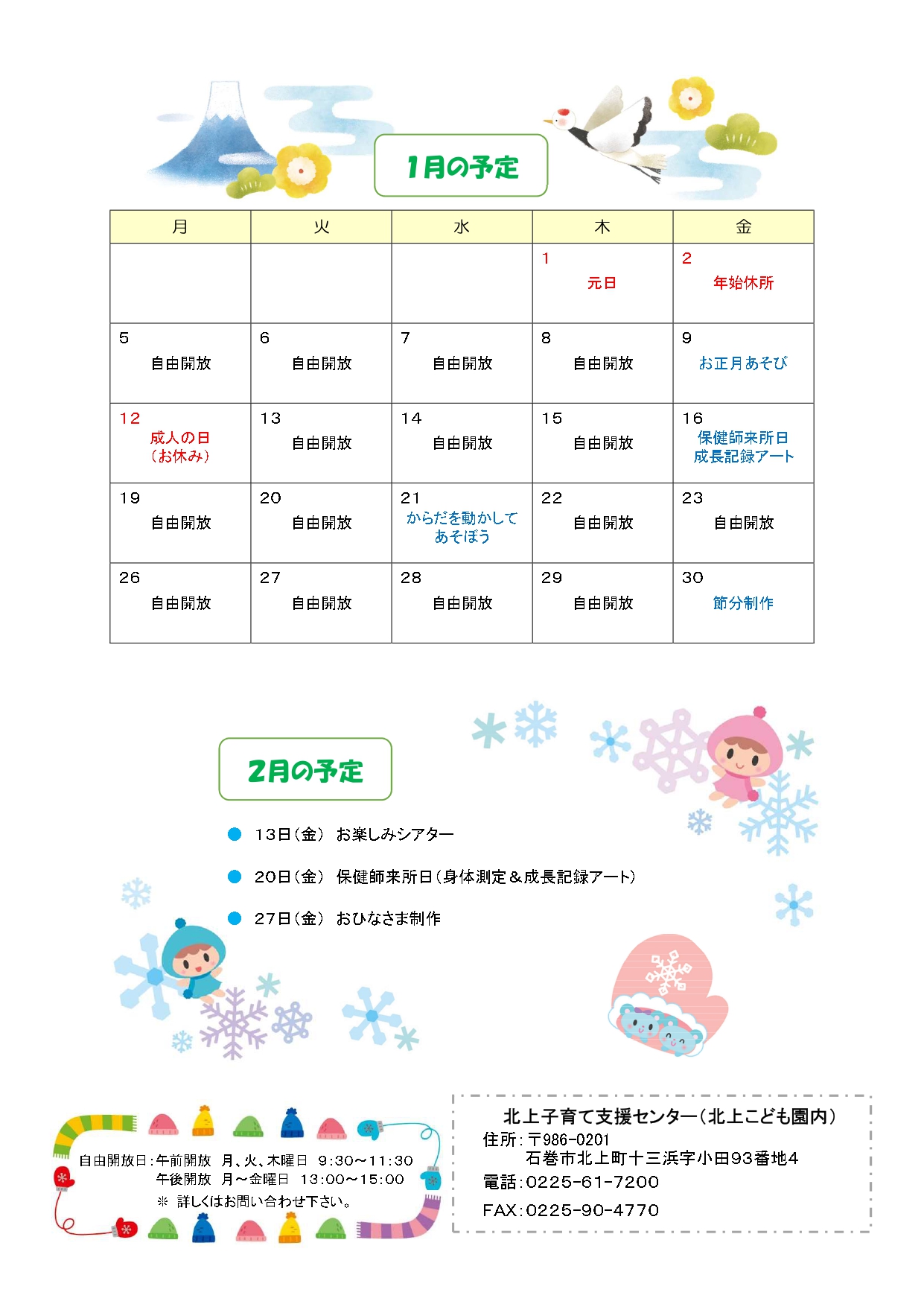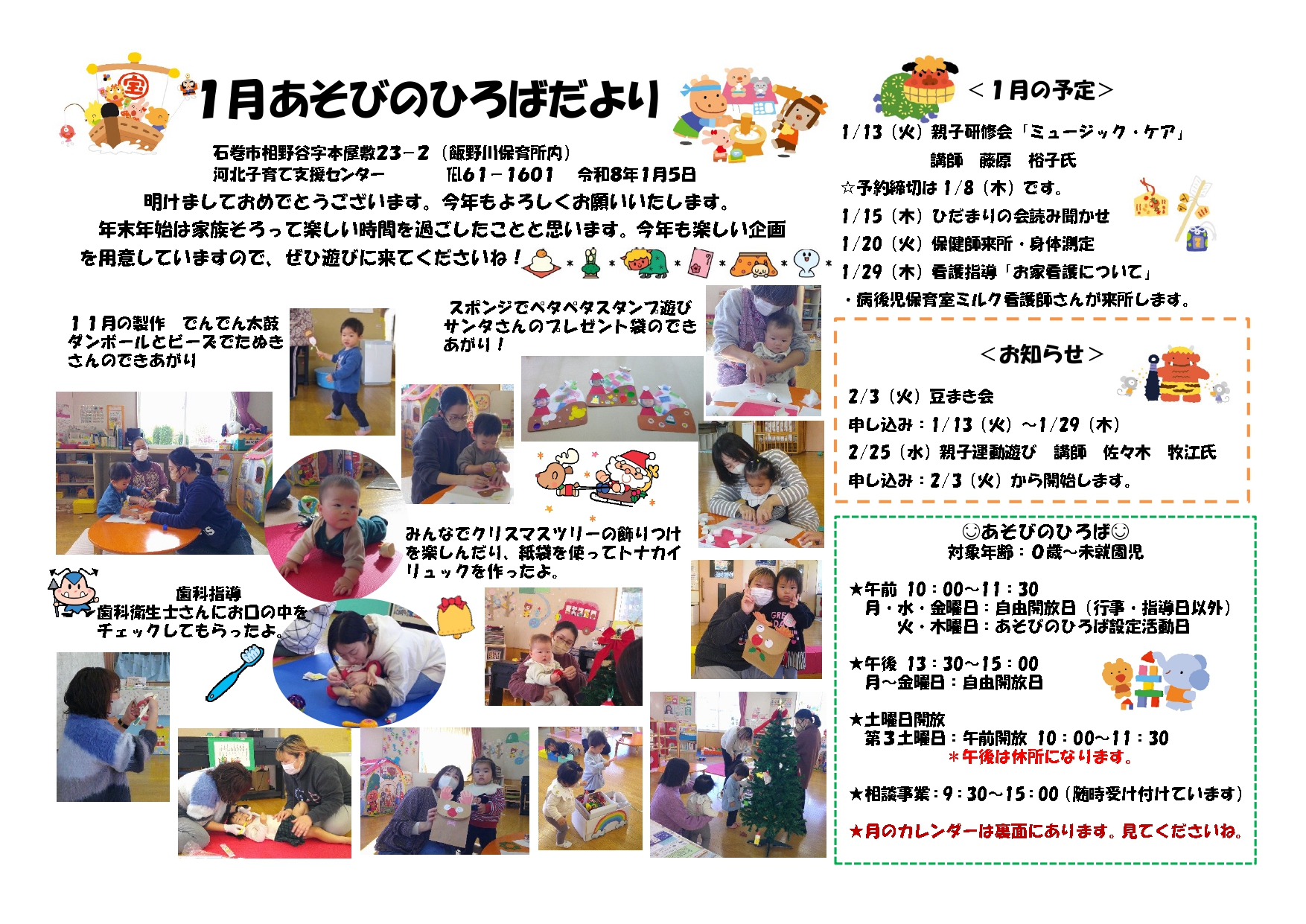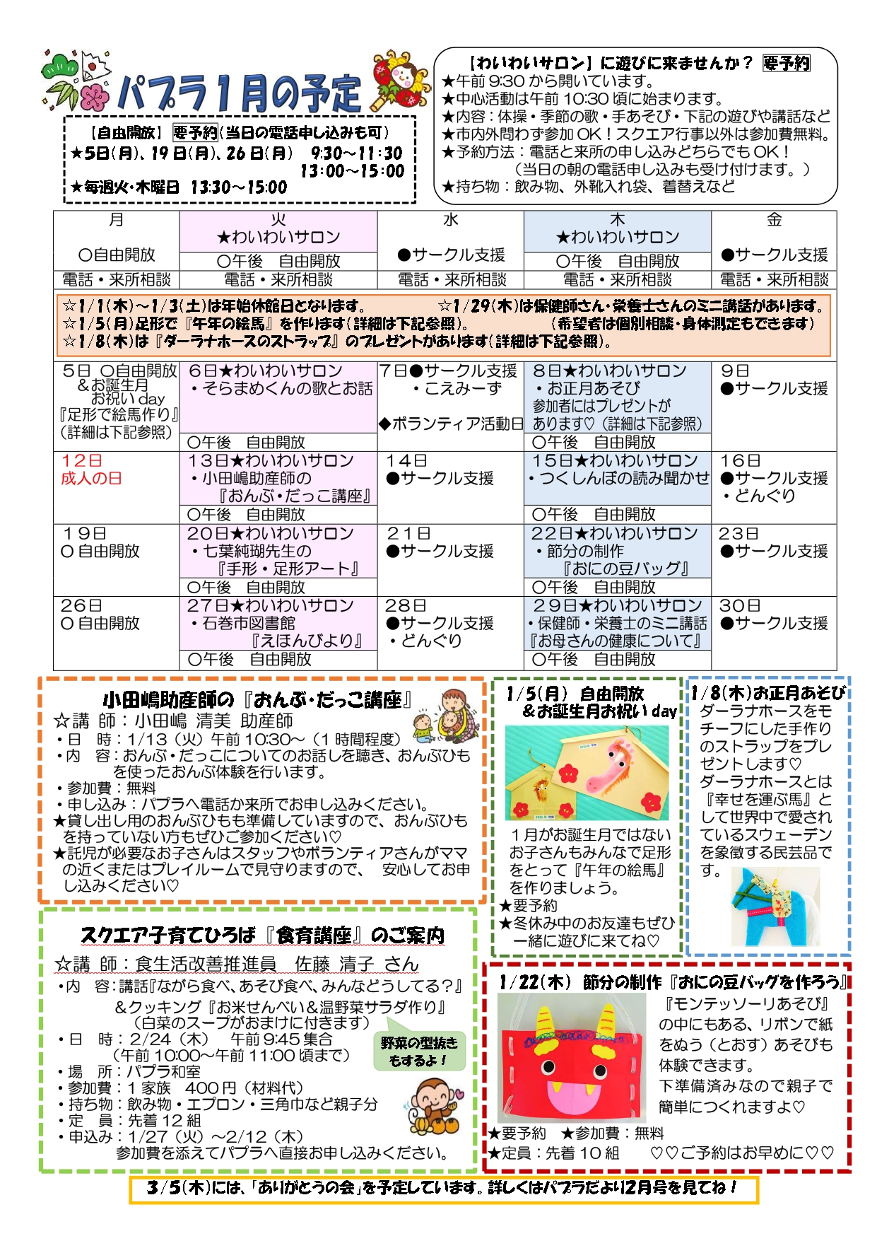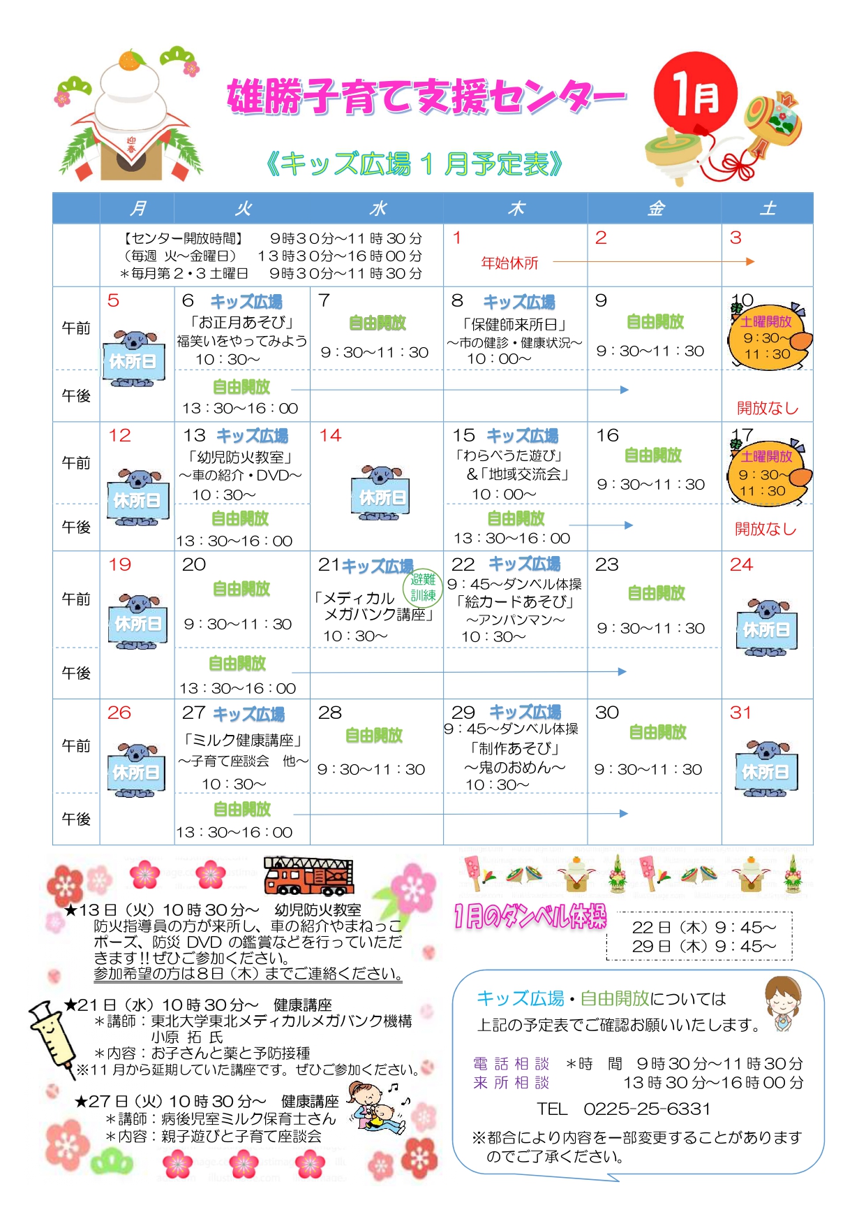 子育て相談窓口☆issyoへびた情報提供☆「子育て支援センター1月カレンダー(スマイル・河南・桃生・河北・北上・雄勝)」のおしらせ子育てひろば・子育て支援センターの1月のカレンダーが届きました♪ たのしいイベントも盛りだくさんです!ぜひご参加くださいね。 ★子育てひろばスマイル★