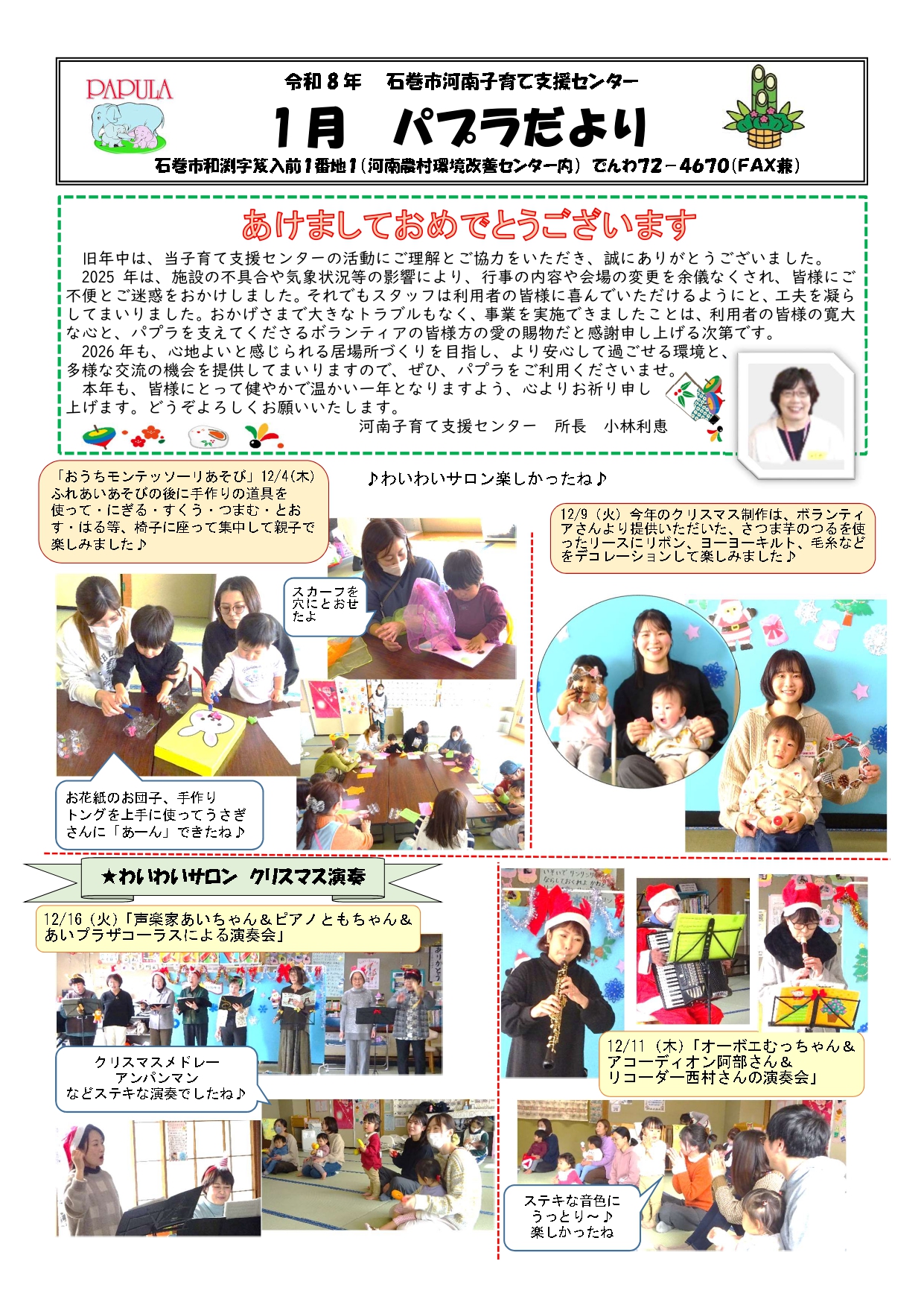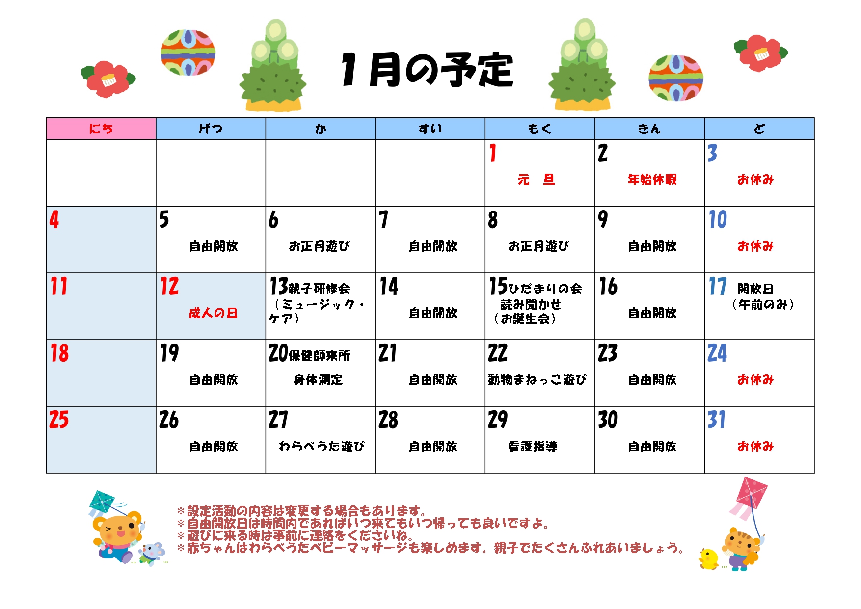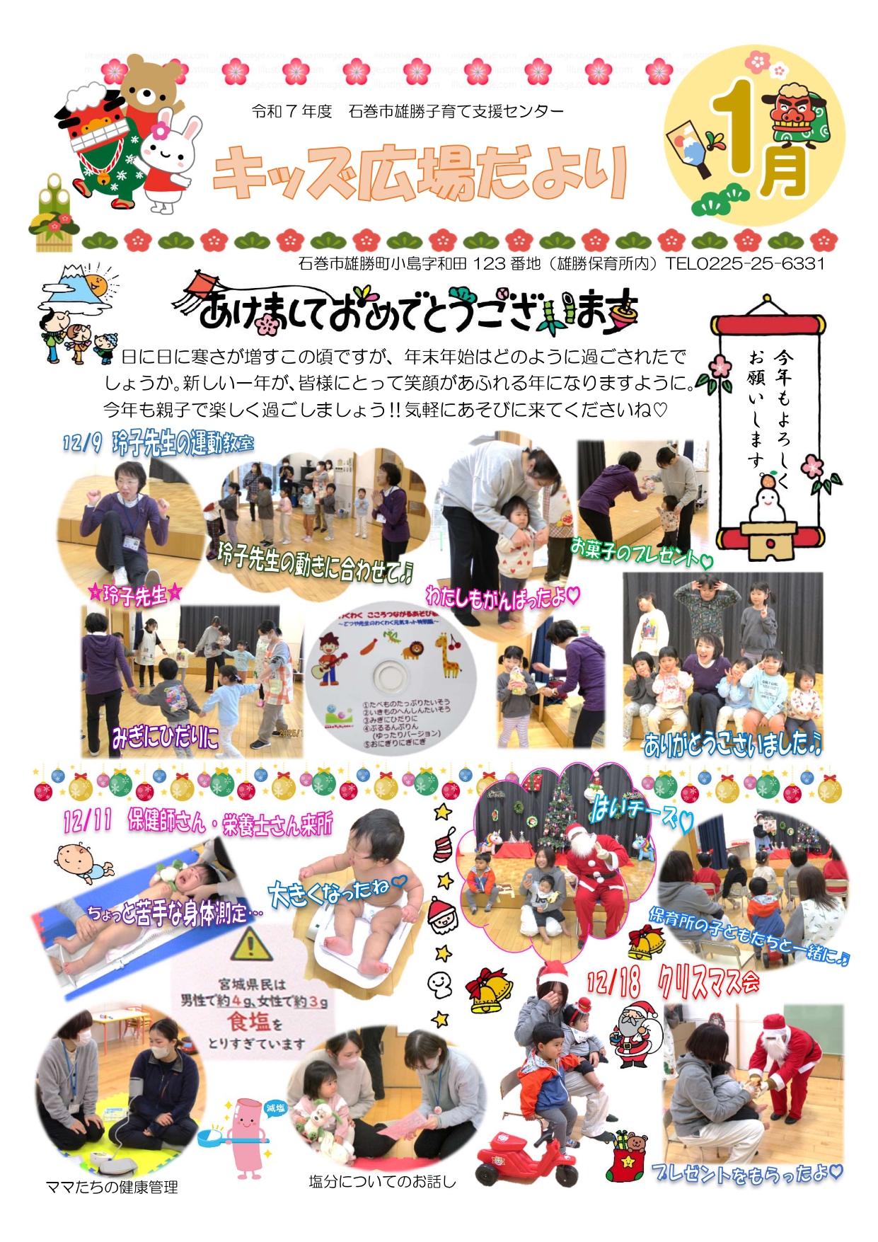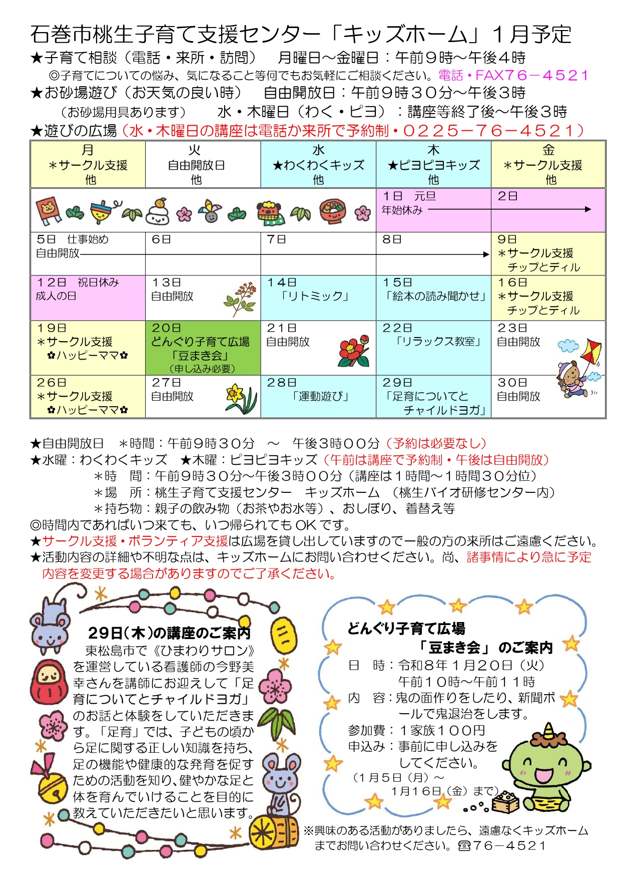 子育て相談窓口☆issyoへびた情報提供☆「子育て支援センター1月カレンダー(スマイル・河南・桃生・河北・北上・雄勝)」のおしらせ子育てひろば・子育て支援センターの1月のカレンダーが届きました♪ たのしいイベントも盛りだくさんです!ぜひご参加くださいね。 ★子育てひろばスマイル★