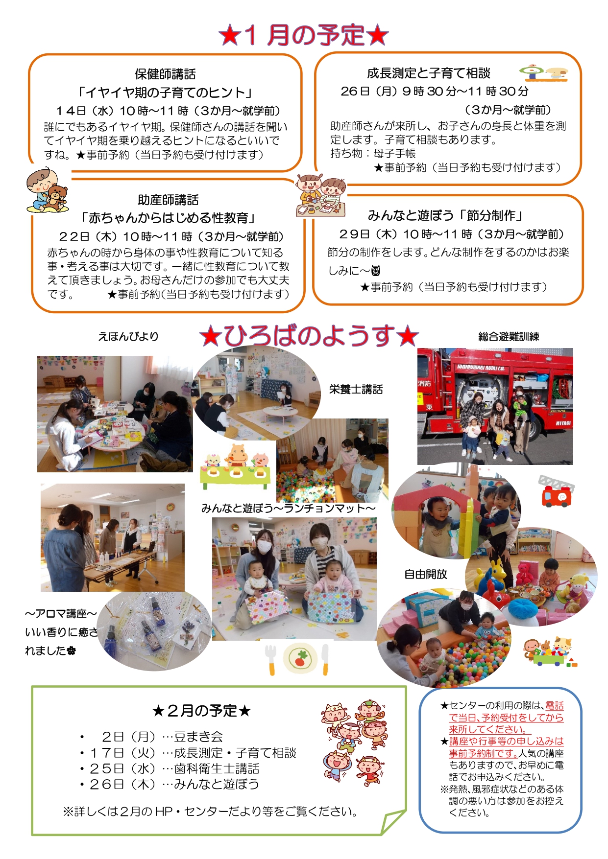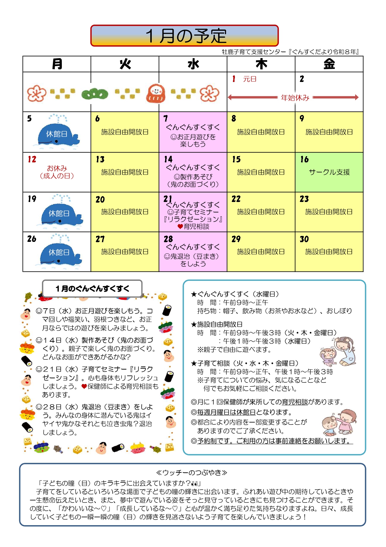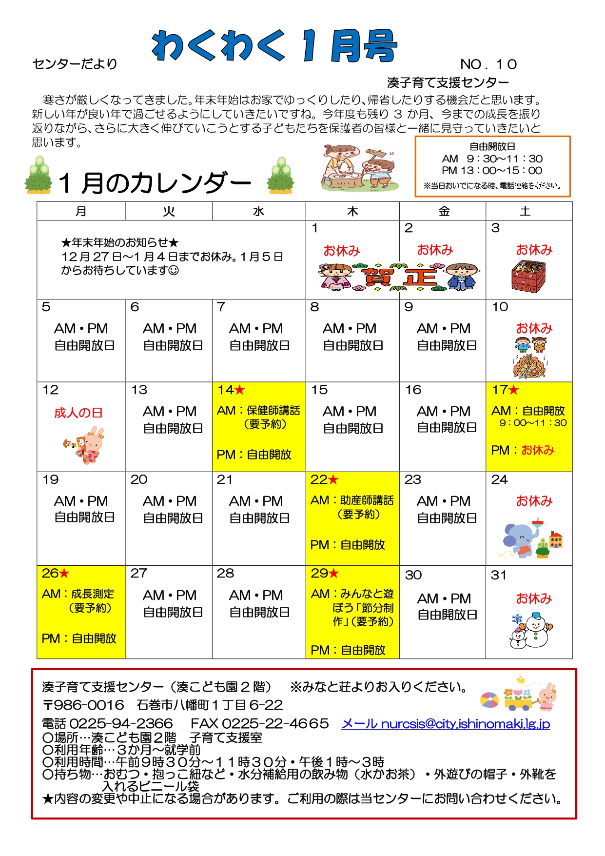 子育て相談窓口☆issyoへびた情報提供☆「子育て支援センター1月カレンダー(にじいろ・なかよし・釜・湊・渡波・牡鹿)」のおしらせ子育て支援センターの1月のカレンダーが届いています♪ たのしいイベントが盛りだくさんです!ぜひご参加下さいね。 ★地域子育て支援拠点「にじいろひろば」★