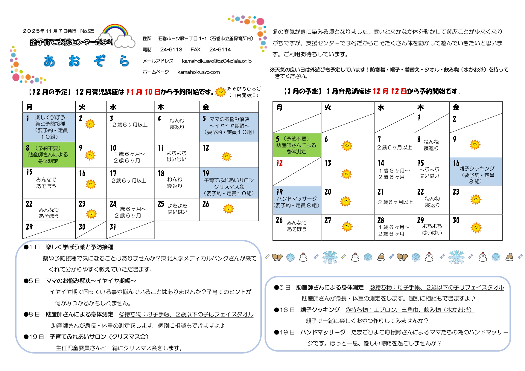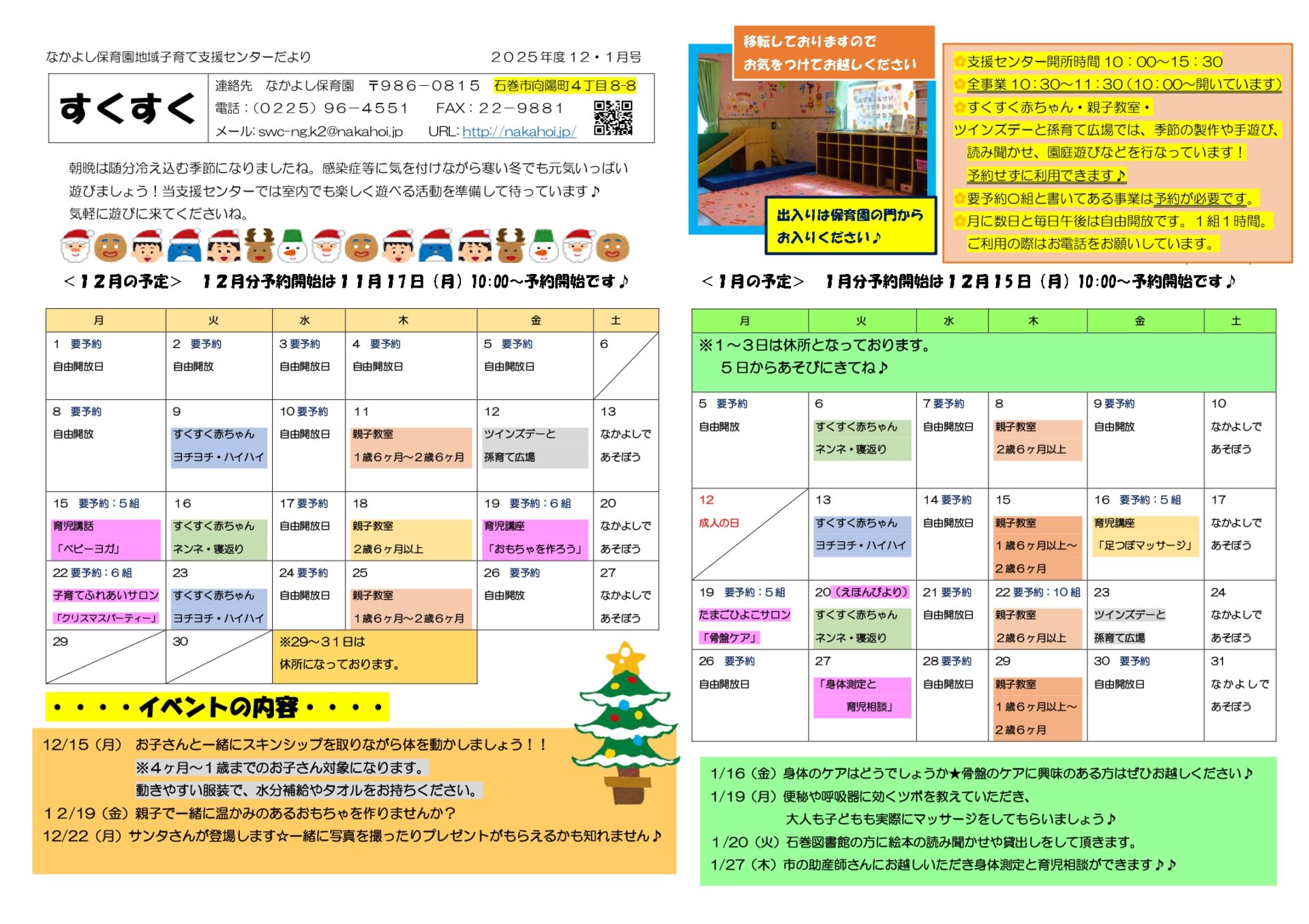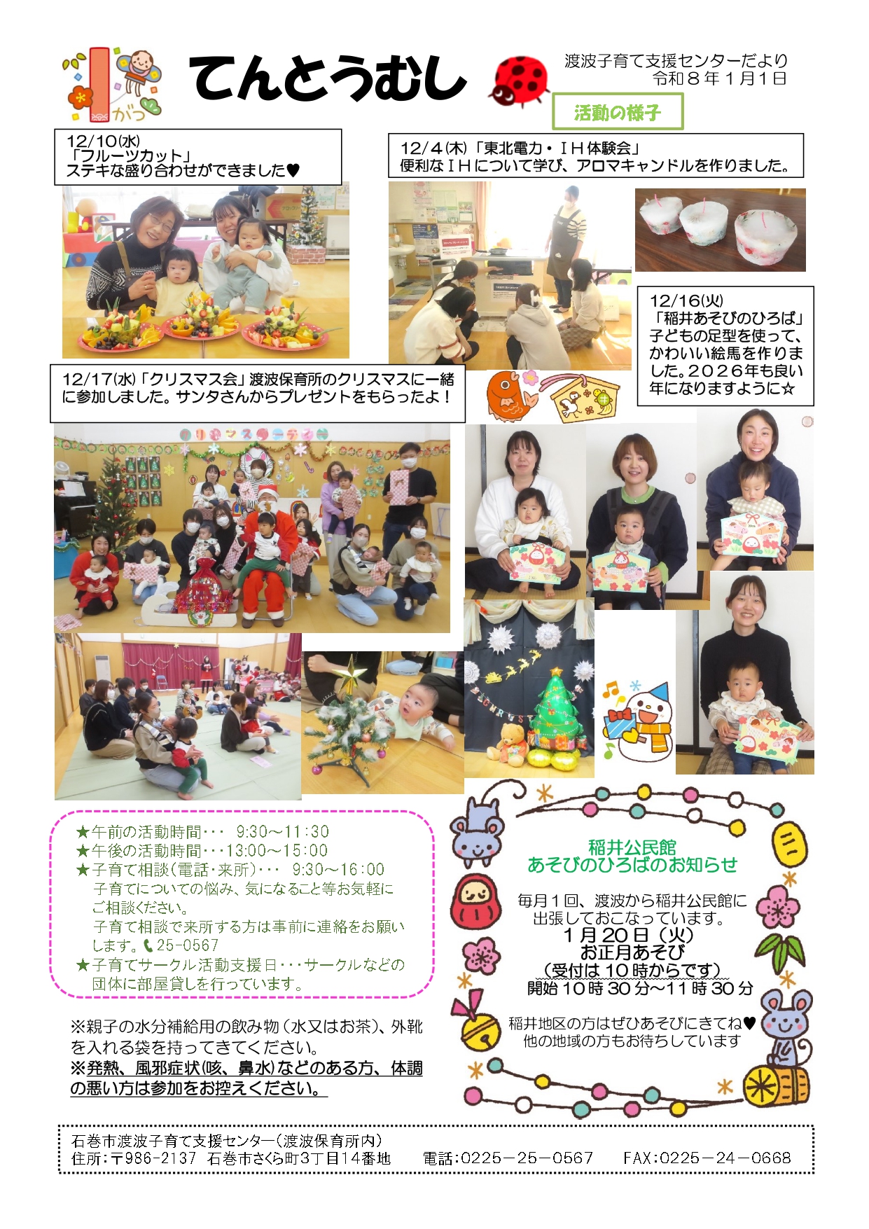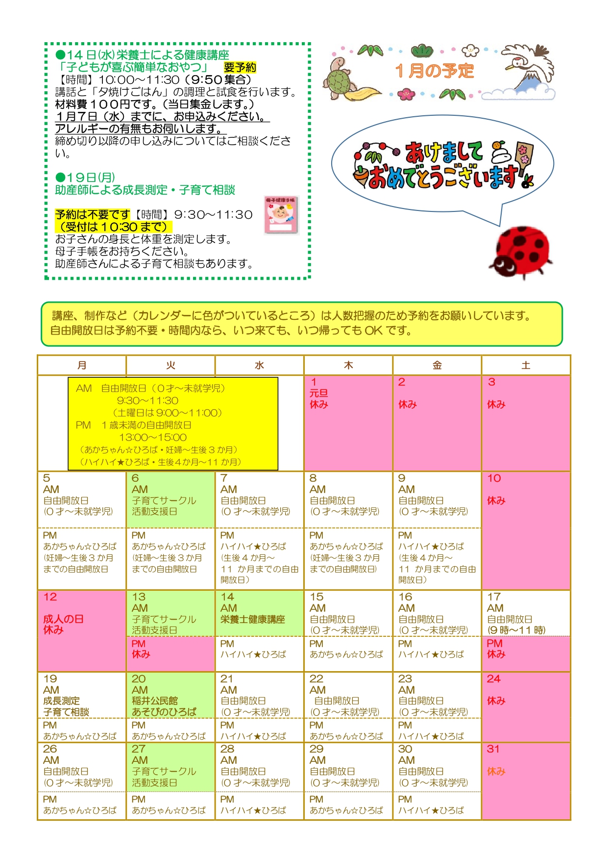 子育て相談窓口☆issyoへびた情報提供☆「子育て支援センター1月カレンダー(にじいろ・なかよし・釜・湊・渡波・牡鹿)」のおしらせ子育て支援センターの1月のカレンダーが届いています♪ たのしいイベントが盛りだくさんです!ぜひご参加下さいね。 ★地域子育て支援拠点「にじいろひろば」★