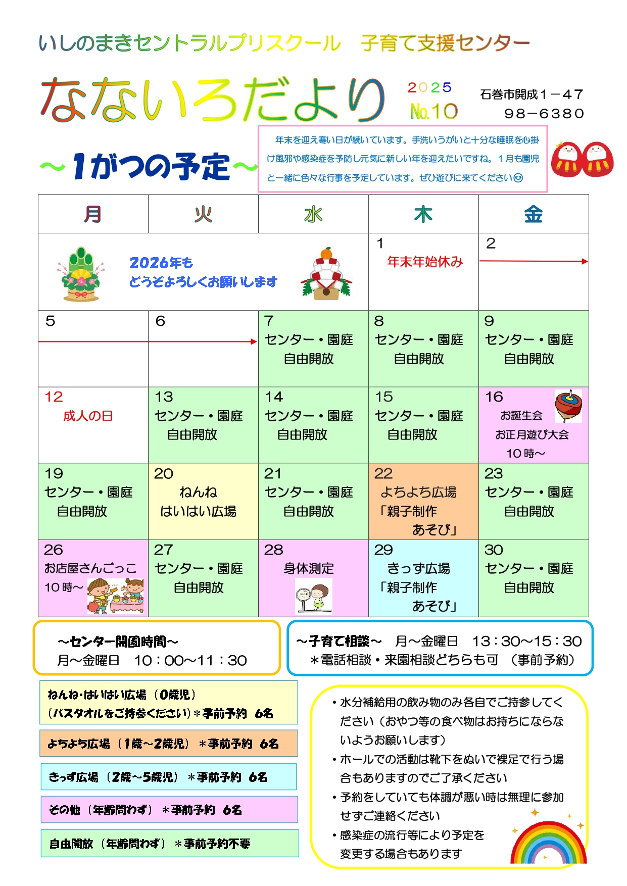 子育て相談窓口☆issyoへびた情報提供☆「いしのまきセントラルプリスクール 子育て支援センター なないろだより」のおしらせいしのまきセントラルプリスクール子育て支援センターより、『なないろだより No.10』が届きました! 1月も、楽しいイベントが開催されますよ(^^)♪ こども園の園児と一緒の活動は、よい刺激になりますね☆ぜひご参加下さい☆