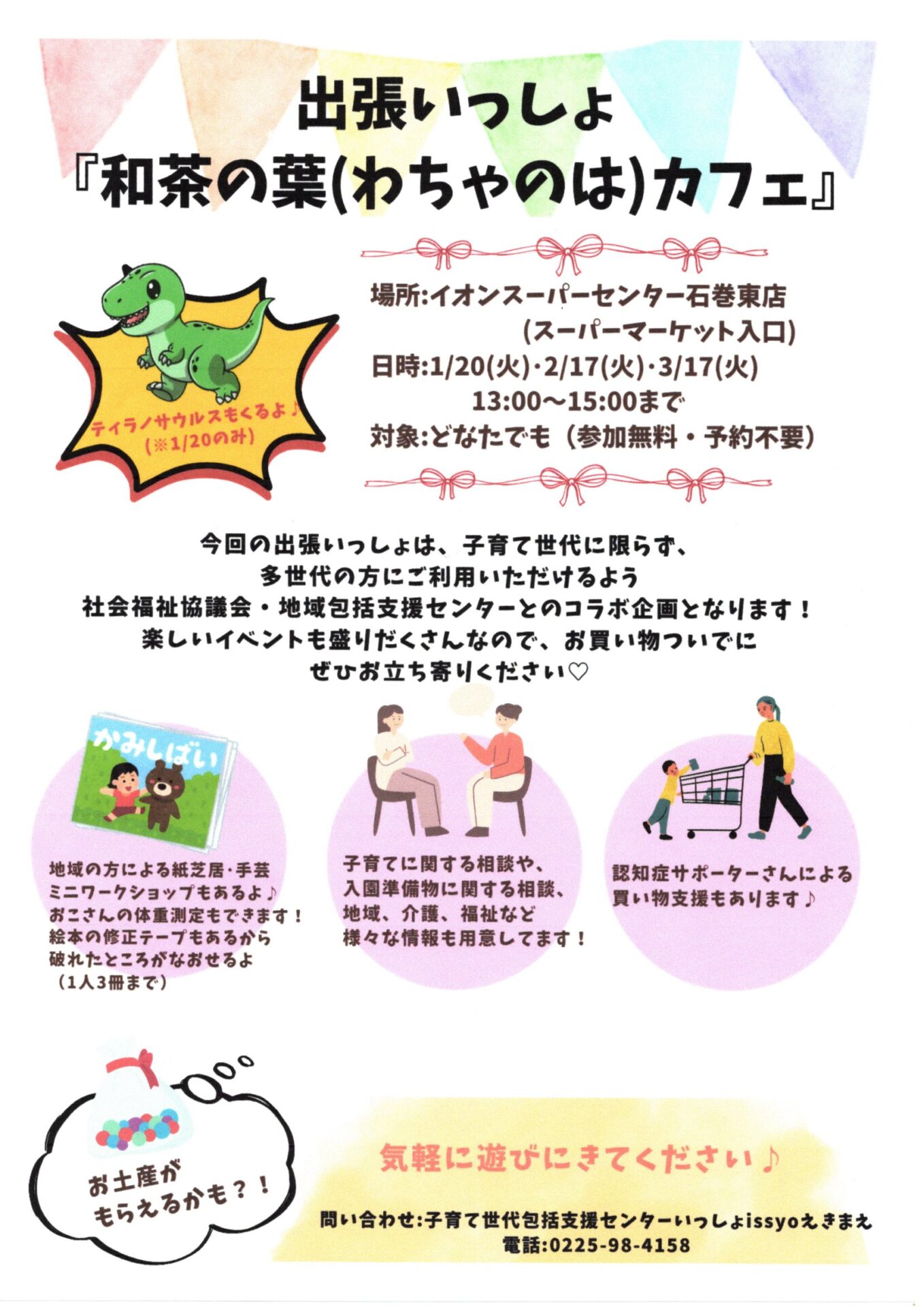 子育て相談窓口☆issyoへびた情報提供☆「出張いっしょ『和茶の葉(わちゃのは)カフェ』」のおしらせ子育て世代包括支援センターいっしょissyoえきまえより、『出張いっしょ「和茶の葉(わちゃのは)カフェ」』のお知らせが届きました! 今回は、社会福祉協議会・地域包括支援センターとのコラボ企画です☆子育て世代に限らずどなたでも、お買い物ついでにぜひお立ち寄り下さい♪破れた絵本がなおせたり、子育て・介護・福祉などの情報があったり、様々なイベントがあるようですよ♪ 場所:イオンスーパーセンター石巻東(スーパーマーケット入り口) 日時:1/20(火)・2/17(火)・3/17(火) 13:00~15:00 予約不要ですので、お気軽に遊びに行ってみて下さい~★ 詳細は下記チラシをご覧下さい↓↓↓