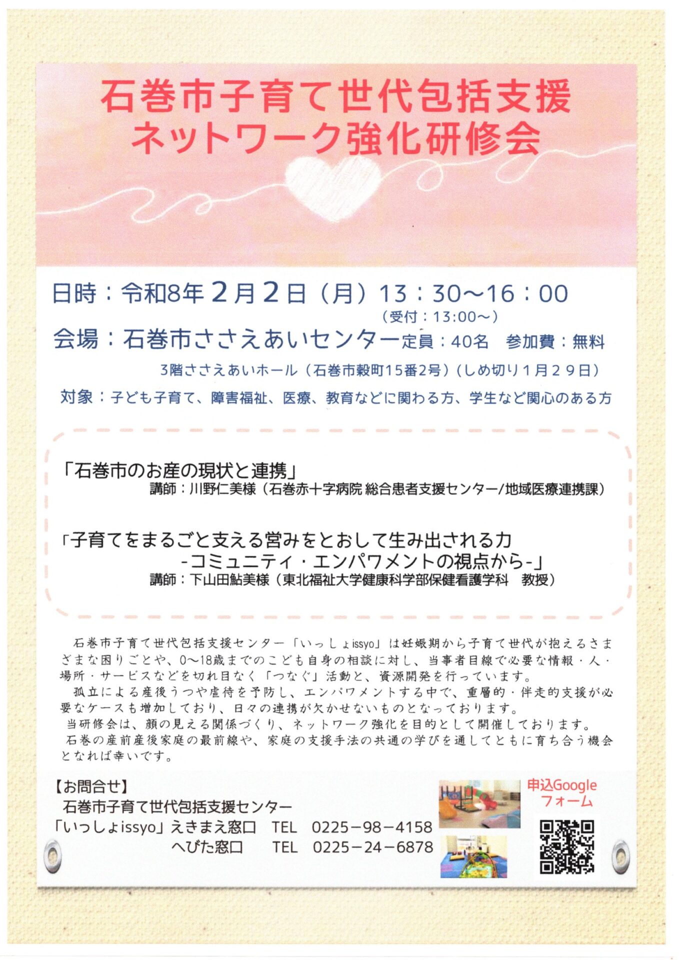 【いっしょissyo】石巻市子育て世代包括支援ネットワーク強化研修会の開催のお知らせ (ご案内)「いっしょissyo」えきまえ・へびたからのお知らせです。