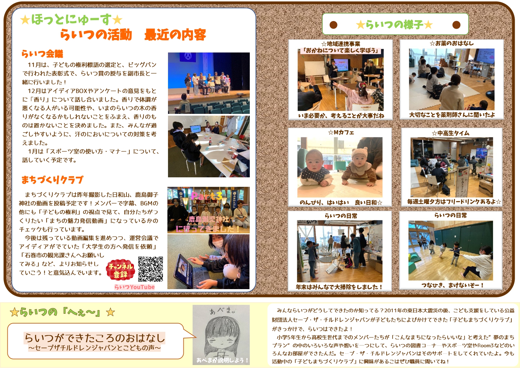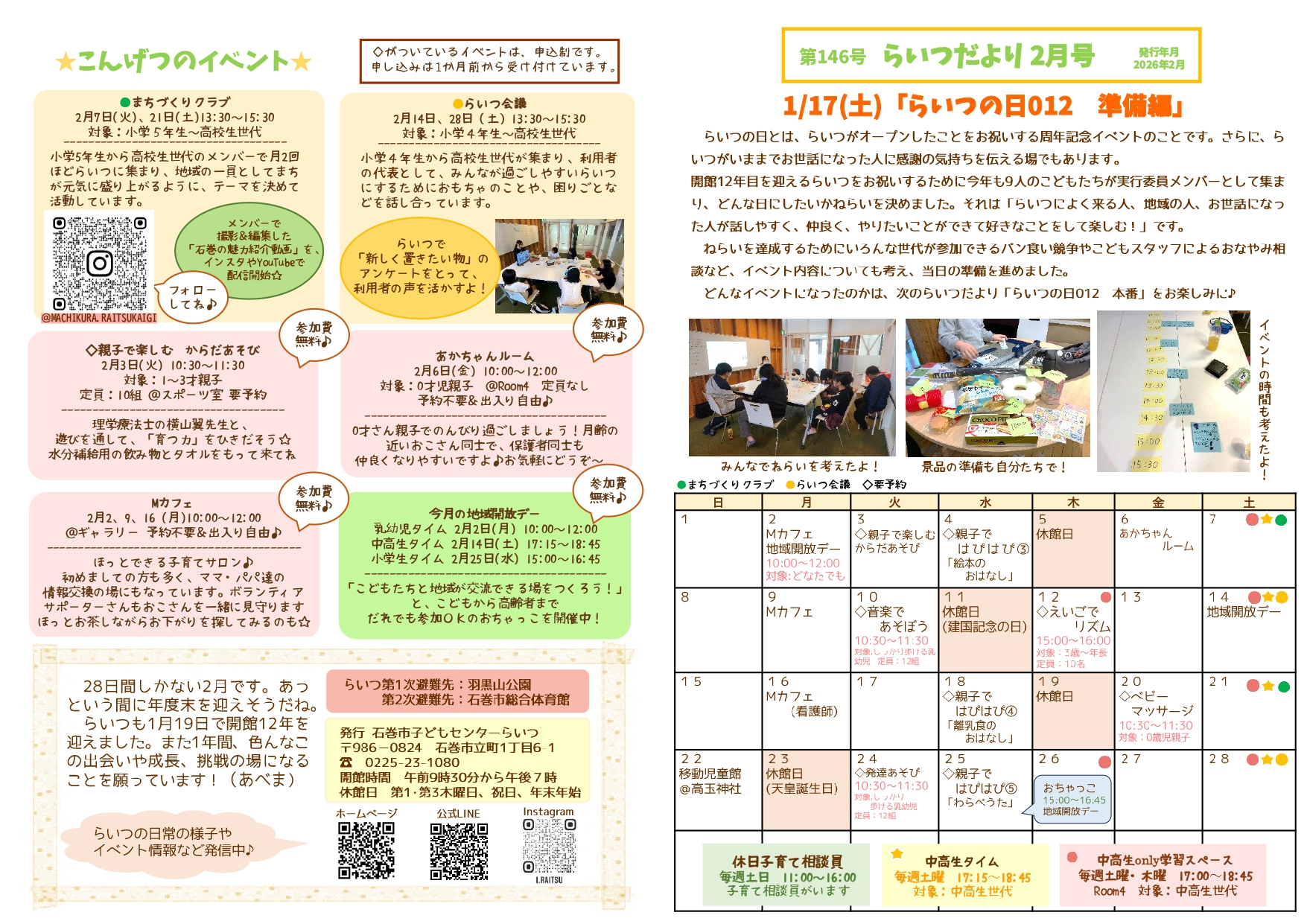 子育て相談窓口☆issyoへびた情報提供☆「らいつだより2月号」のおしらせ石巻市子どもセンターらいつより、『らいつだより2月号』のお知らせが届きました! 乳幼児向けのイベントも盛りだくさん♪小中高生もいつでも遊びにきてね★ らいつの様子も掲載しています! 気になる方はチラシをご覧になり、お気軽にご参加下さい(*^^*)
