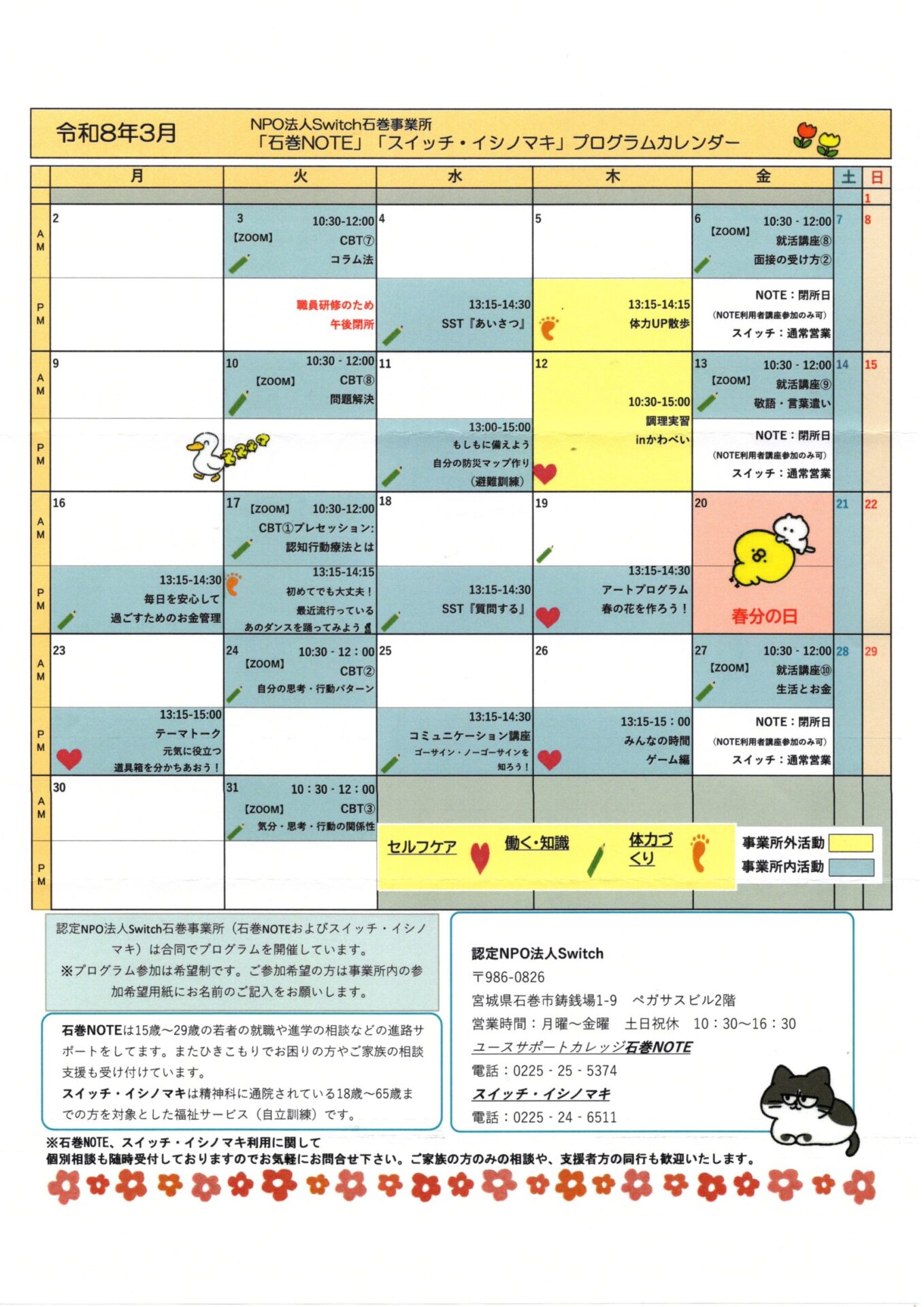 子育て相談窓口☆issyoへびた情報提供☆「石巻NOTE」「スイッチ・イシノマキ」からのおしらせ認定NPO法人Switch石巻事業所さんより、『3月の「石巻NOTE」「スイッチ・イシノマキ」プログラムカレンダー』 スイッチ・イシノマキ「事業所説明会」のお知らせが届きました♪ 石巻NOTE(若者の就職や進学サポート・ひきこもりの相談支援)、スイッチ・イシノマキ(精神科に通院されている方を対象にした福祉サービス)の合同でプログラムを開催しています。 事業所説明会では個別相談会も開催!支援者、ご家族のみの参加も可能です。