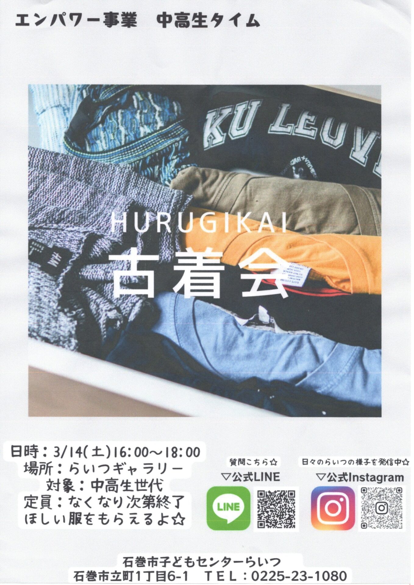 子育て相談窓口☆issyoへびた情報提供☆「中高生タイム 古着会」のおしらせ石巻市子どもセンターらいつより、 「中高生タイム 古着会」のおしらせです。 ★こちらは中高生向けイベントとなります★ 中高生がいらっしゃるご家族の皆さん、ぜひお子さんに「石巻市子どもセンターらいつ」をご紹介ください♪ 詳細は下記チラシをご確認ください(*^^*)