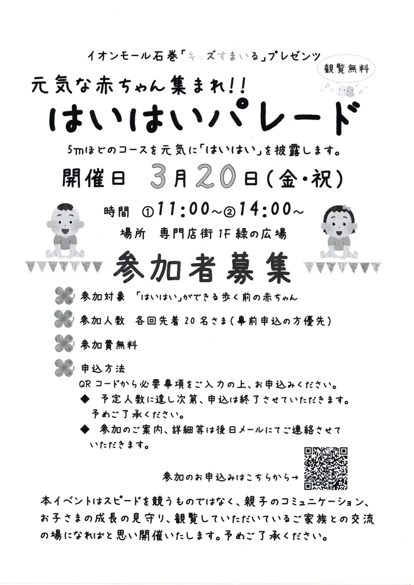 子育て相談窓口☆issyoへびた情報提供☆「はいはいパレード」のおしらせイオンモール石巻「キッズすまいる」プレゼンツ 「元気な赤ちゃん集まれ!!はいはいパレード」のおしらせです。 3月20日(金・祝)①11:00~ ②14:00~ 専門店街1F緑の広場にて、「はいはい」ができる歩く前の赤ちゃんが対象となります♪ 各回先着20名さま(事前申し込みの方優先となります) 詳細は下記チラシをご確認ください☆