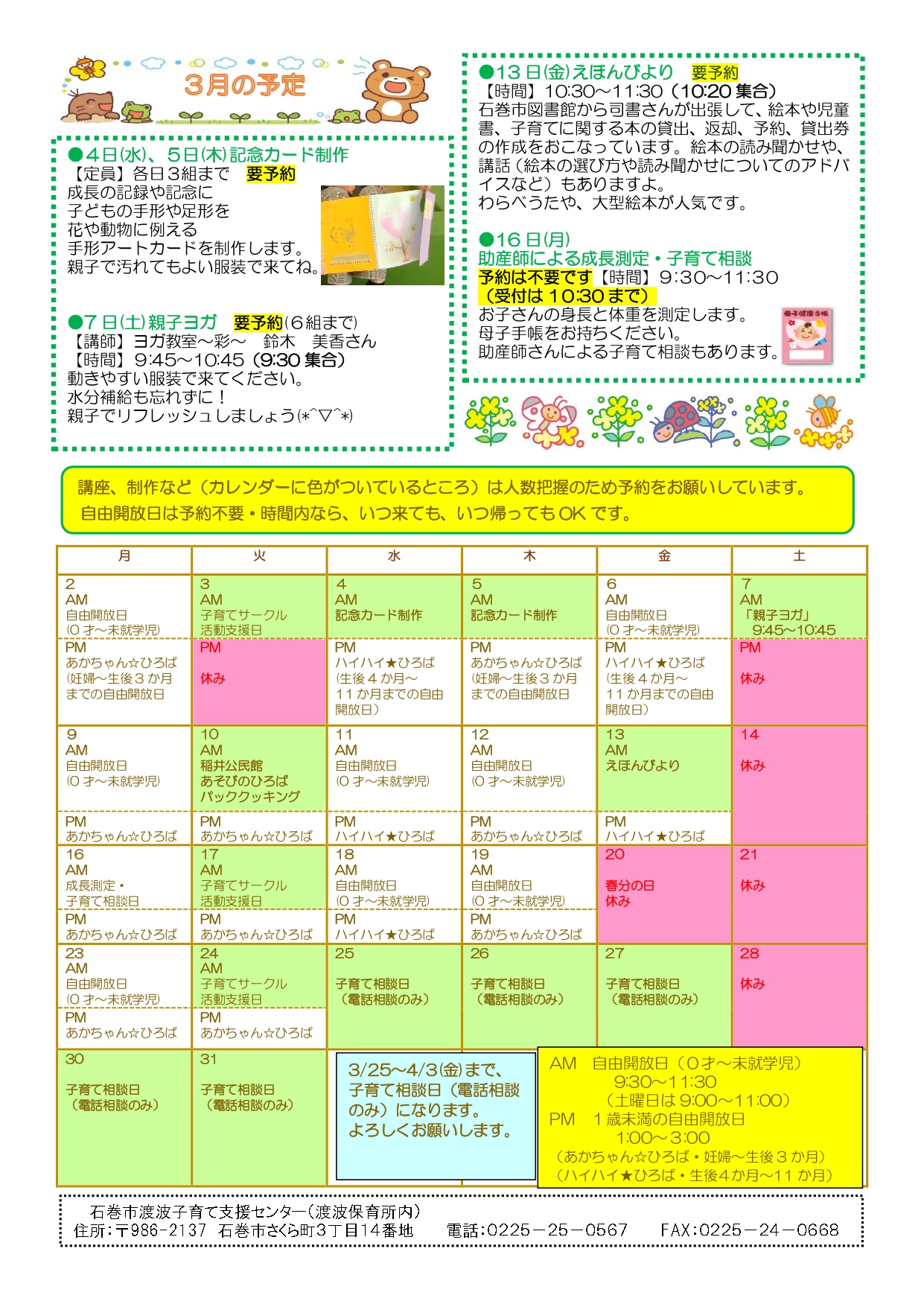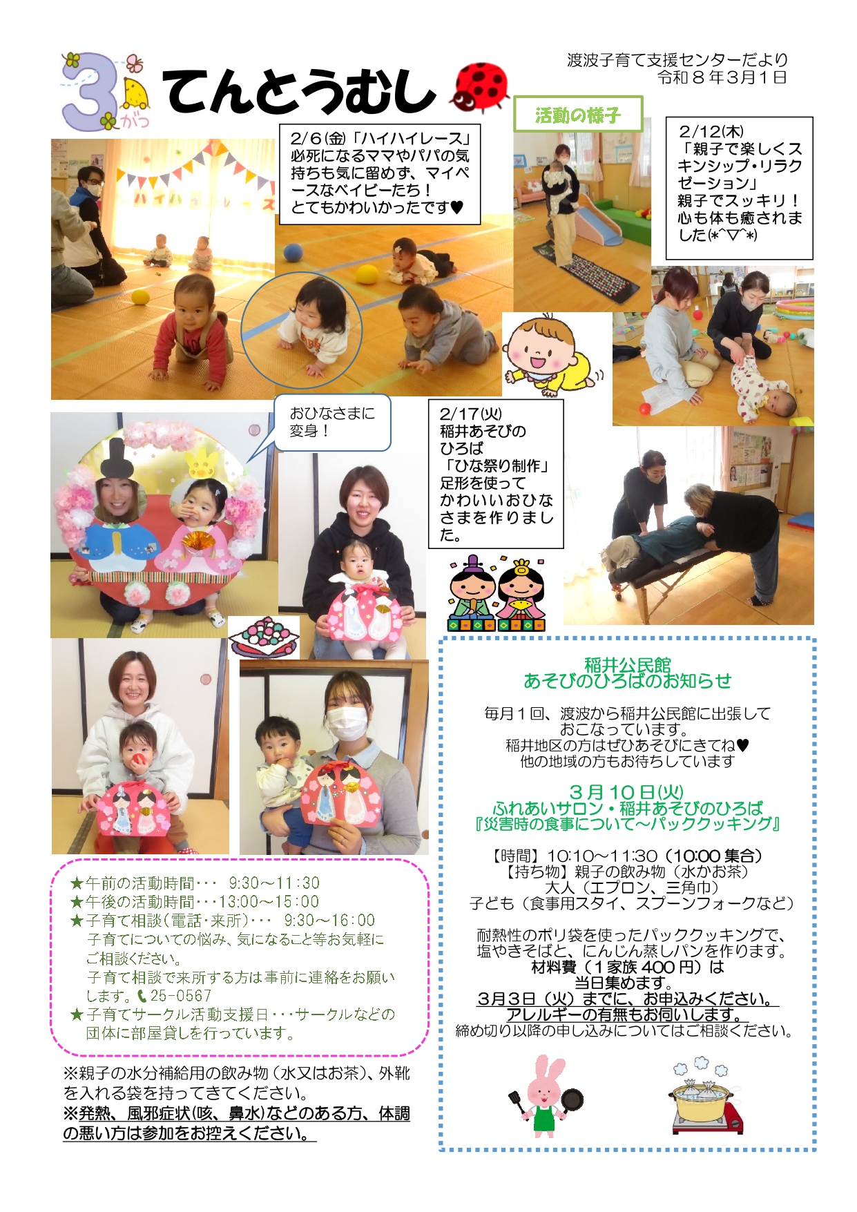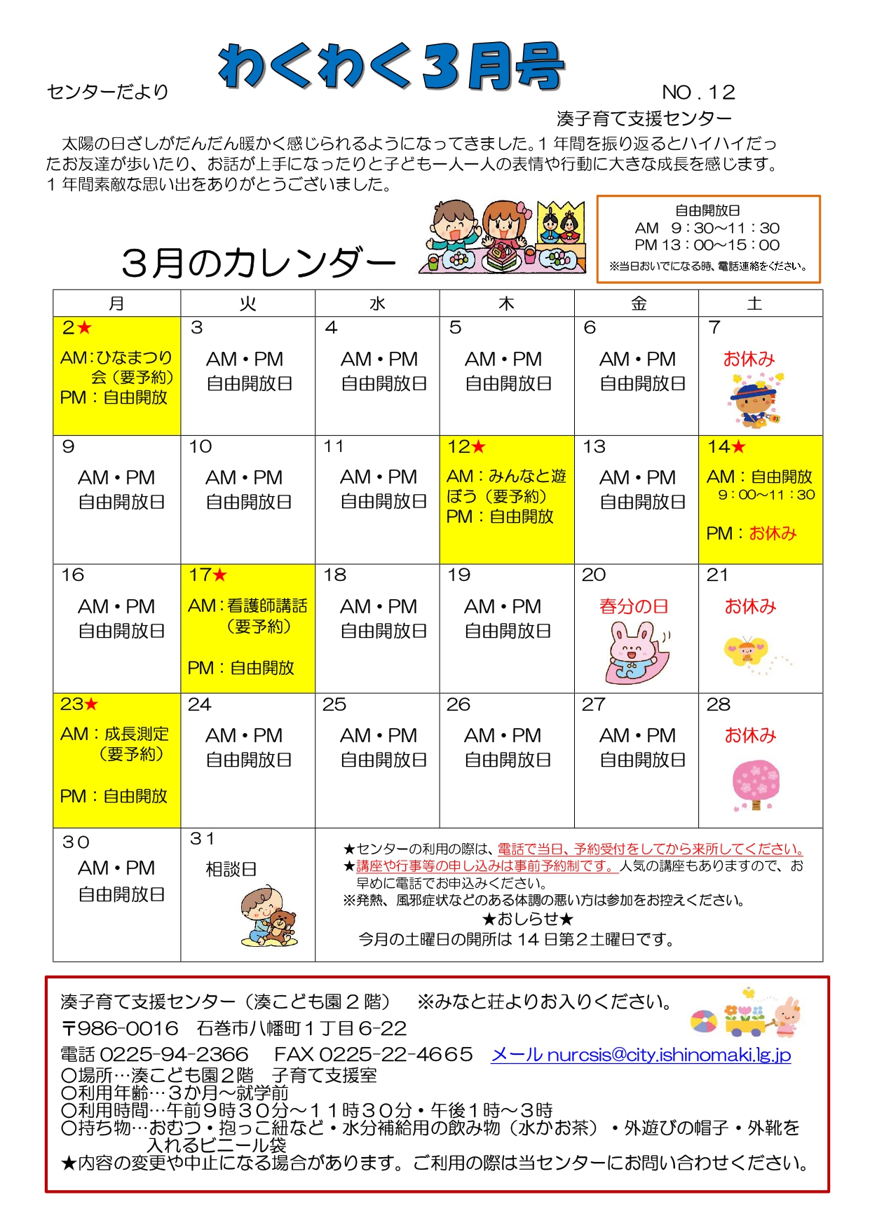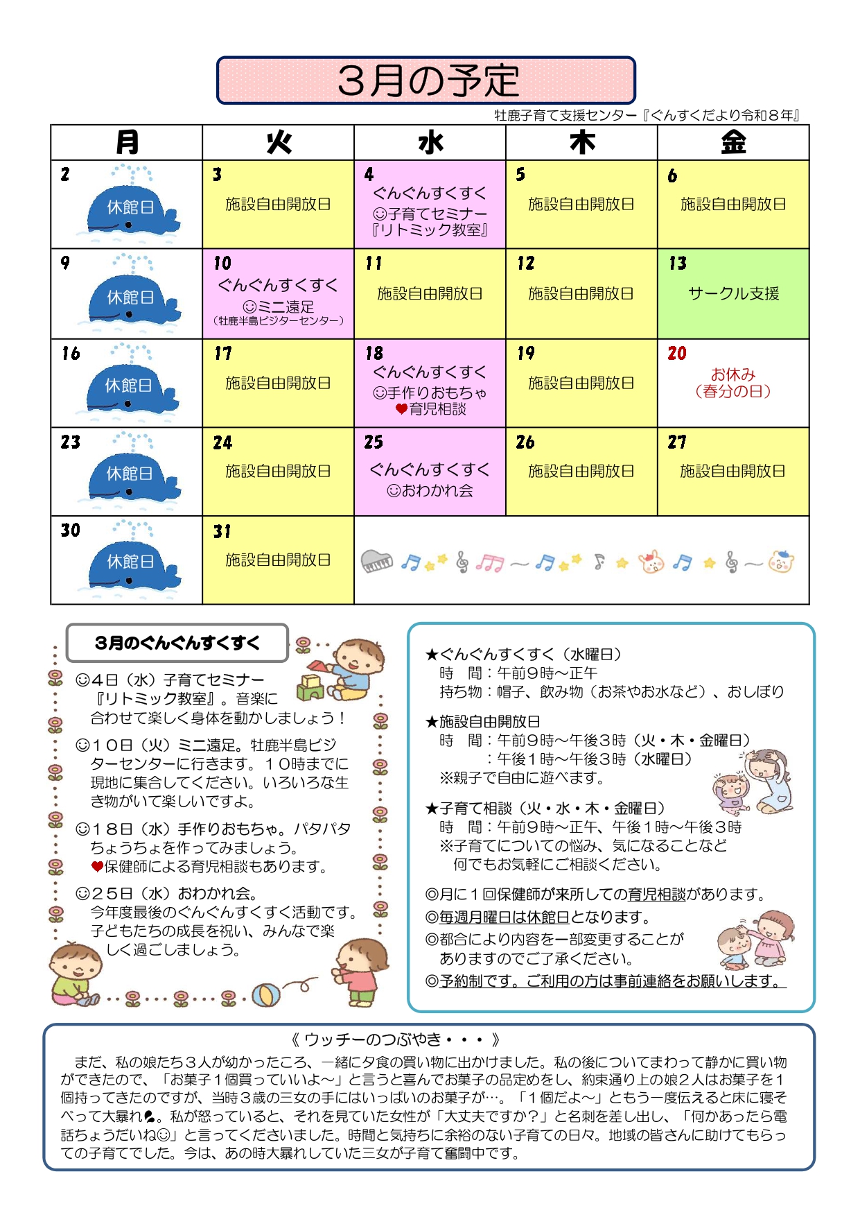 いっしょissyoへびた 2026.03.13 子育て相談窓口☆issyoへびた情報提供☆「子育て支援センター3月カレンダー(にじいろ・なかよし・釜・湊・渡波・牡鹿)」のおしらせ 子育て支援センターの3月のカレンダーが届いています♪ たのしいイベントが盛りだくさんです!ぜひご参加下さいね!! ★地域子育て支援拠点「にじいろひろば」★ ★なかよし保育園地域子育て支援センター★ ★釜子育て支援センター「あおぞら」★ ★湊子育て支援センター★ ★渡波子育て支援センター「てんとうむし」★ ★牡鹿子育て支援センター「ぐんぐんすくすく」★ 前の記事次の記事一覧へ戻る