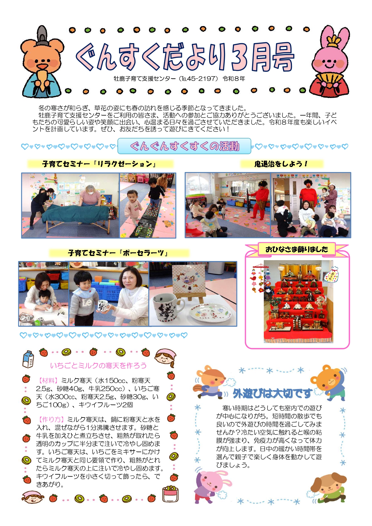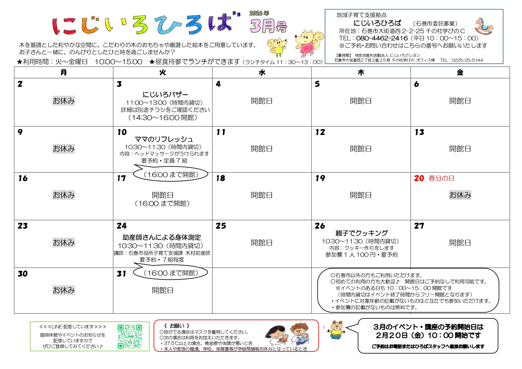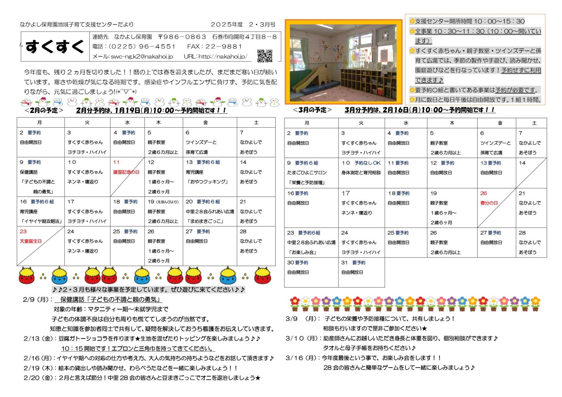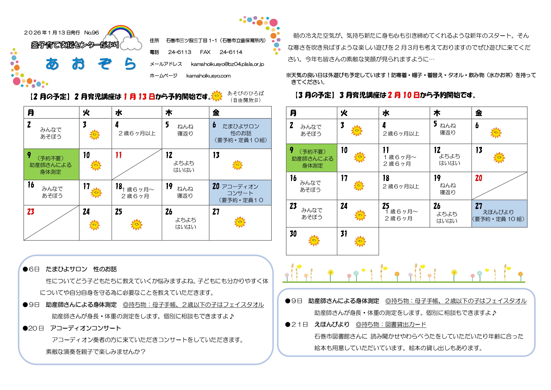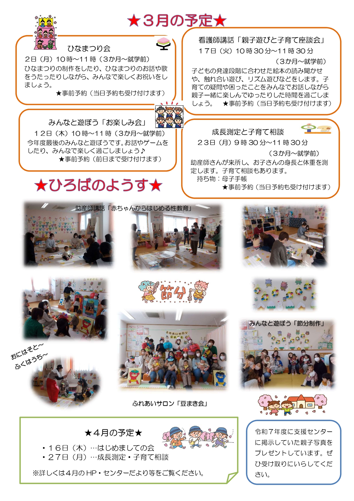 いっしょissyoへびた 2026.03.13 子育て相談窓口☆issyoへびた情報提供☆「子育て支援センター3月カレンダー(にじいろ・なかよし・釜・湊・渡波・牡鹿)」のおしらせ 子育て支援センターの3月のカレンダーが届いています♪ たのしいイベントが盛りだくさんです!ぜひご参加下さいね!! ★地域子育て支援拠点「にじいろひろば」★ ★なかよし保育園地域子育て支援センター★ ★釜子育て支援センター「あおぞら」★ ★湊子育て支援センター★ ★渡波子育て支援センター「てんとうむし」★ ★牡鹿子育て支援センター「ぐんぐんすくすく」★ 前の記事次の記事一覧へ戻る