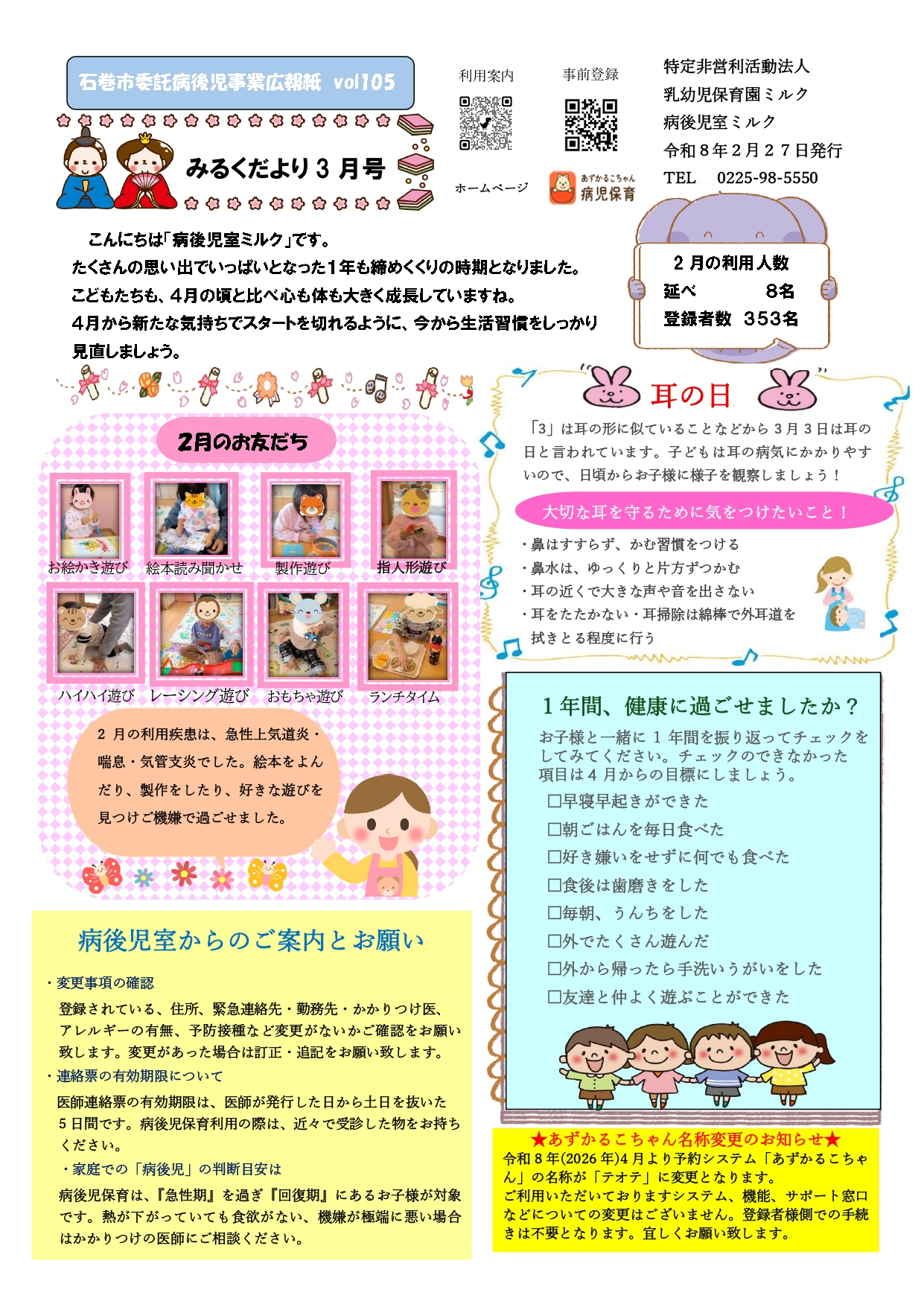子育て相談窓口☆issyoへびた情報提供☆「みるくだより 3月号」のおしらせ乳幼児保育園ミルク・病後児室ミルクさんより、『みるくだより3月号』が届きました! ★『病後児室ミルク』は、病気の回復期(集団の中で過ごすには体力が戻っていない時期)を、お子さんのペースに合わせて過ごせる場所です(^^) “あずかるこちゃん”に事前登録をしておくと、いざという時のお守りにもなりますね!ぜひ、QRコードからご登録くださいね。 ※R8年度4月からは、“あずかるこちゃん”の名称が“テオテ”に変更になります。詳細は下記チラシをご覧ください!