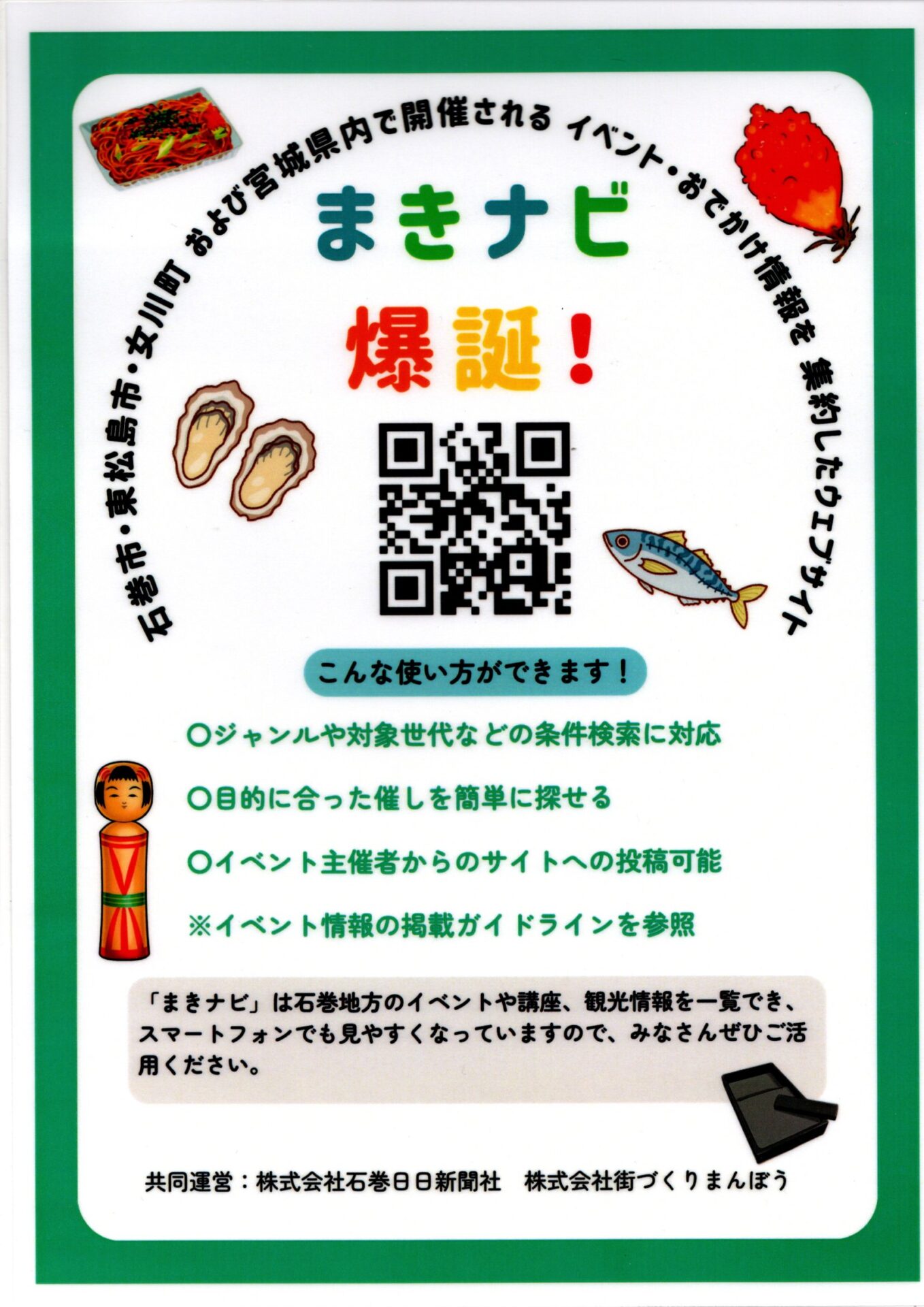 子育て相談窓口☆issyoへびた情報提供☆「まきナビ」のおしらせ株式会社石巻日日新聞社・株式会社街づくりまんぼうさんより「まきナビ爆誕!」のおしらせが届きました。 石巻市・東松島市・女川町および宮城県内で開催されるイベント・おでかけ情報を集約したウェブサイトができました☆ 条件検索ができるので目的に合った催し物を簡単に探せます(*^_^*) 是非ご活用ください!