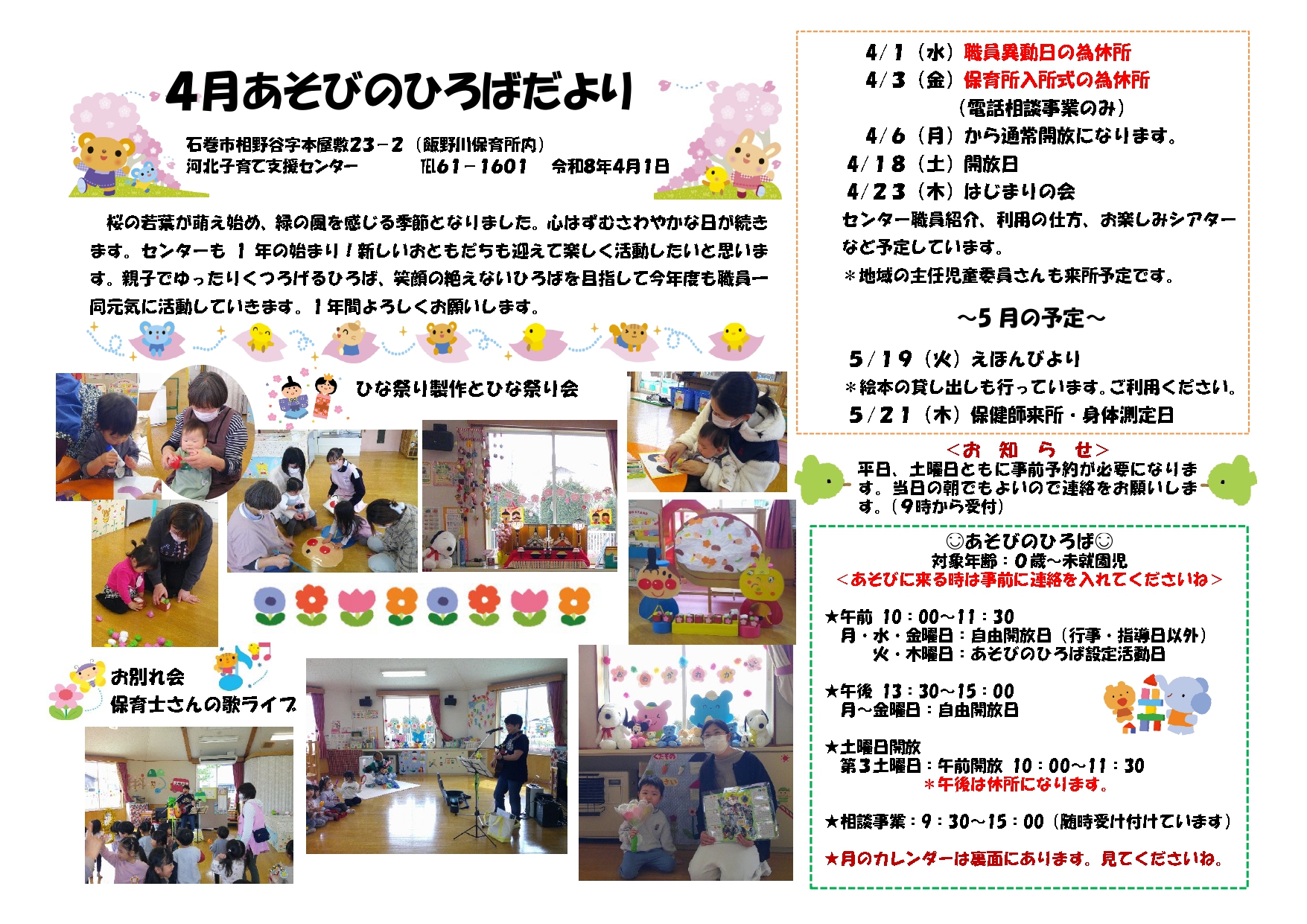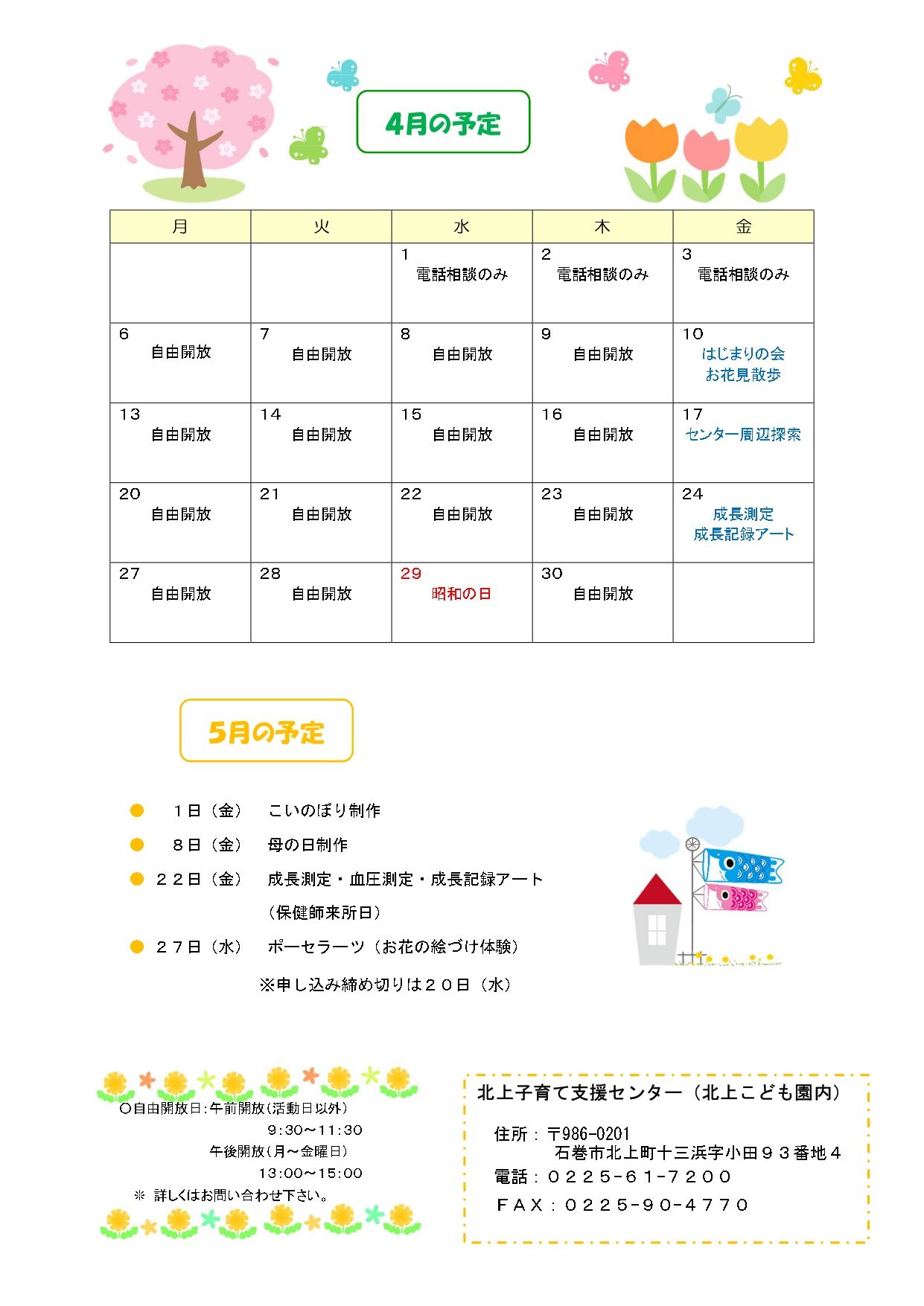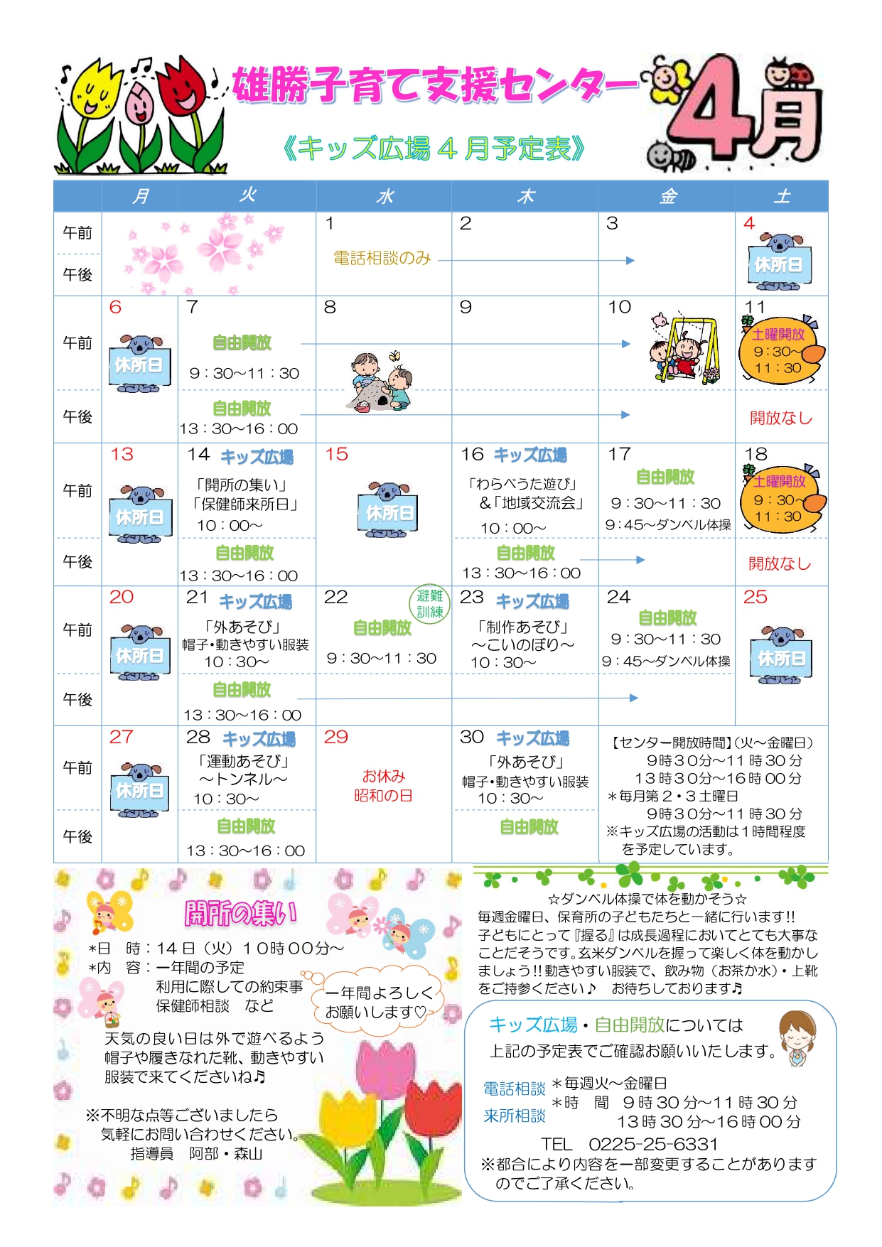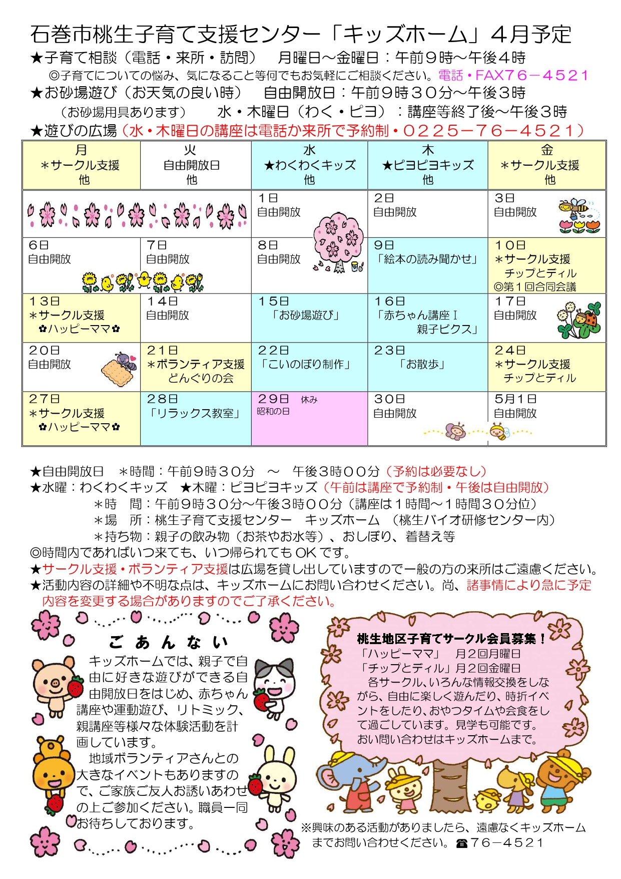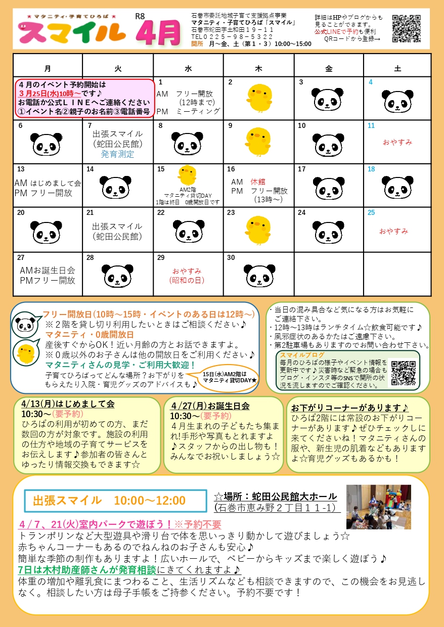 子育て相談窓口☆issyoへびた情報提供☆「子育て支援センター4月カレンダー(スマイル・河南・桃生・河北・北上・雄勝)」のおしらせ子育てひろば・子育て支援センターの4月のカレンダーが届きました♪ たのしいイベントも盛りだくさんです!ぜひご参加くださいね!! ★子育てひろばスマイル★