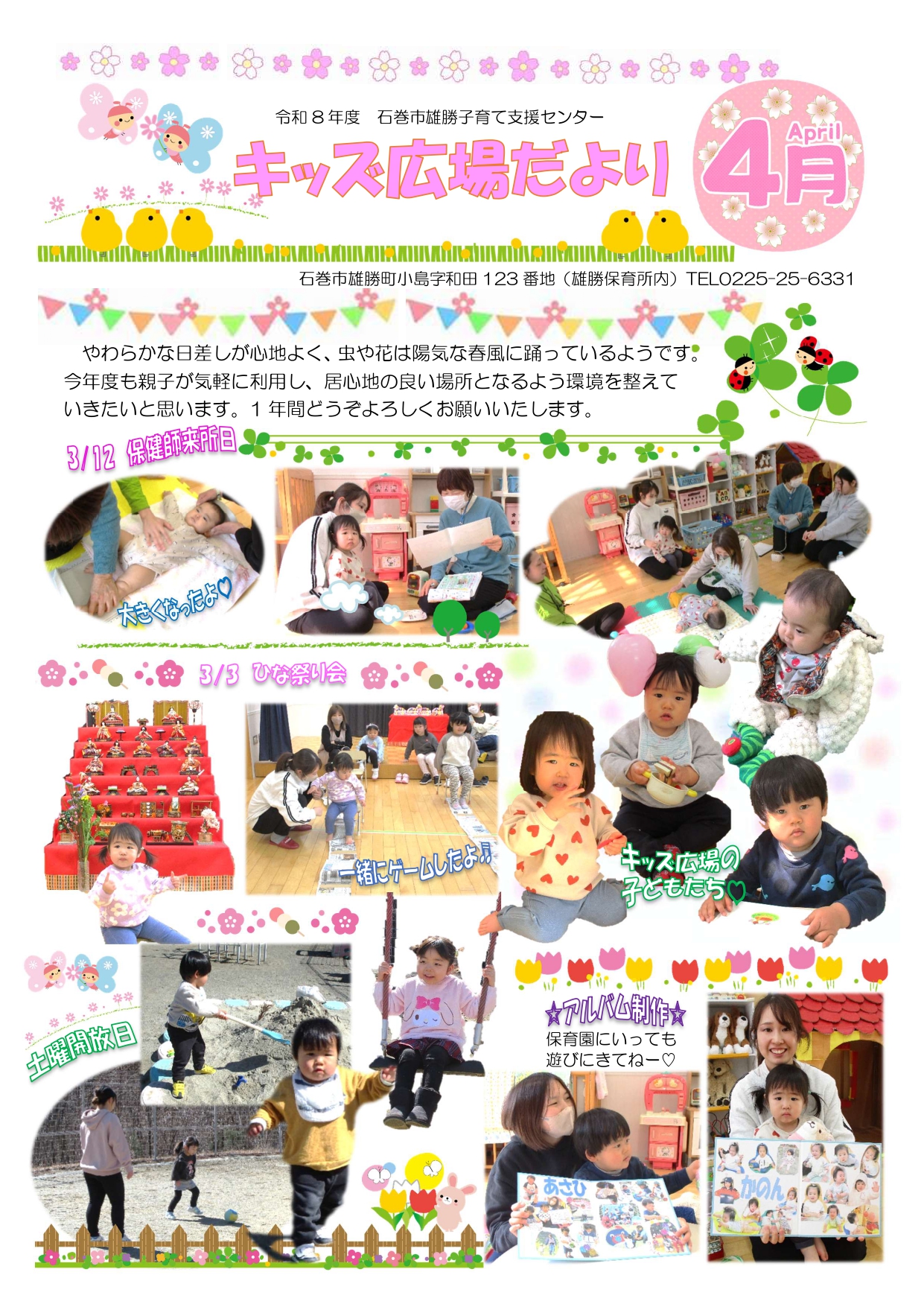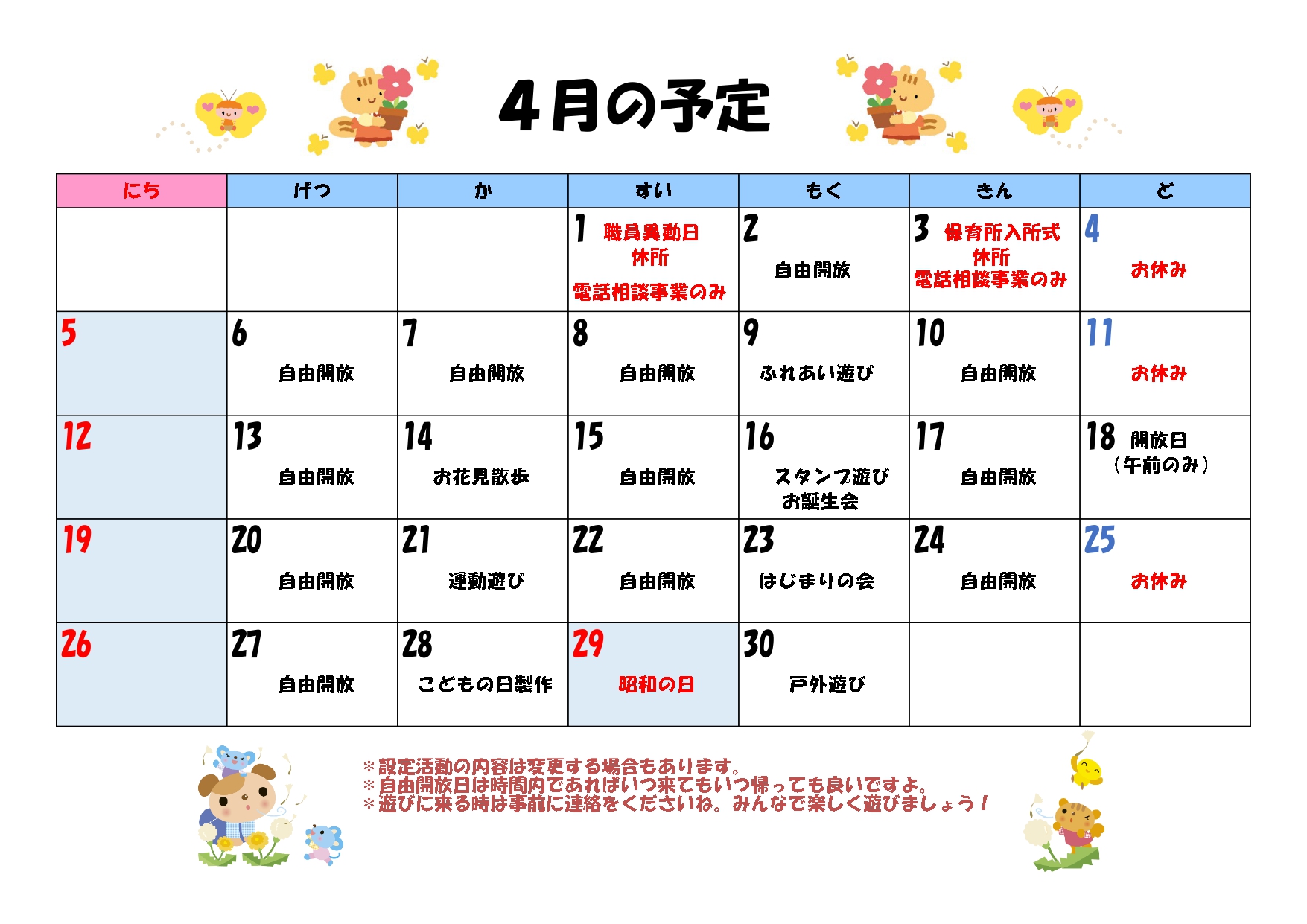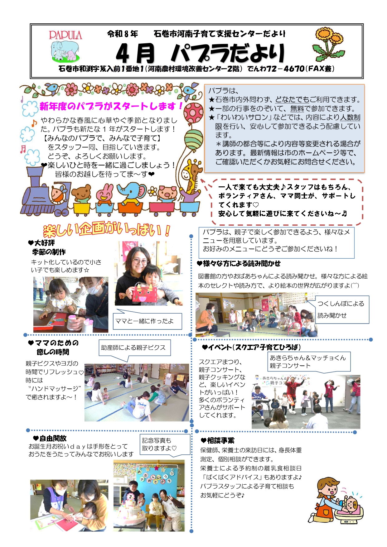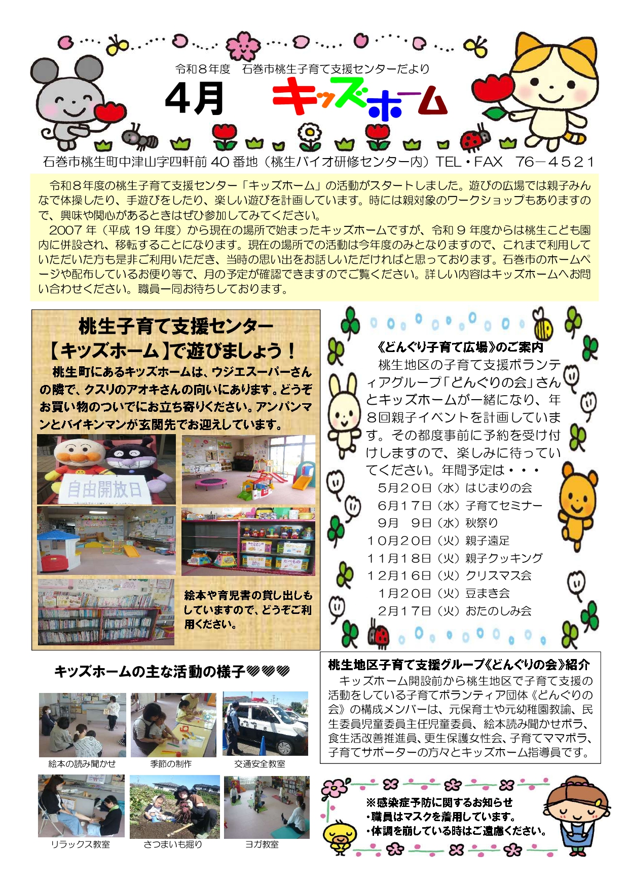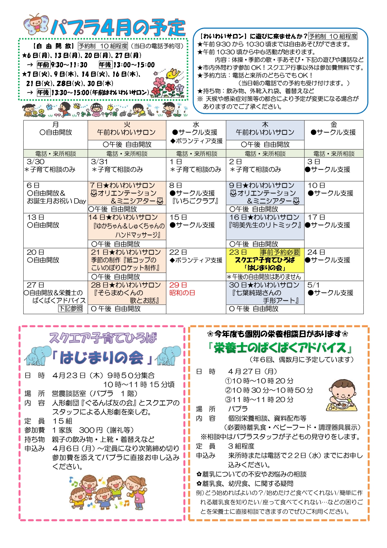 子育て相談窓口☆issyoへびた情報提供☆「子育て支援センター4月カレンダー(スマイル・河南・桃生・河北・北上・雄勝)」のおしらせ子育てひろば・子育て支援センターの4月のカレンダーが届きました♪ たのしいイベントも盛りだくさんです!ぜひご参加くださいね!! ★子育てひろばスマイル★