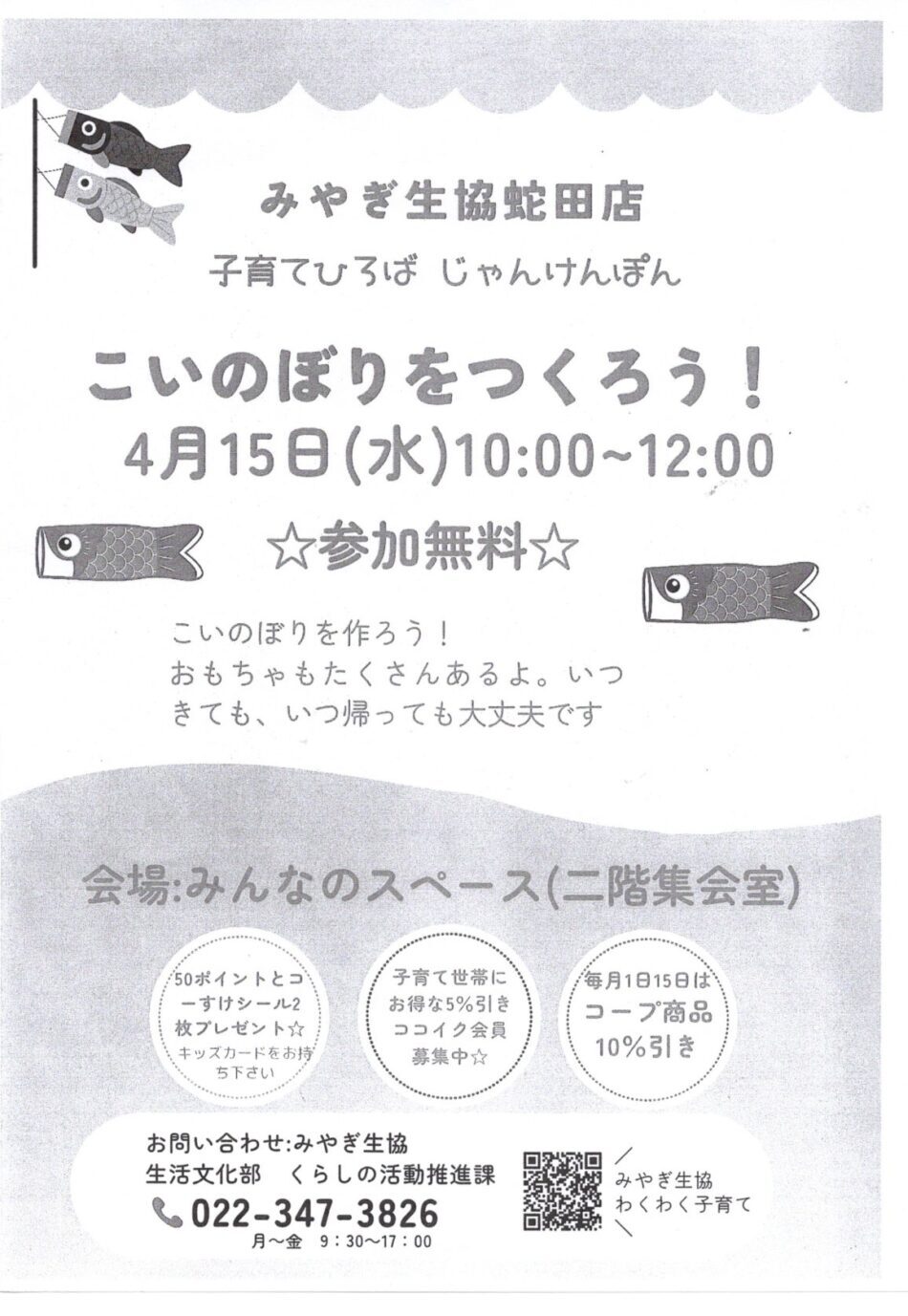 子育て相談窓口☆issyoへびた情報提供☆「こいのぼりをつくろう!」のおしらせみやぎ生協蛇田店より『子育てひろば じゃんけんぽん こいのぼりをつくろう!』のお知らせが届きました! 4月15日(水)10:00~12:00 開催 ★出入り自由です★ お買い物がてら、ぜひ立ち寄ってみてくださいね♪