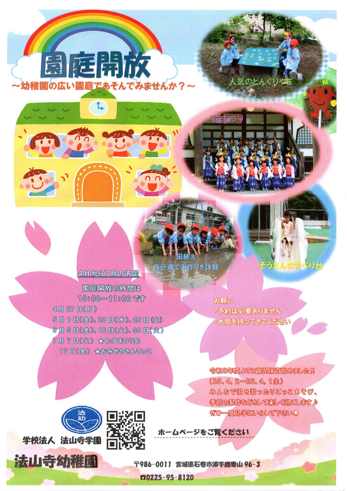 子育て相談窓口☆issyoへびた情報提供☆「法山寺幼稚園の園庭開放」のおしらせ法山寺幼稚園さんより「園庭開放」のお知らせが届きました! 園庭開放時間10時から11時 予約不要 園見学にもなるので気になる方はチラシをチェックしてくださいね(*^^*)
