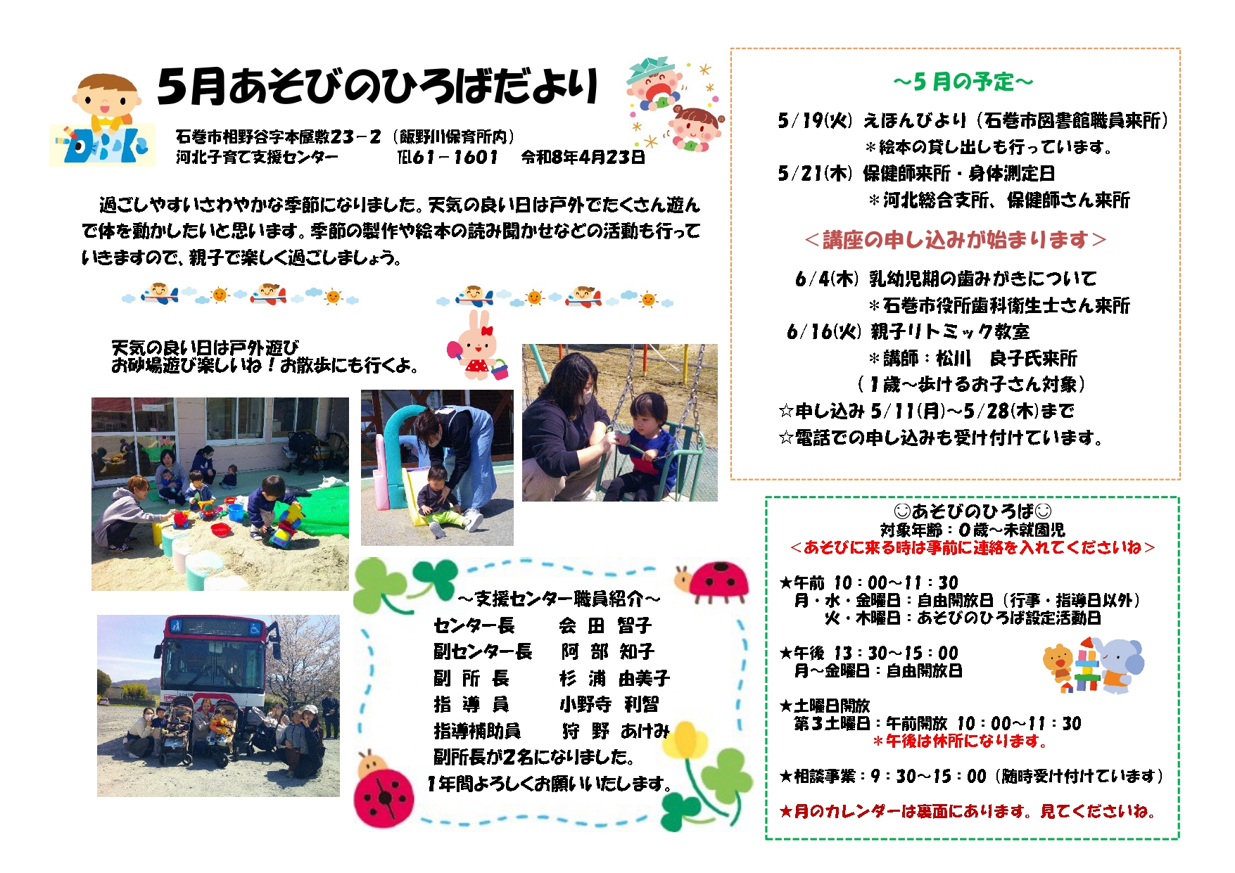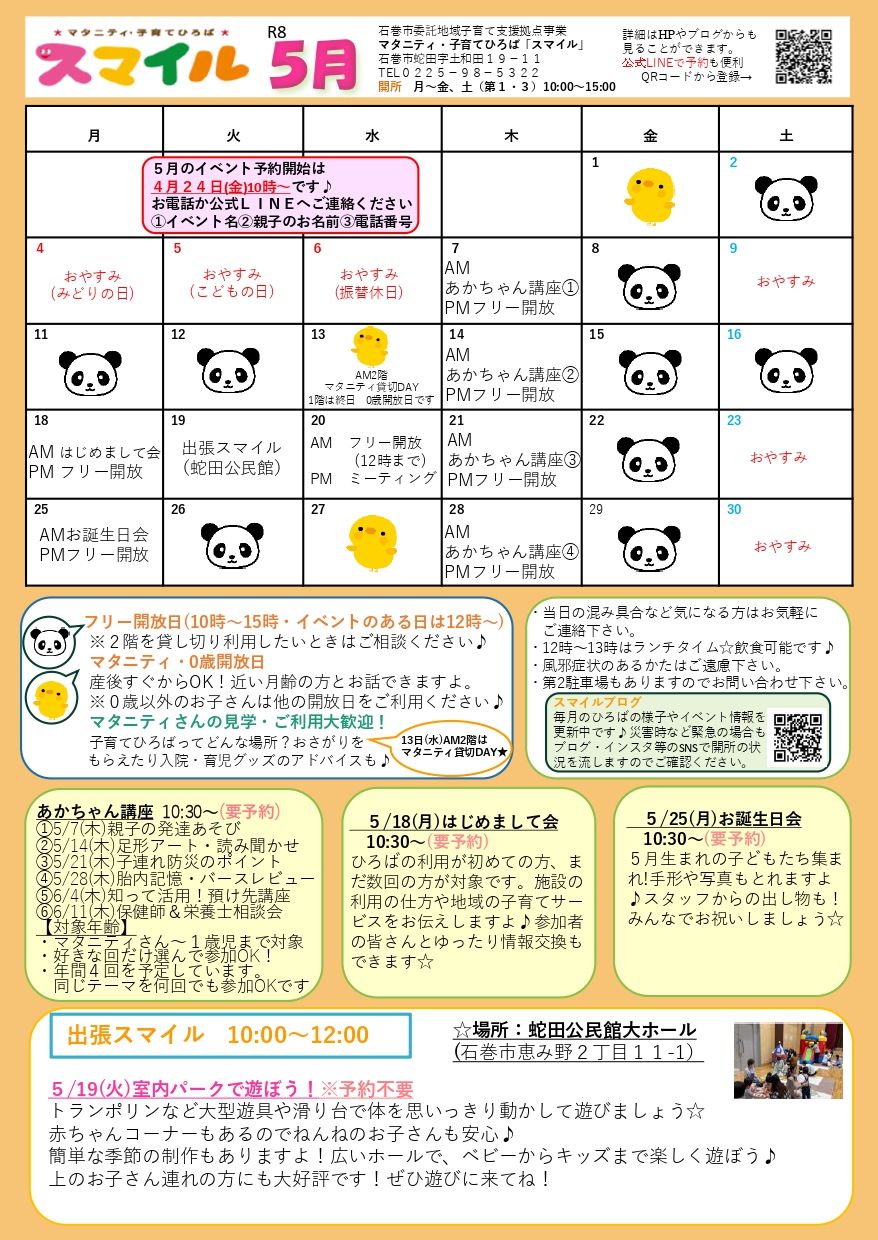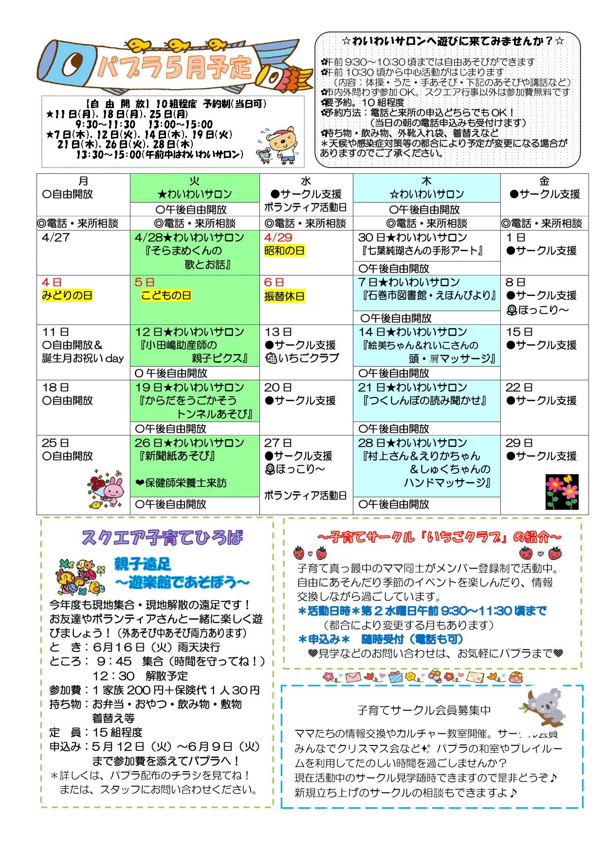 子育て相談窓口☆issyoへびた情報提供☆「子育て支援センター5月カレンダー(スマイル・河南・桃生・河北・北上・雄勝)」のおしらせ子育てひろば・子育て支援センターの5月のカレンダーが届きました♪ たのしいイベントも盛りだくさんです!ぜひご参加くださいね!! ★子育てひろばスマイル★