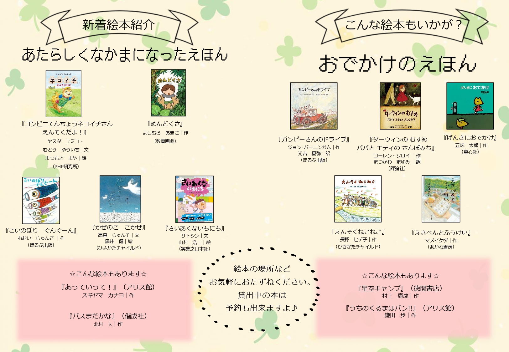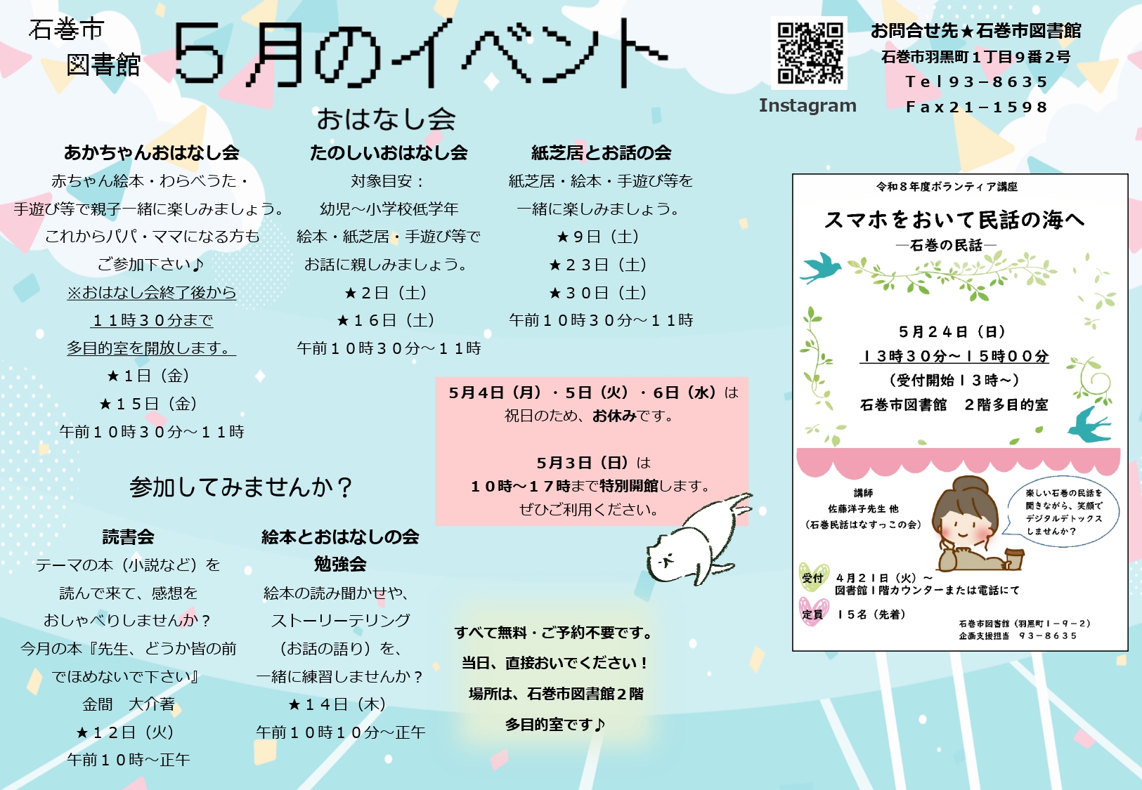 子育て相談窓口☆issyoへびた情報提供☆「図書館だより5月号」のおしらせ石巻市図書館より、5月のお便りが届きました♪ 毎月新しい絵本が仲間入りしています(^^)今月は民話のイベントもあります★ おはなし会も開催★ぜひご参加下さいね!