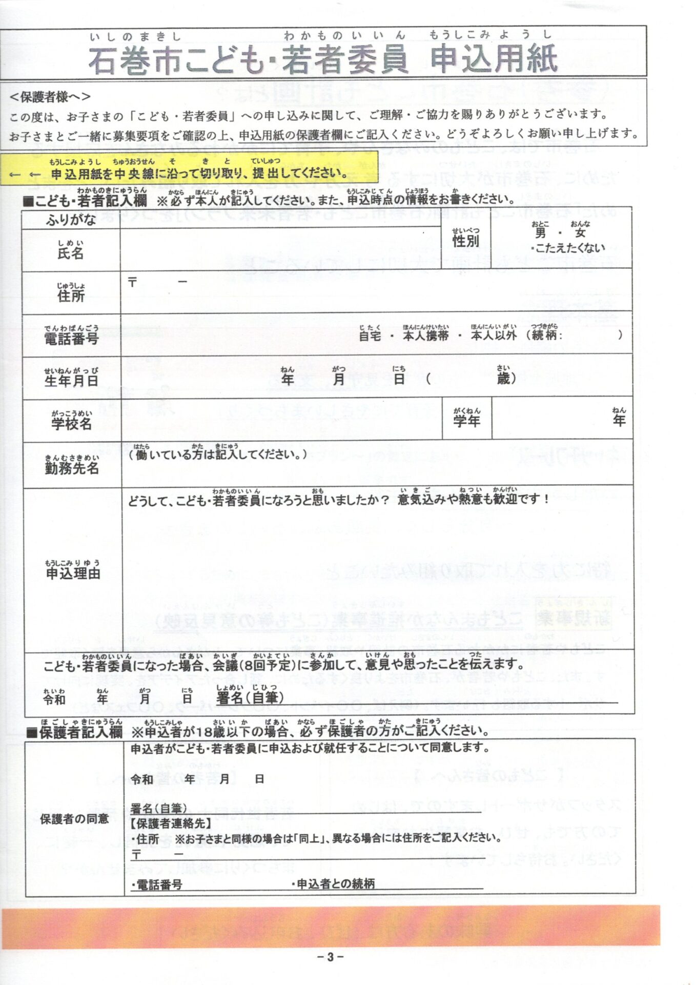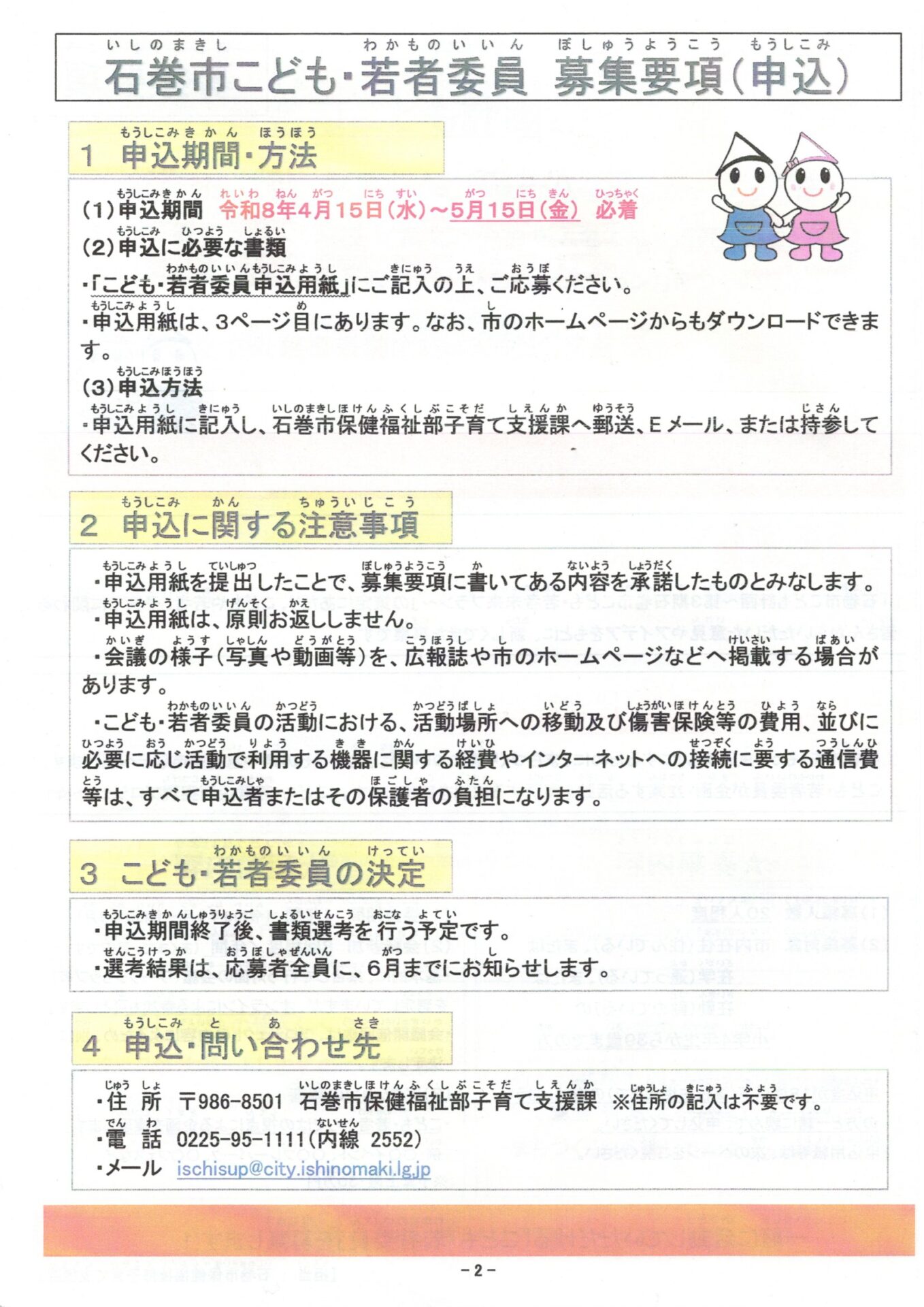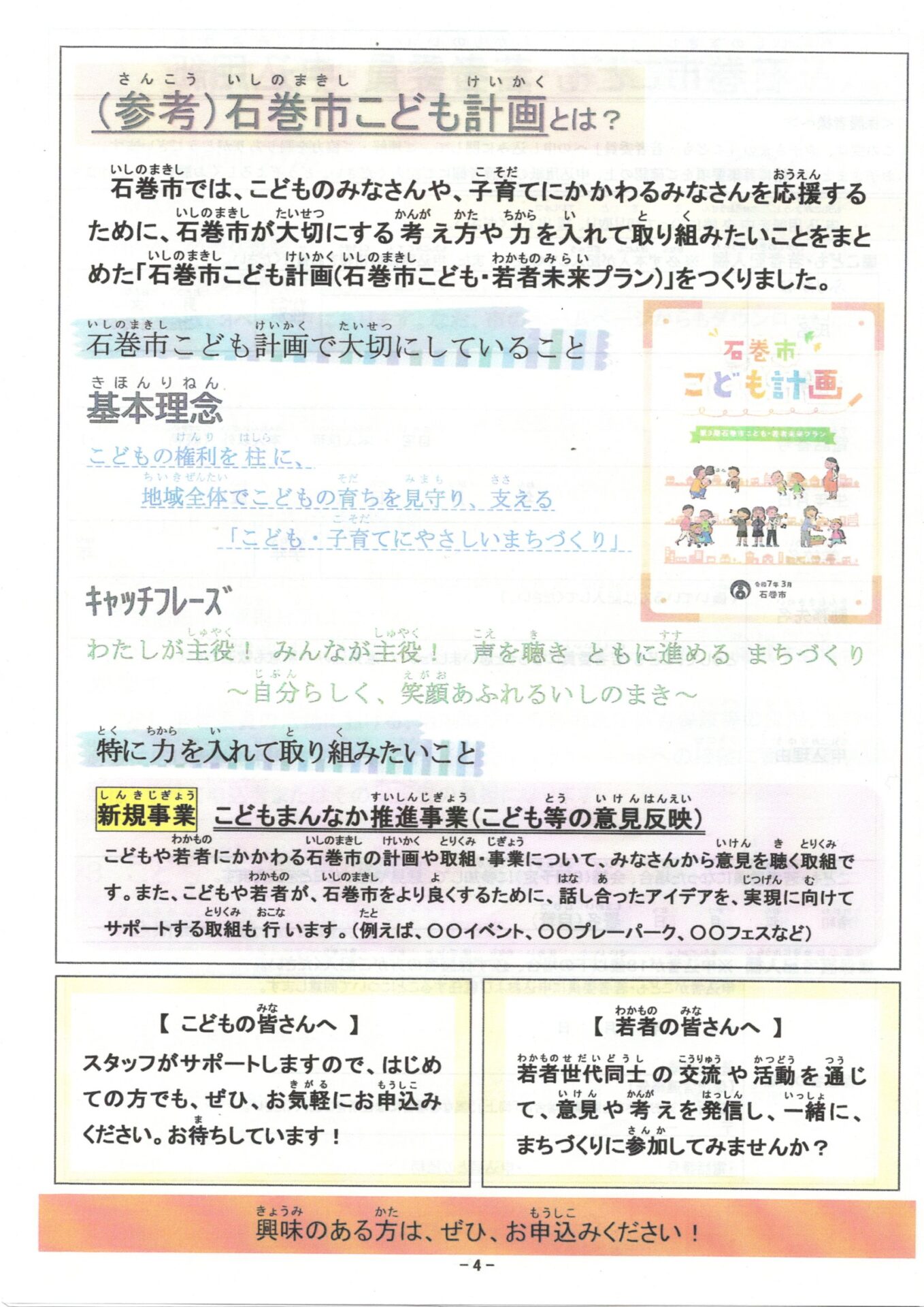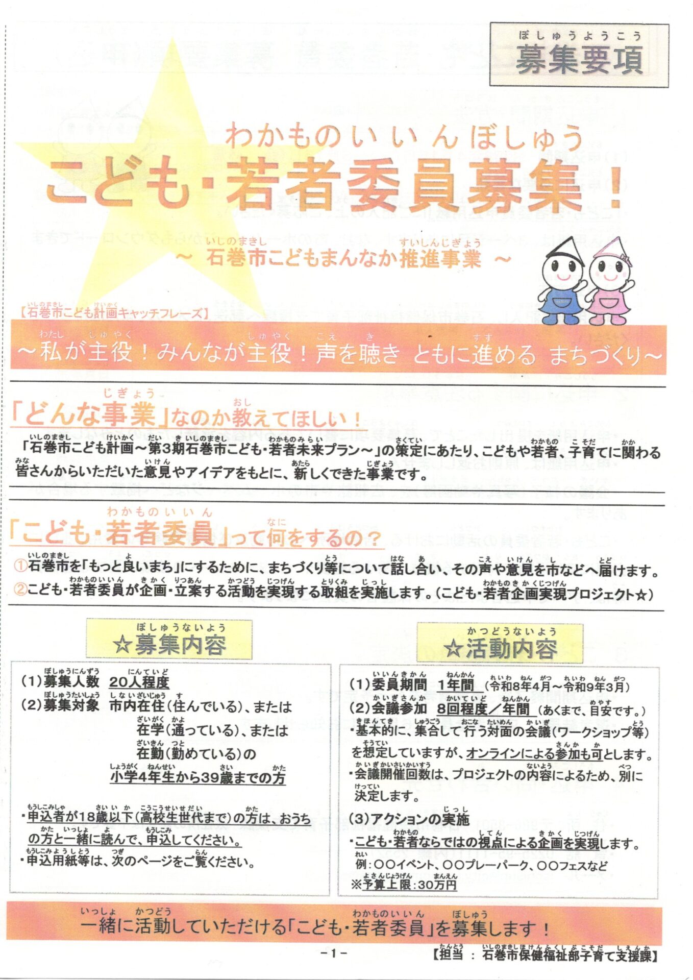 子育て相談窓口☆issyoへびた情報提供☆「こども・若者委員募集!」のおしらせ石巻市保健福祉部子育て支援課より、『こども・若者委員募集!~石巻市こどもまんなか推進事業~』のお知らせが届きました。 石巻市を「もっと良いまち」にするために、一緒に活動してみませんか? 詳細は、下記チラシをご覧ください★ 申込用紙は、石巻市のホームページからダウンロードすることができます。また、いっしょへびたにも申込用紙がありますので、気になった方、参加したい方は、お気軽にお声がけ下さい♪