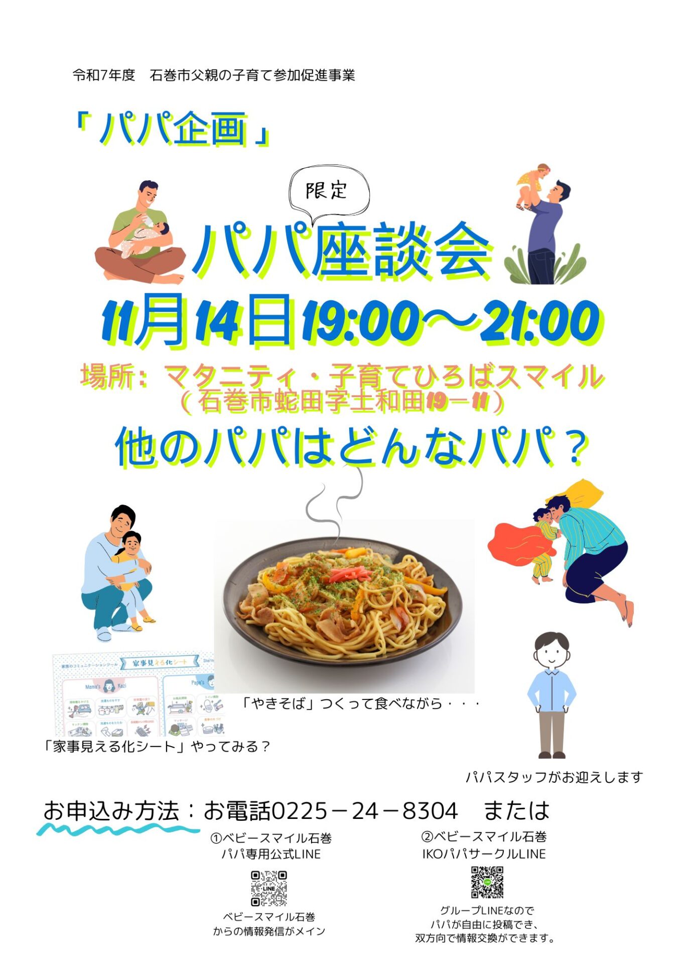 11月14日パパ企画 今回は「パパ座談会」(石巻市父親の子育て参加促進事業)ベビースマイル石巻では石巻市より委託をうけて「父親の子育て参加促進事業」を実施しています。 ご予約お待ちしております~^^ 予約は0225-24-8304 または ベビスマ公式LINE https://lin.ee/RryZGH2 より。